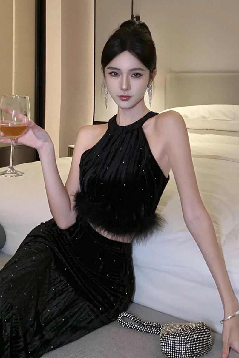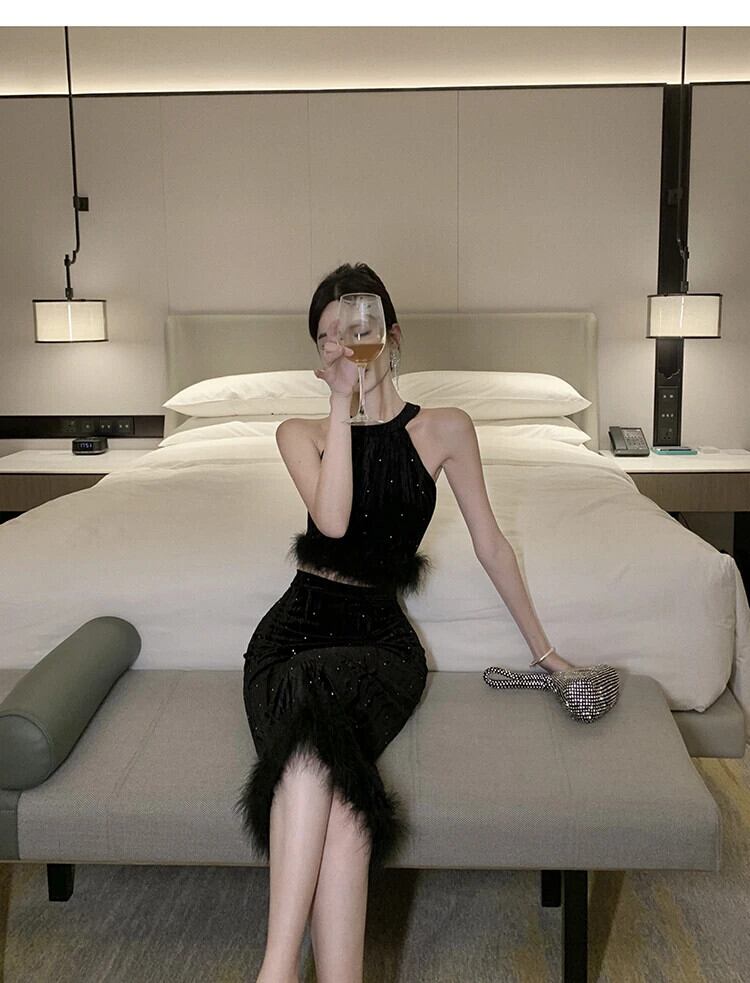 甘いホットガールスーツ秋/冬ホルターネックショートファートップウエストラップヒップロングスカートツーピースセット 大人ガーリー スウィート キュート カジュアル オータム 秋物 ウィンター 冬物