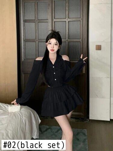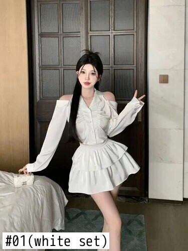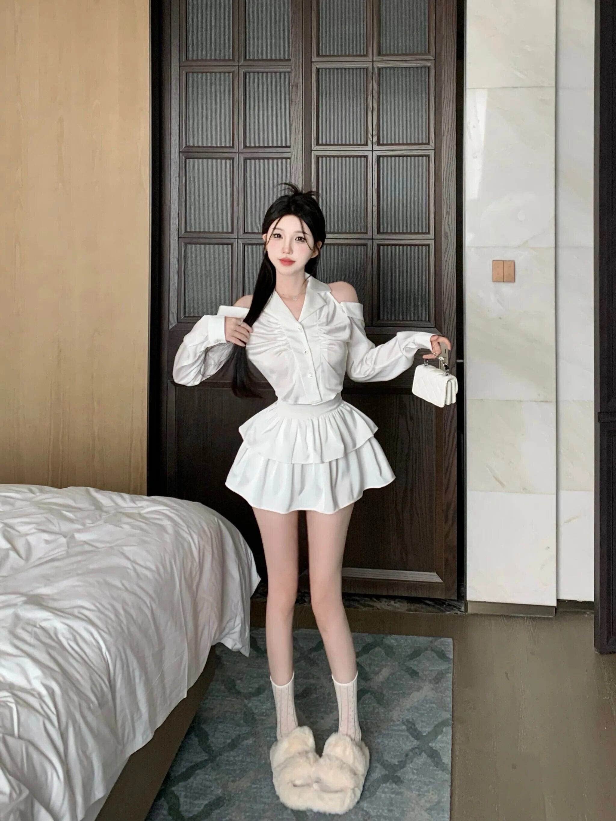 甘いホットスーツ秋オフショルダースリムフィットシャツウエストケーキふわふわミニスカートツーピースセット 大人ガーリー スウィート キュート カジュアル オータム 秋物