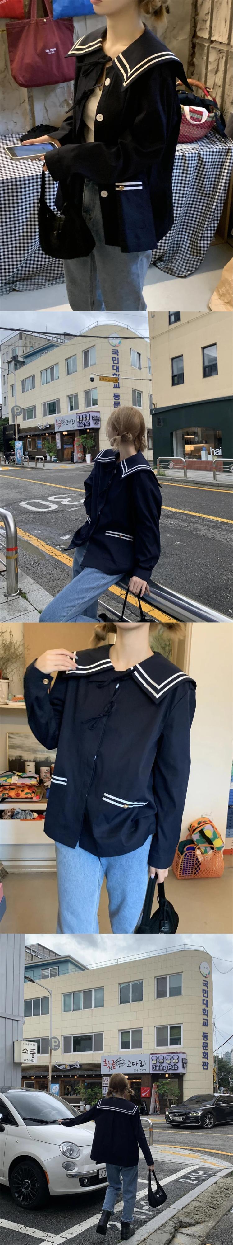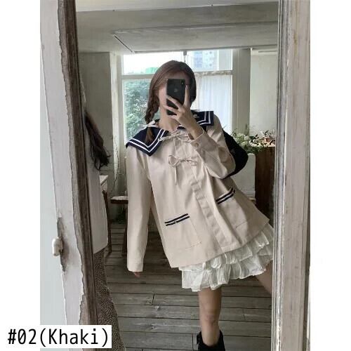 甘いホットガールズプレッピースタイルセーラーカラーコート秋ミッドレングスボウタイ長袖シャツトップ ロング リボン 大人ガーリー スウィート キュート カジュアル オータム 秋物