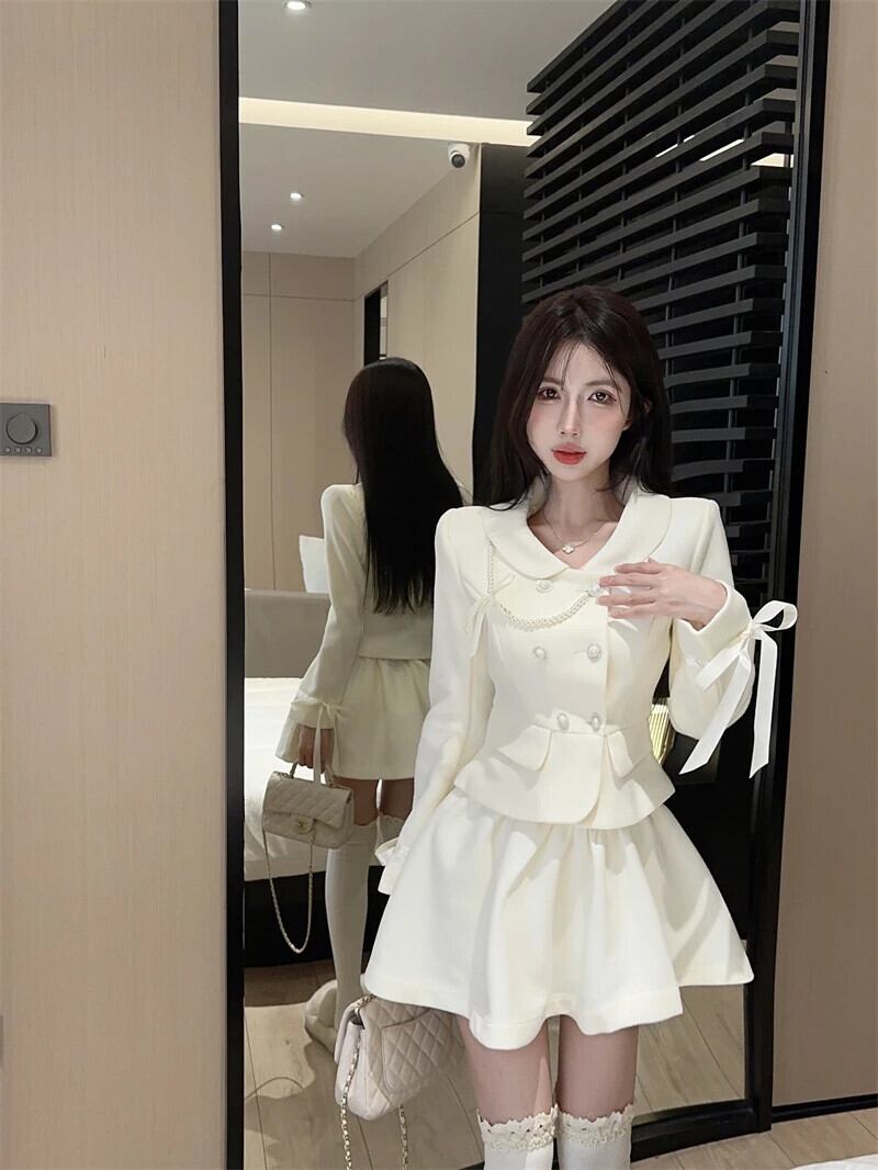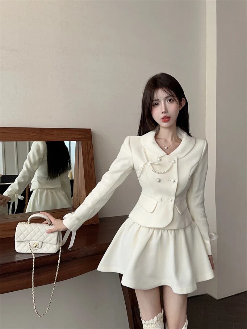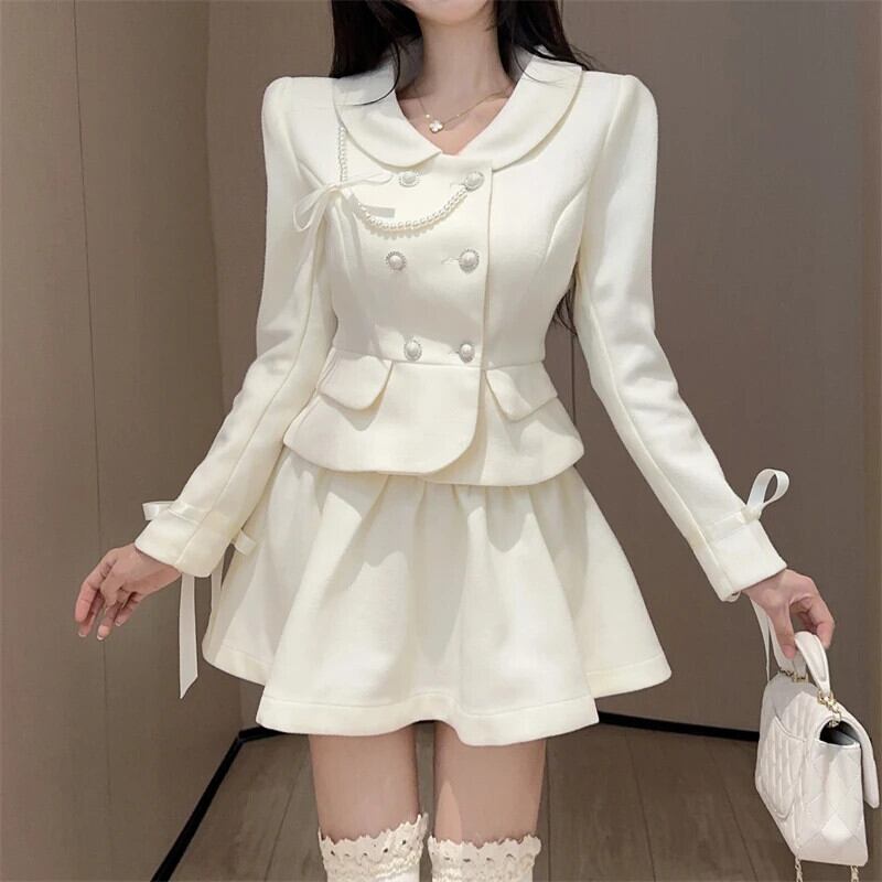 フレンチスタイルスーツ秋ターンダウン襟長袖コートウエストミニスカートツーピースセット ロング オータム 秋物