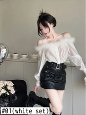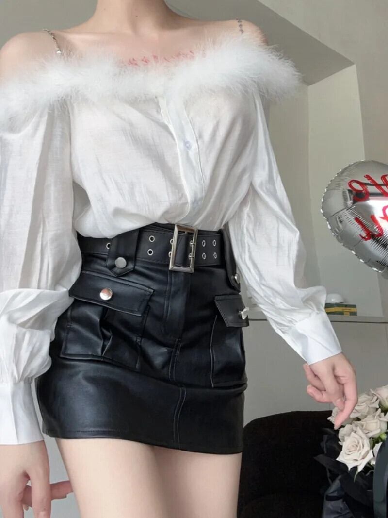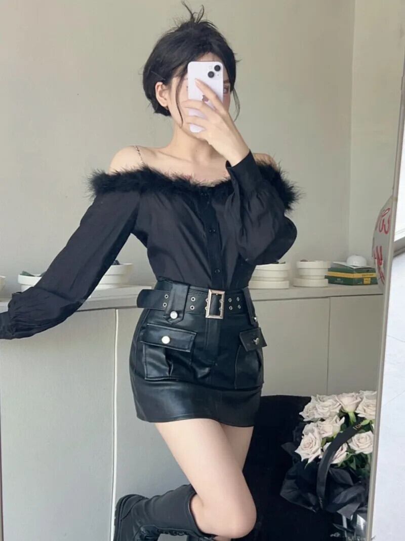 フレンチ スイート ガール スーツ レディース 秋 スラッシュ ネック ピュア セクシー 長袖 トップ ウエスト レザー ミニ スカート 2 点セット ロング 大人ガーリー スウィート キュート カジュアル オータム 秋物