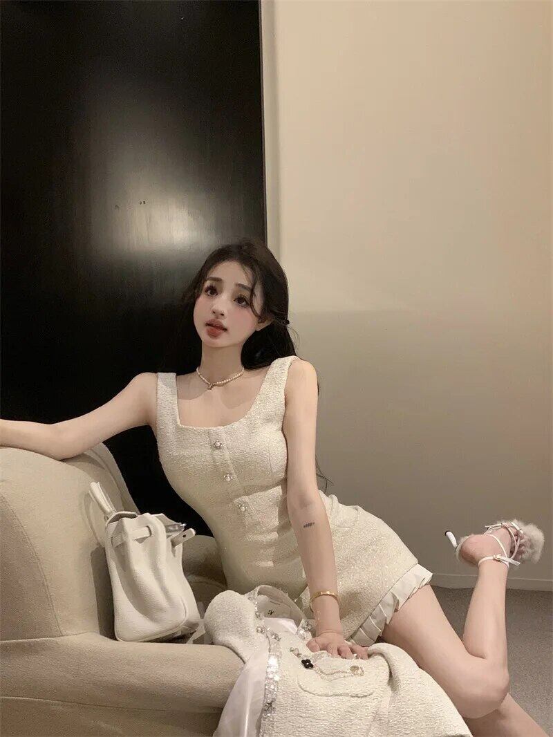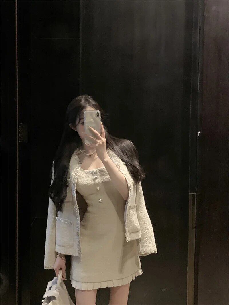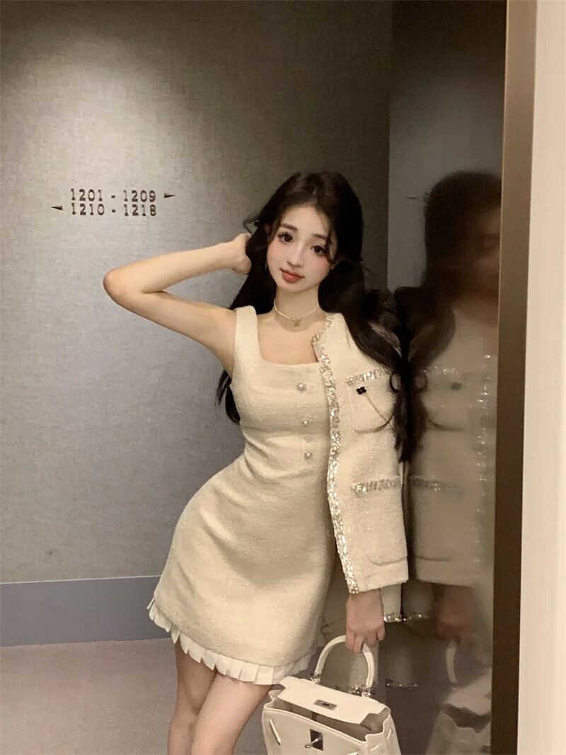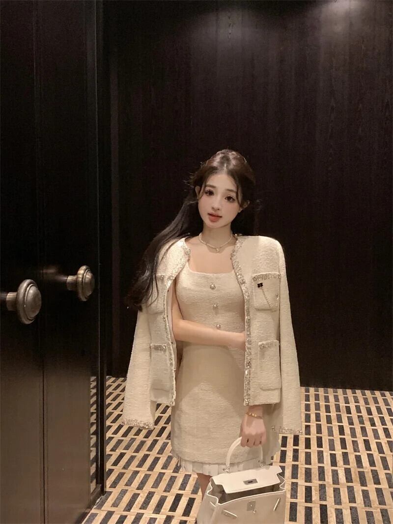 甘いホットガールスーツ秋/冬長袖ビーズコートスクエアカラーノースリーブドレスツーピースセット ロング 大人ガーリー スウィート キュート カジュアル オータム 秋物 ウィンター 冬物 スクウェア