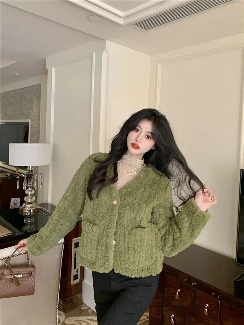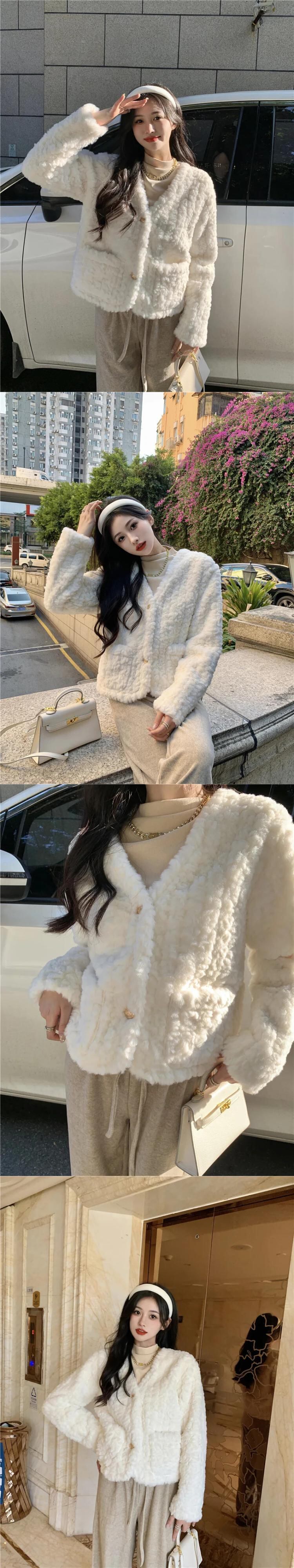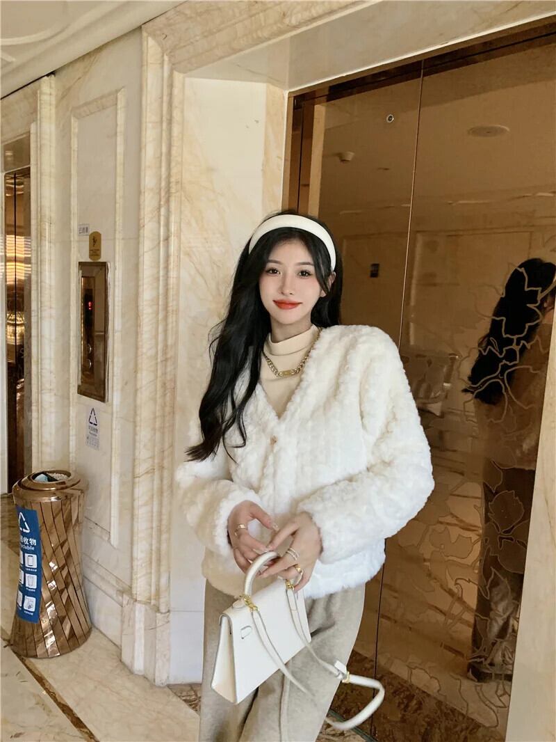 甘いホットガールメタルバックル V ネック豪華綿ジャケット秋ルースファー長袖ショートコットンジャケット ロング 大人ガーリー スウィート キュート カジュアル オータム 秋物 Vネック