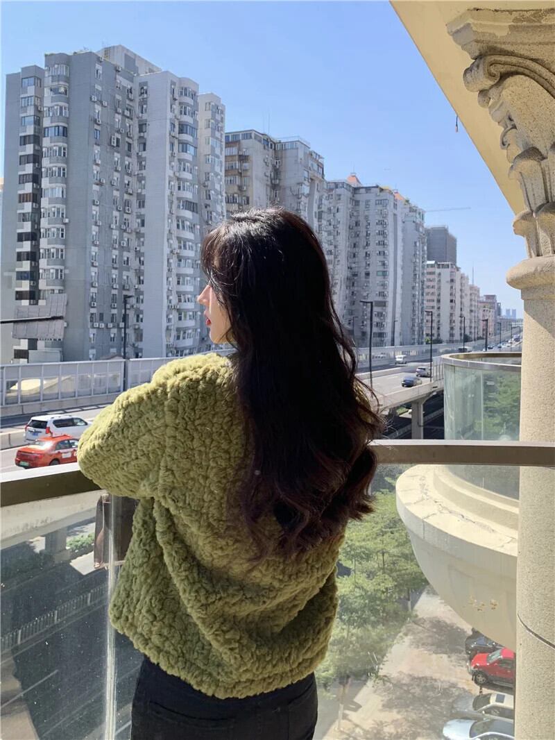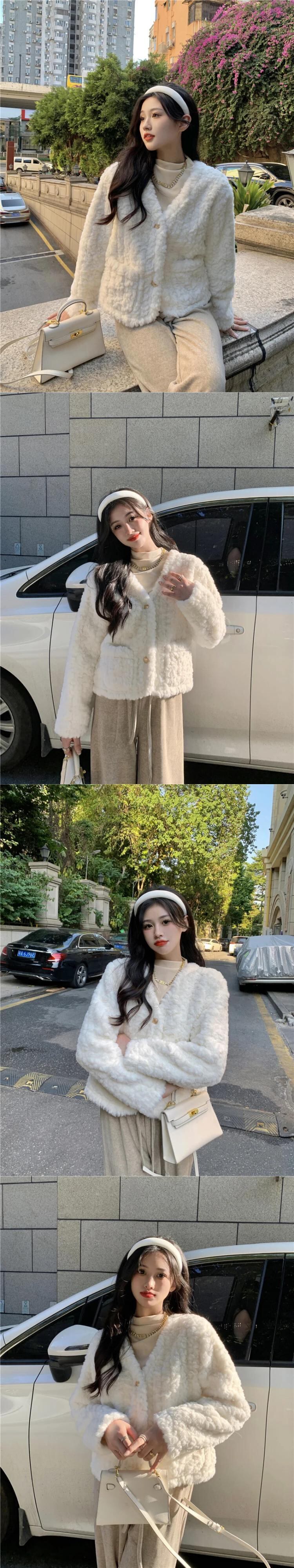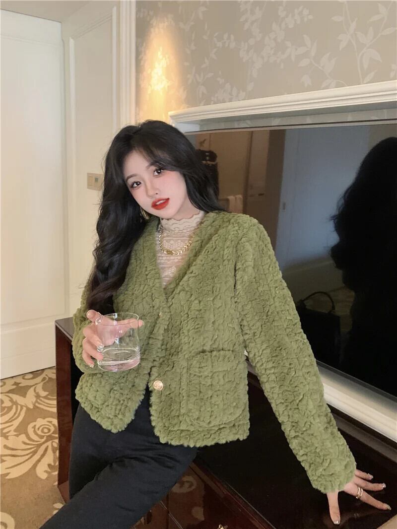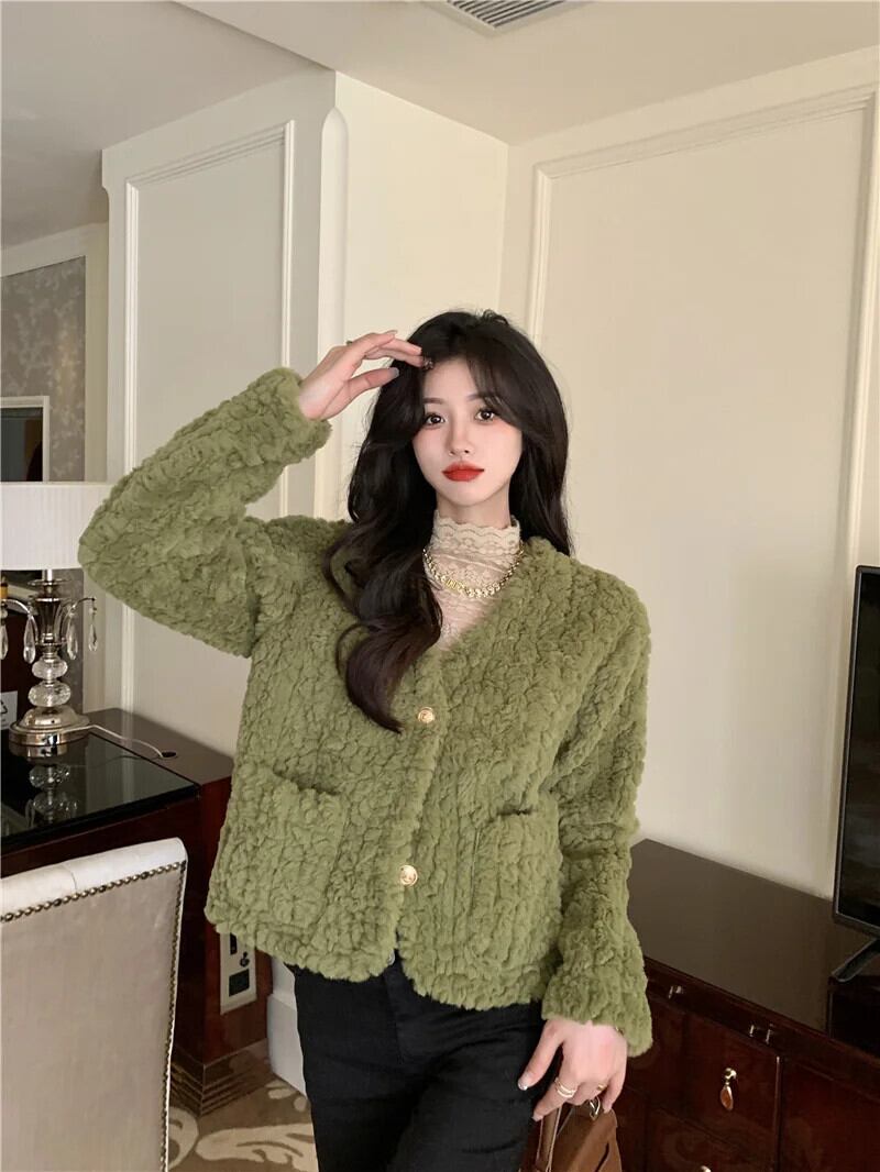 甘いホットガールメタルバックル V ネック豪華綿ジャケット秋ルースファー長袖ショートコットンジャケット ロング 大人ガーリー スウィート キュート カジュアル オータム 秋物 Vネック