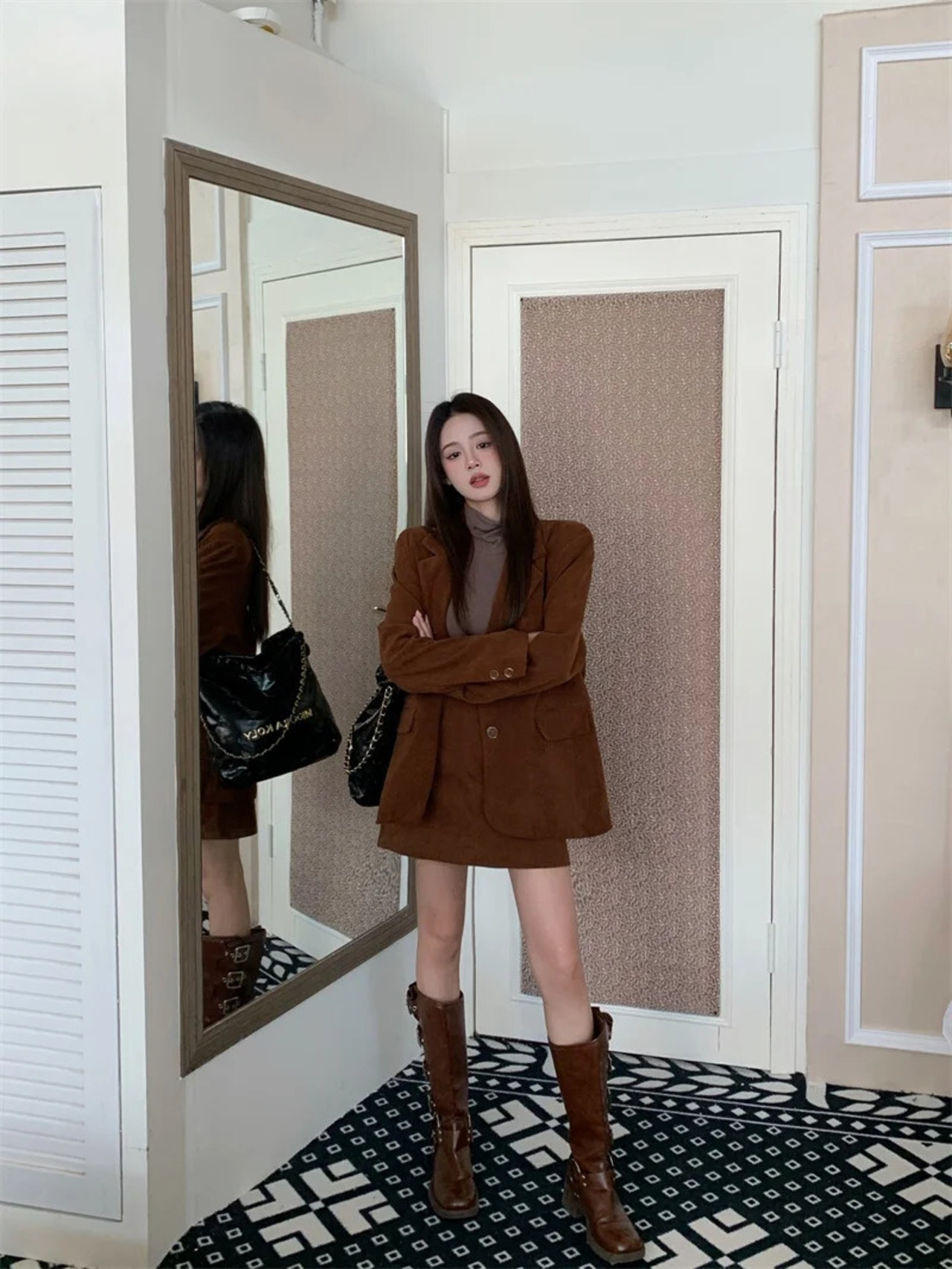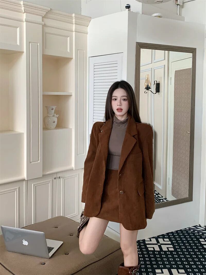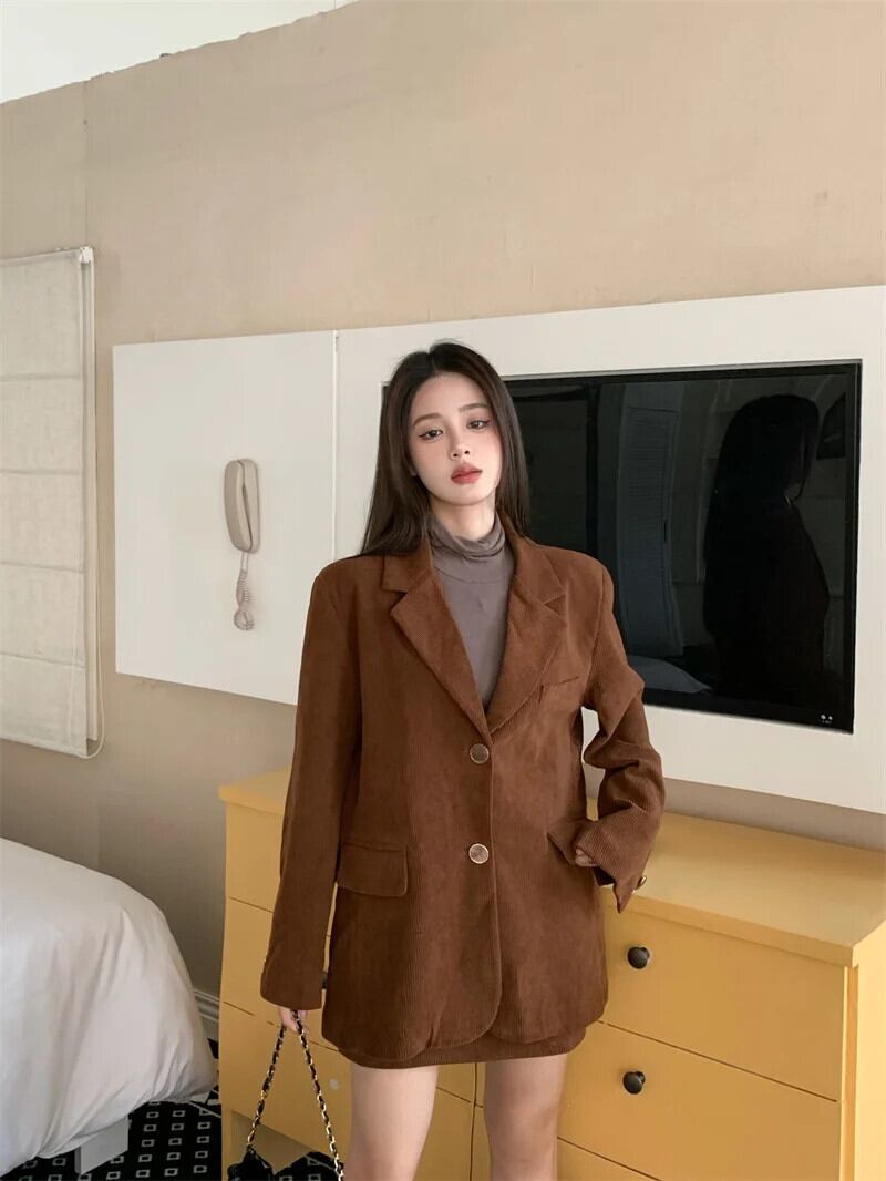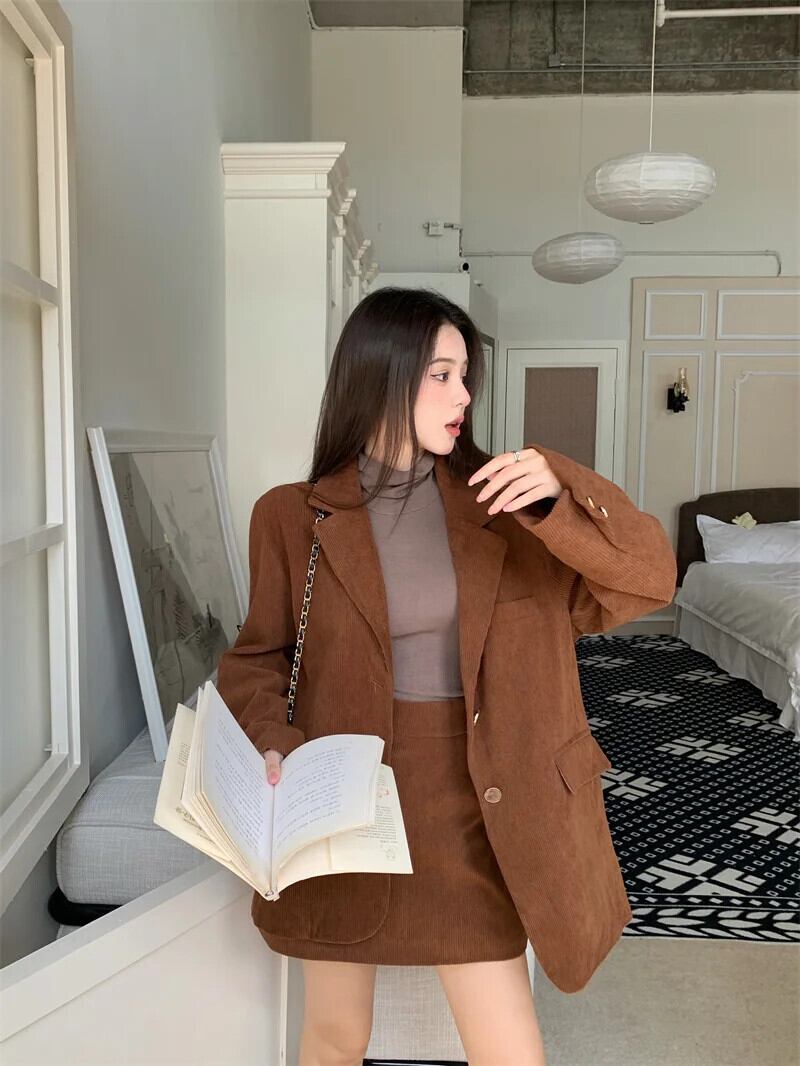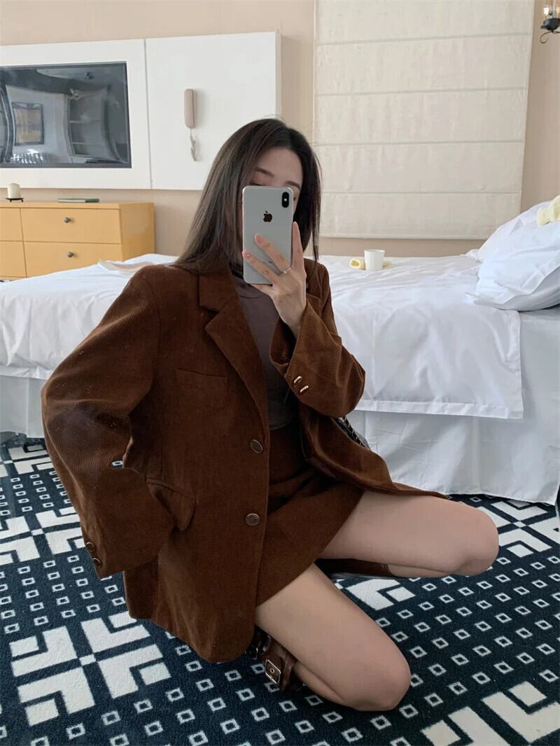 甘いホットガールスーツ秋コーデュロイシングルブレストスーツジャケット A ラインショートスカート 2 点セット 大人ガーリー スウィート キュート カジュアル オータム 秋物 Aライン