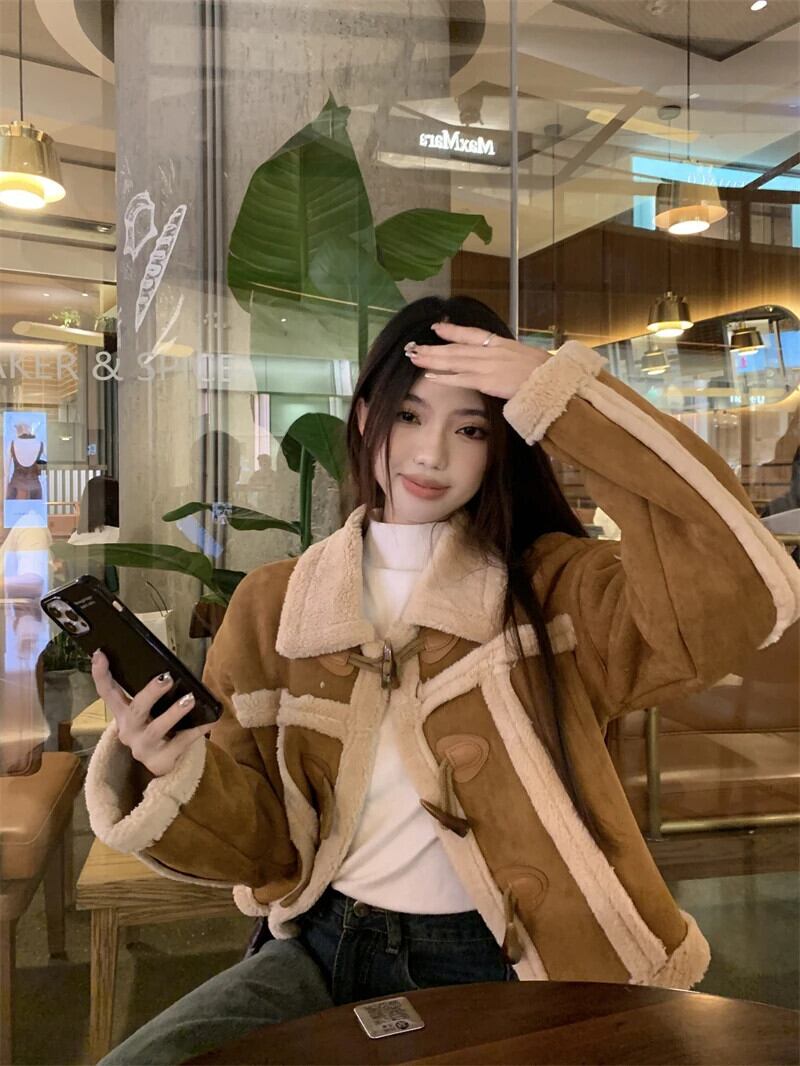 メイラードスタイルホーンボタンファー一体型コットンジャケット秋ショートルーズターンダウン襟肥厚コットンジャケット オータム 秋物