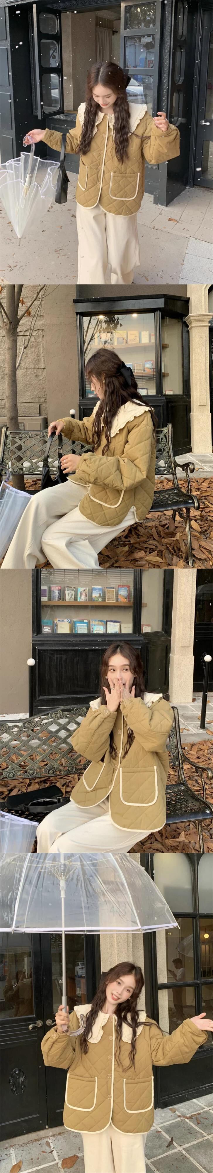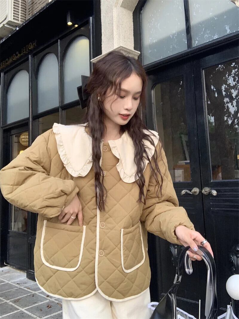 甘い女子コントラストピーターパン襟菱形格子ジャケット秋緩い肥厚綿コート コットン 大人ガーリー スウィート キュート カジュアル オータム 秋物