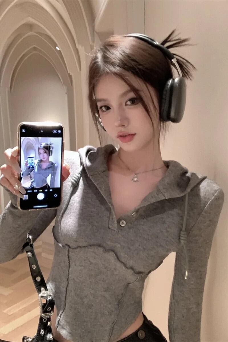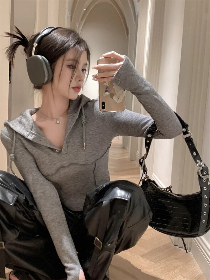 甘くてクールホットガールズフード付きニットボトムシャツ秋スリムフィット薄い多用途トップ長袖 Tシャツ ロング 大人ガーリー スウィート キュート カジュアル オータム 秋物