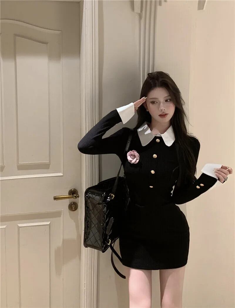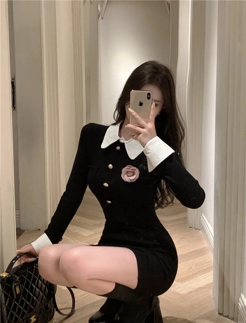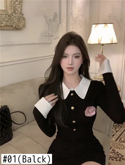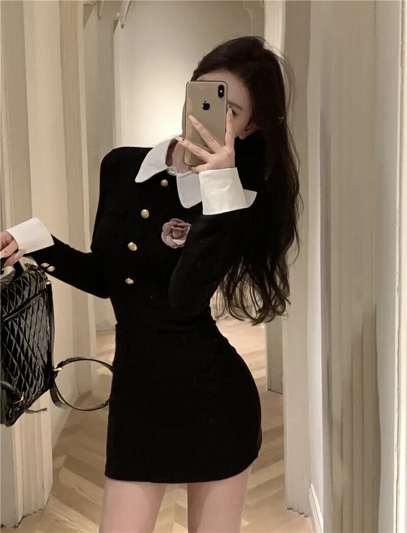 スイートガールズスタイルニットドレス秋シャツ襟スリムフィットショートフェイクツーピースドレス 大人ガーリー スウィート キュート カジュアル オータム 秋物