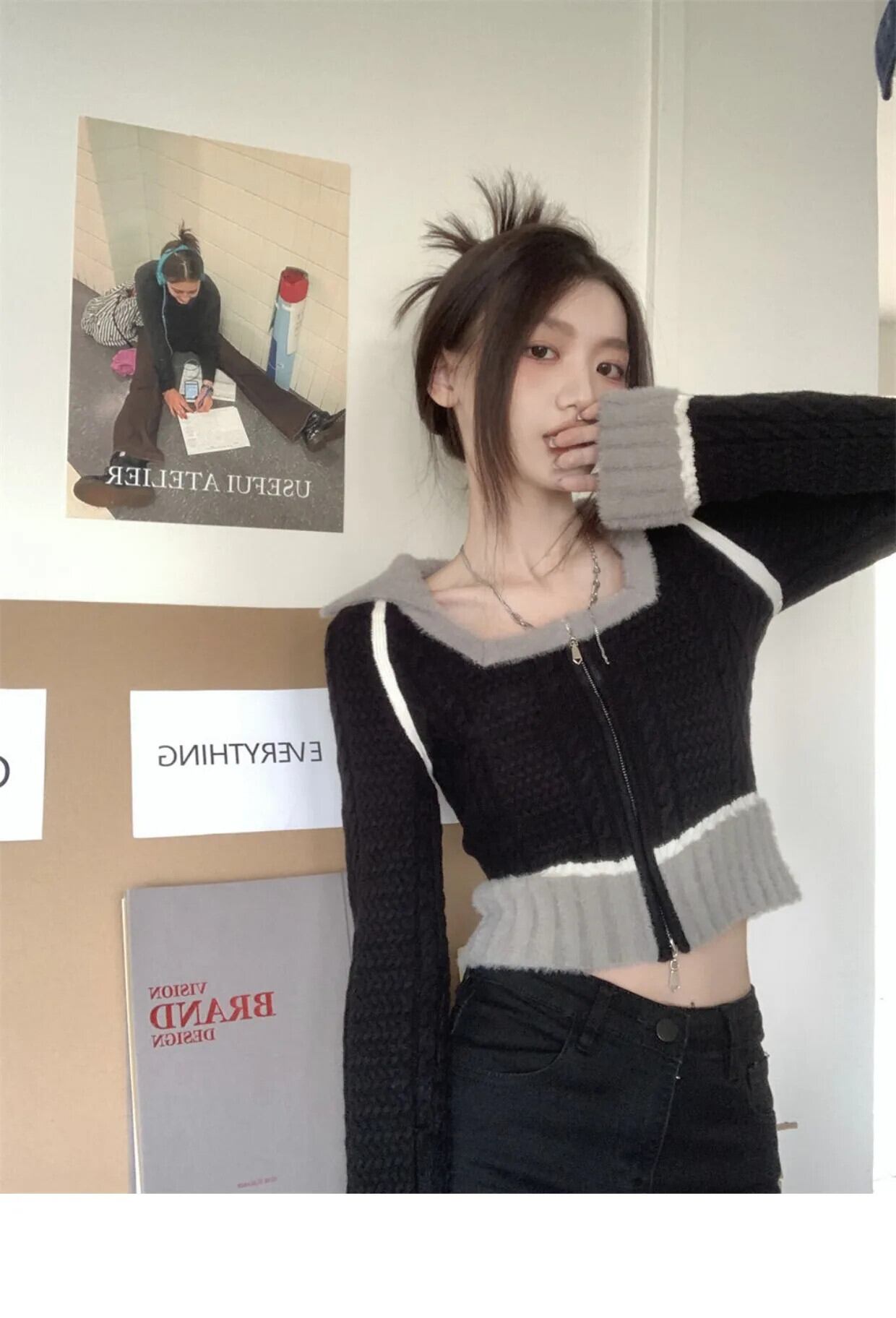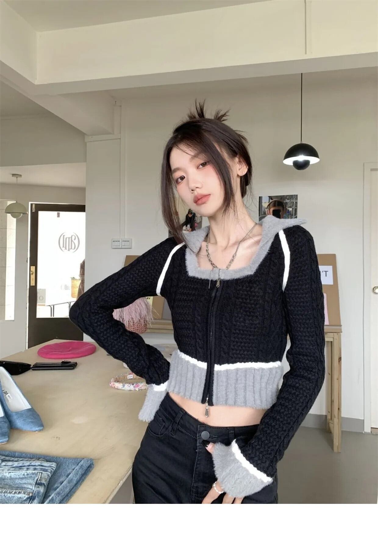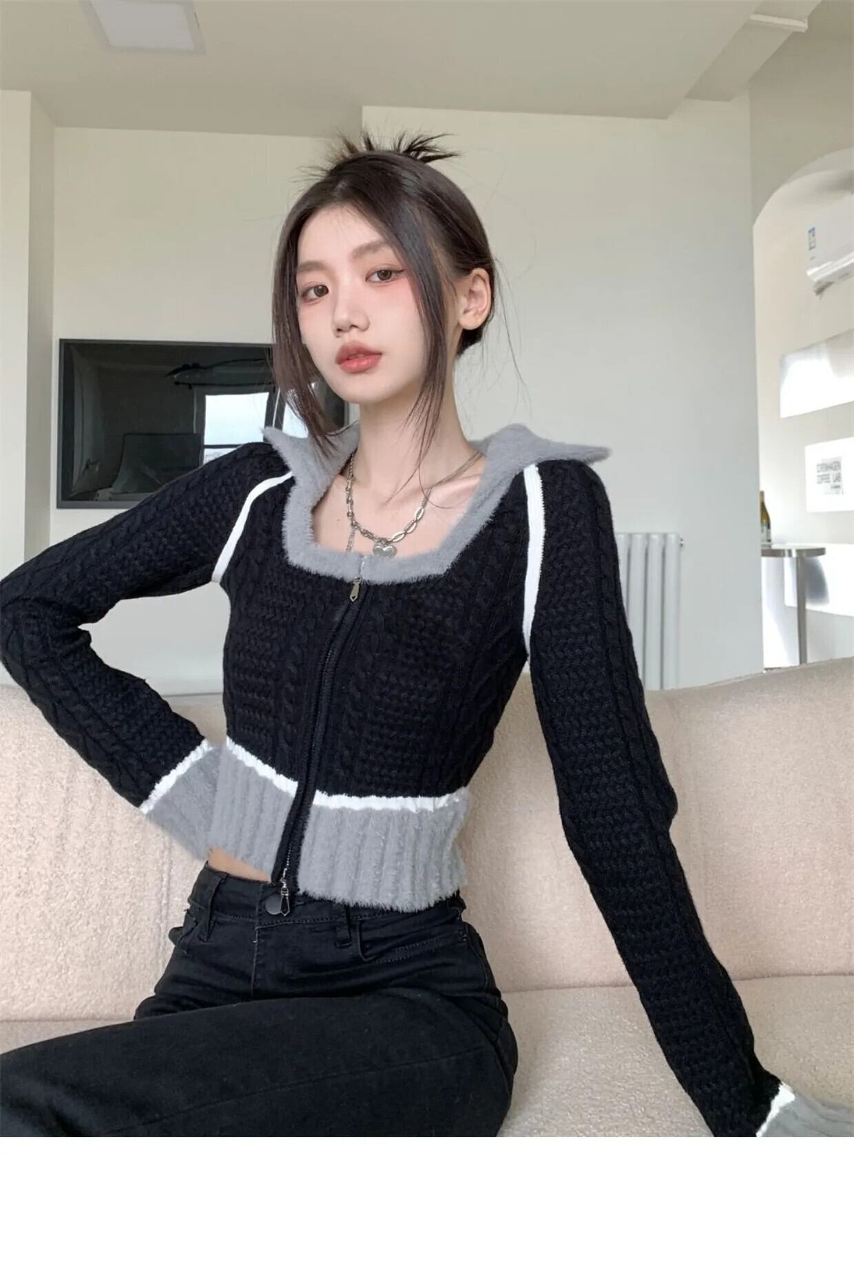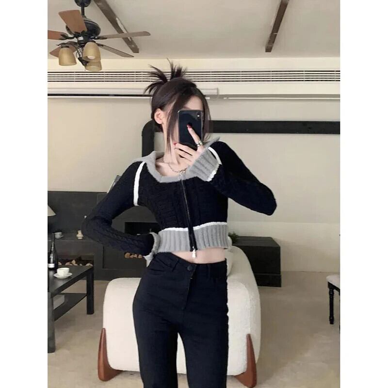 甘いホットガール黒スクエアカラーニットカーディガン秋/冬スリムフィットショートセーターコートトップ ブラック 大人ガーリー スウィート キュート カジュアル オータム 秋物 ウィンター 冬物 スクウェア