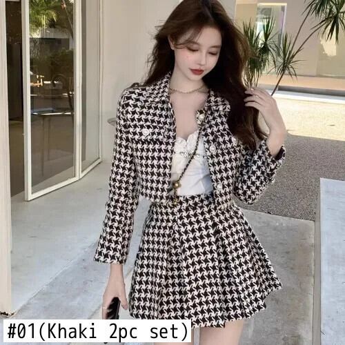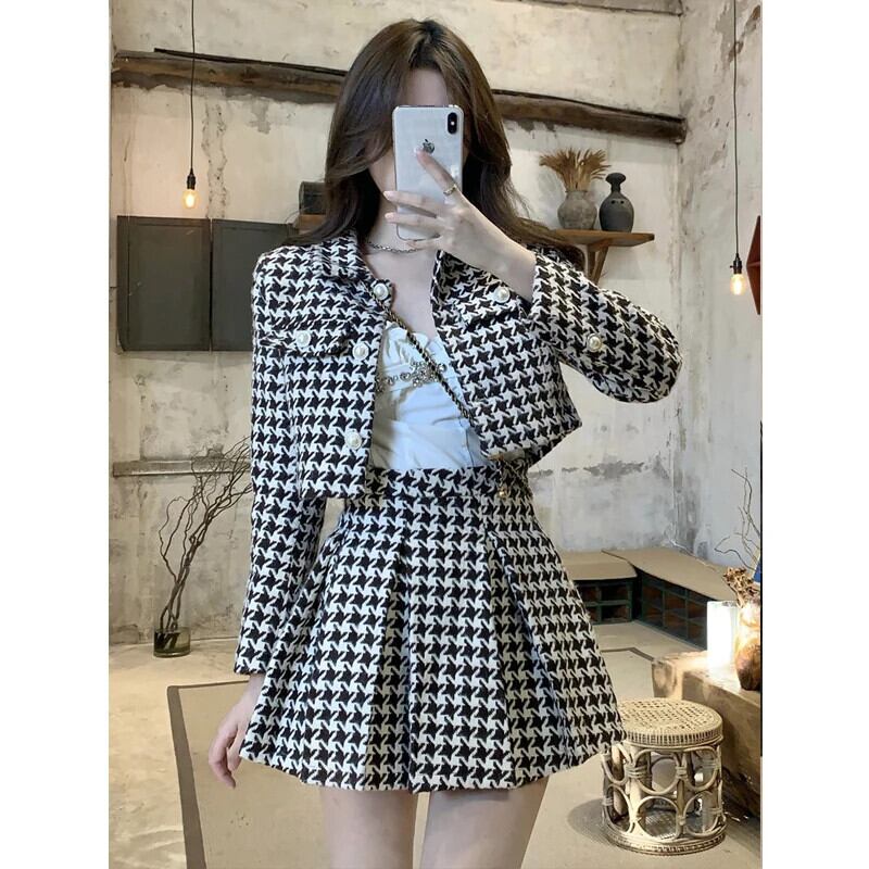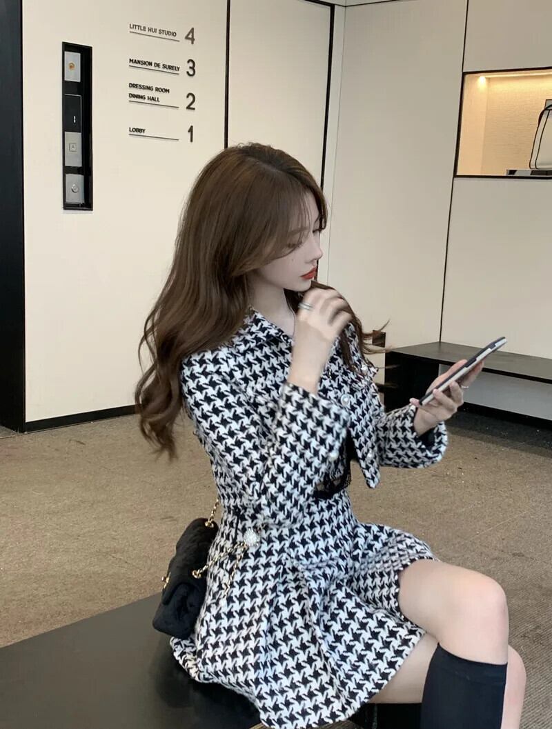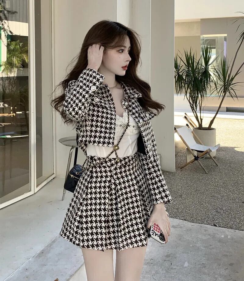 甘いホットガールスーツ秋レトロシックツイードチェック柄ショートジャケット A ラインミニスカート 2 点セット 大人ガーリー スウィート キュート カジュアル オータム 秋物 Aライン