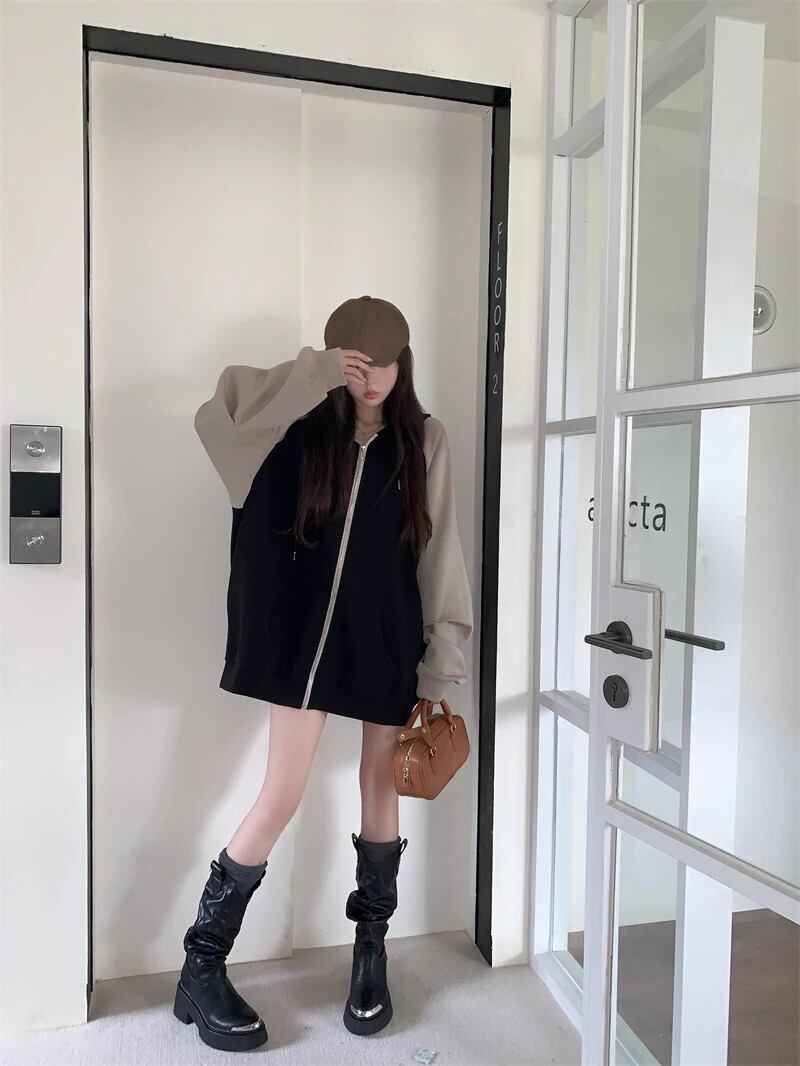 ホットガールアメリカンレトロコントラストパネルベルベット肥厚パーカー秋フード付きジッパートレーナー オータム 秋物