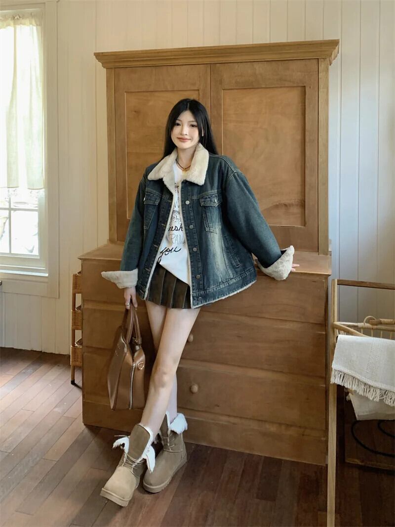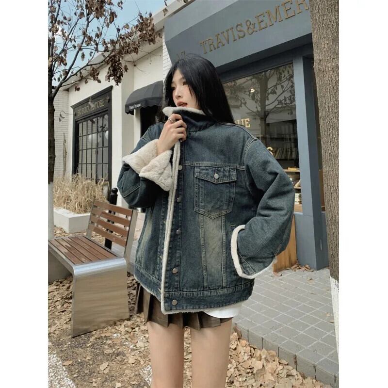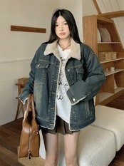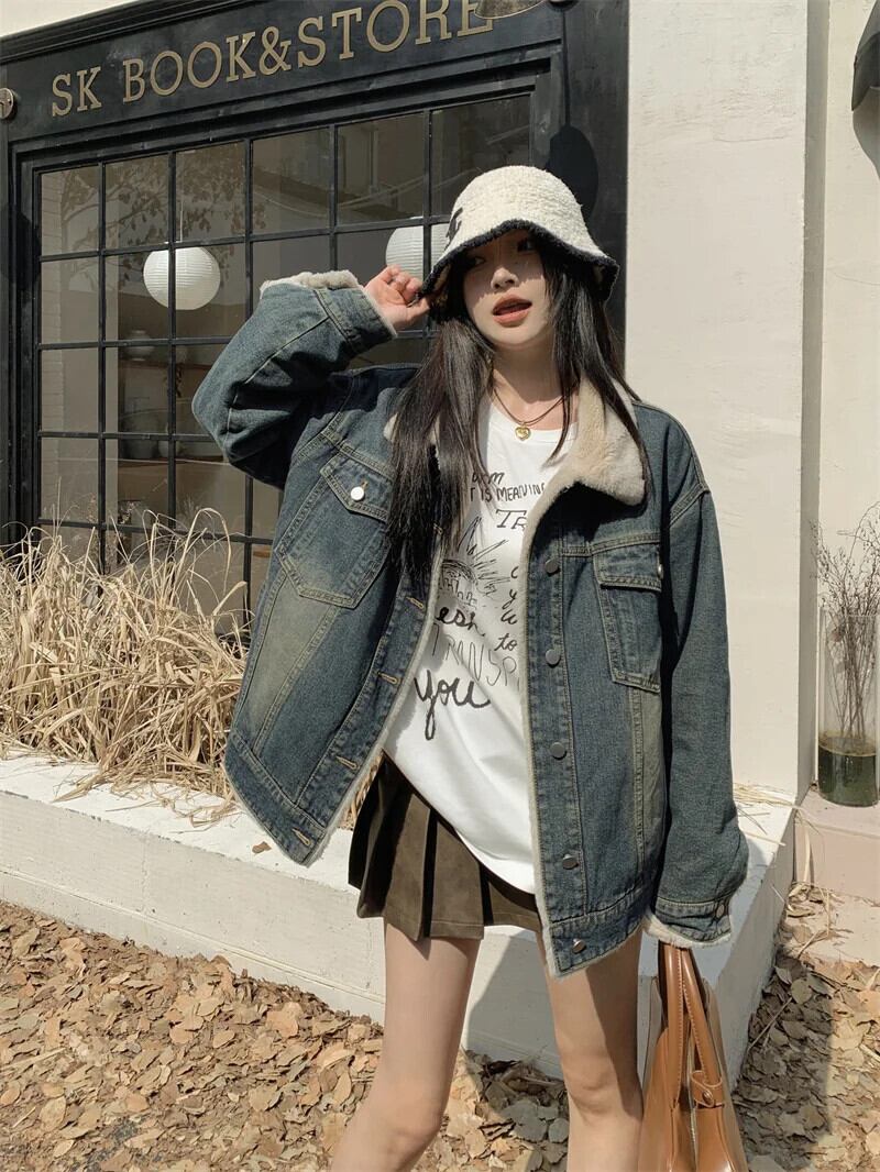 スタイルホットガールぬいぐるみパッチワークターンダウン襟デニムジャケット秋ぬいぐるみルーズフィットジャケット オータム 秋物