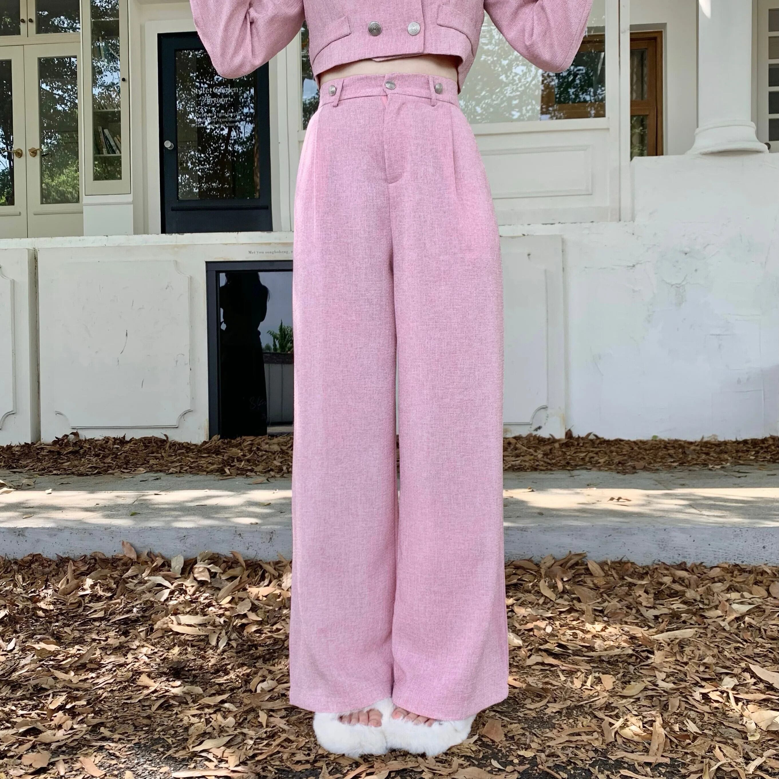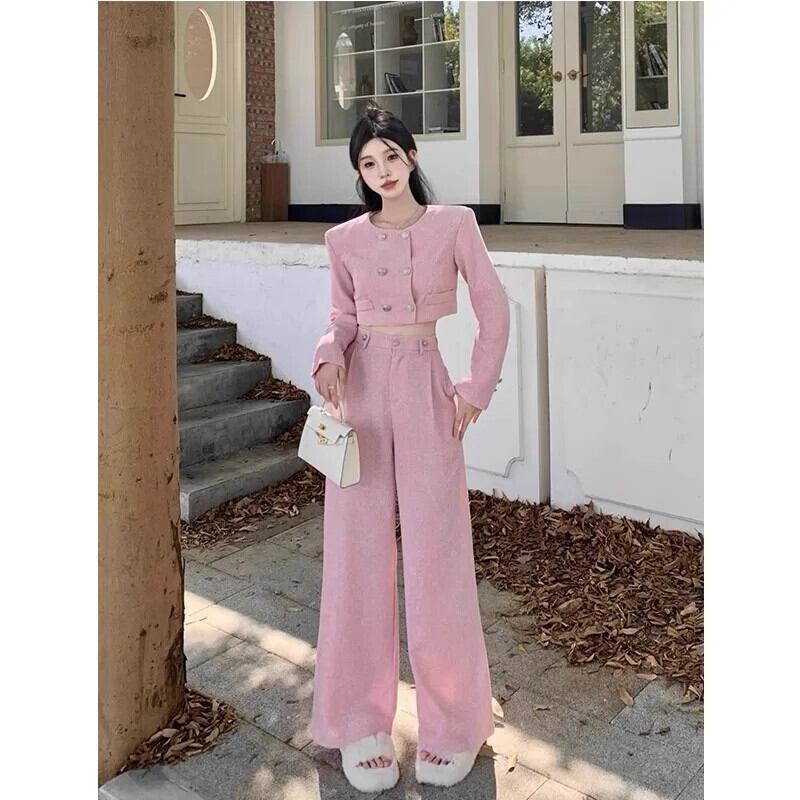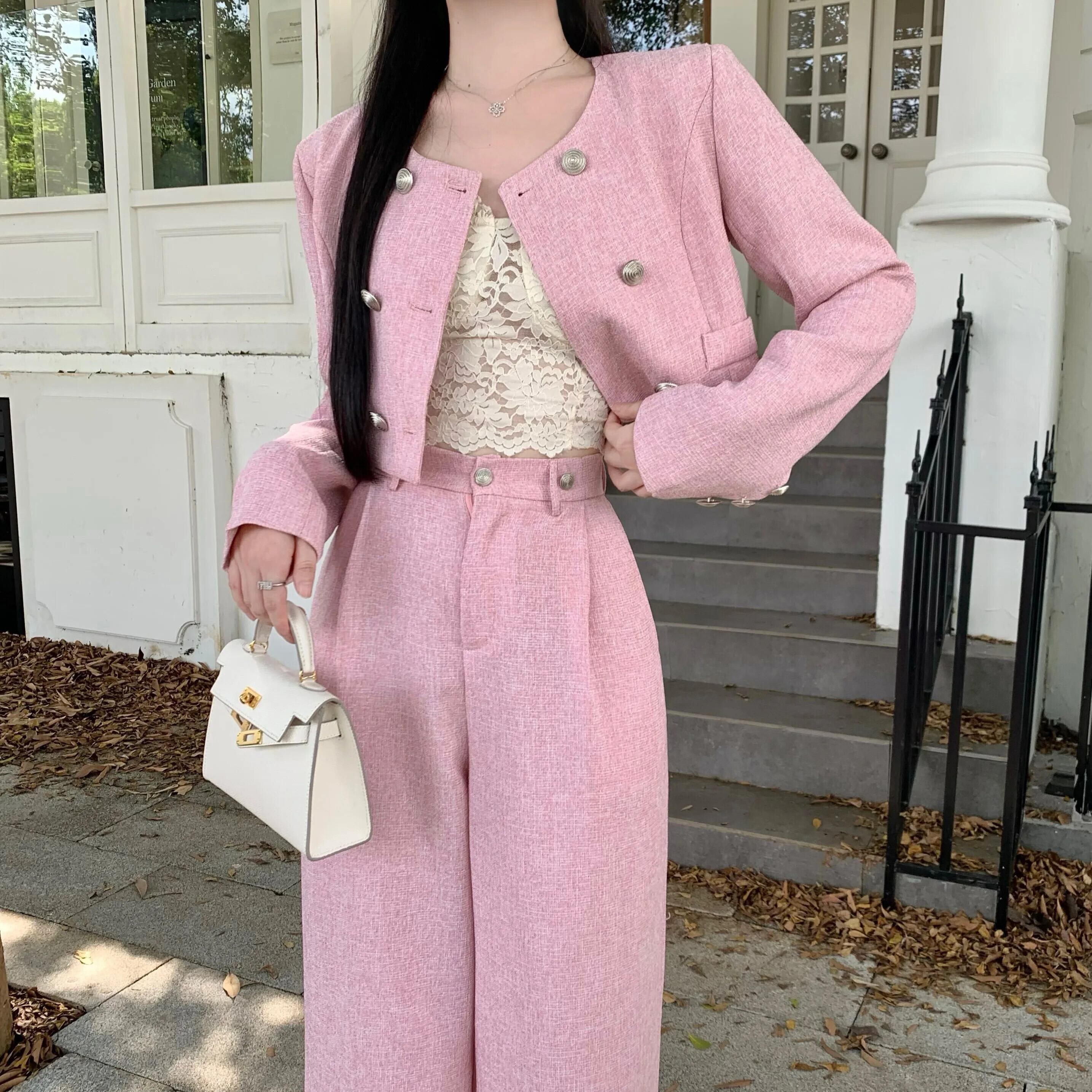 Sweet Girl スーツ レディース 秋 ダブルブレスト Oネック ショートコート ウエスト ワイドレッグ パンツ 2点セット 大人ガーリー スウィート キュート カジュアル オータム 秋物 ワイドパンツ