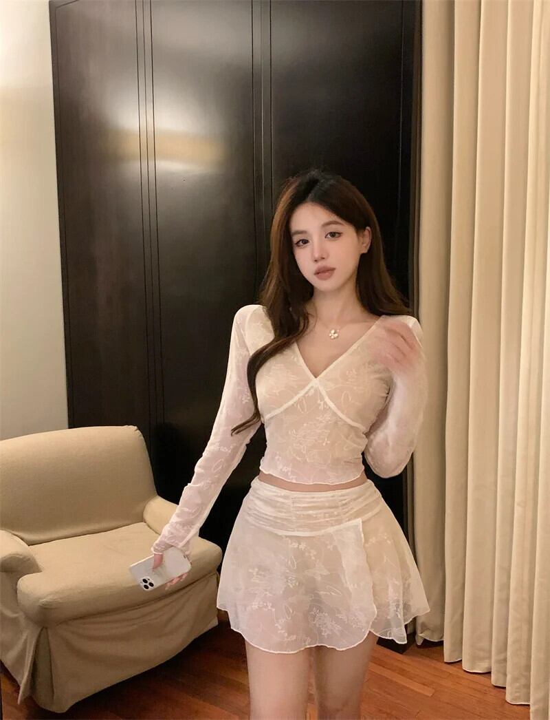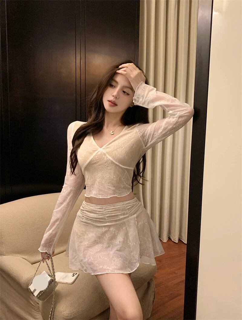 ホットガール純粋セクシーレーススーツ秋長袖ショート V ネックトップローウエストショートスカート 2 点セット ロング オータム 秋物 Vネック ピュア