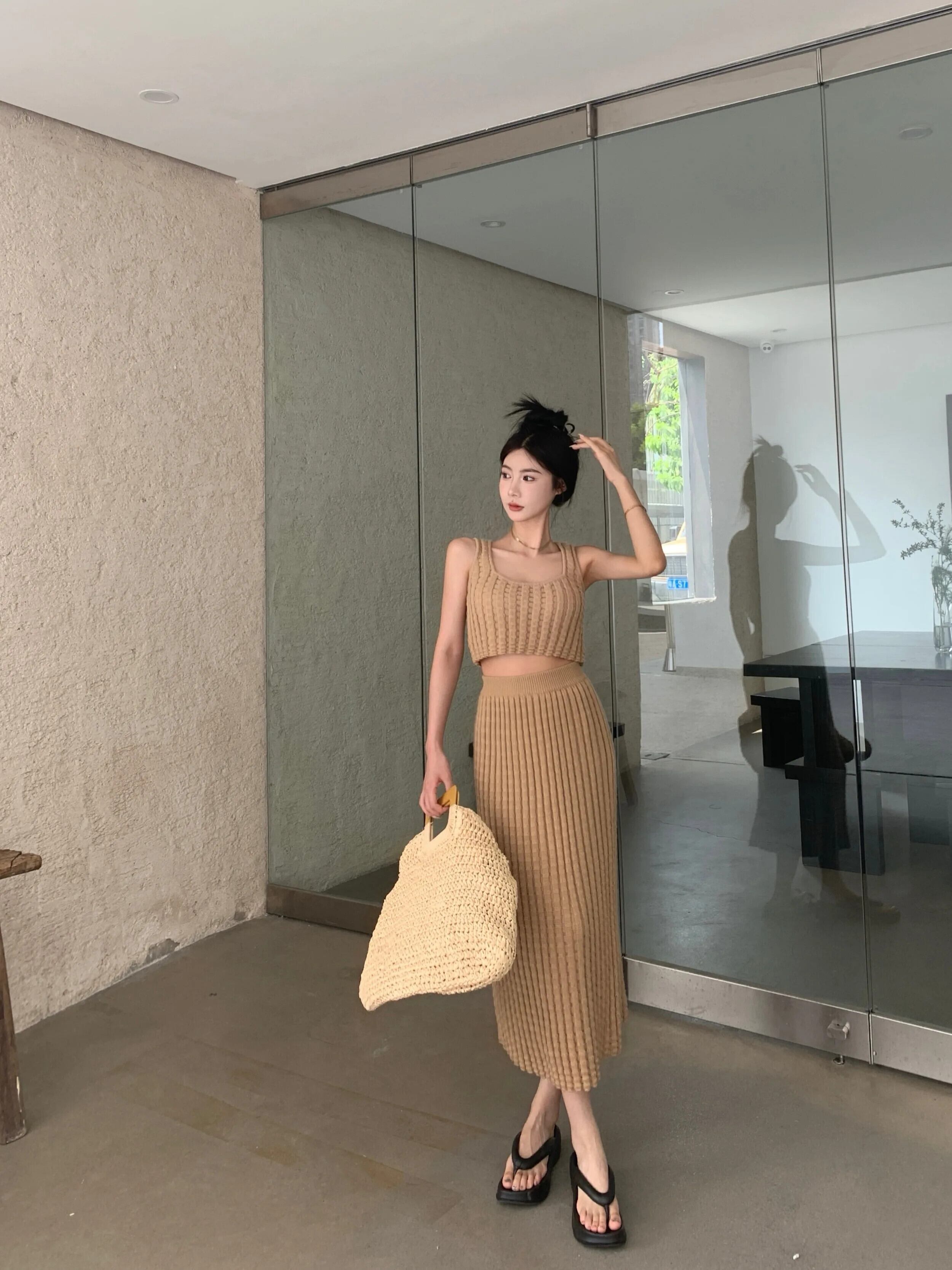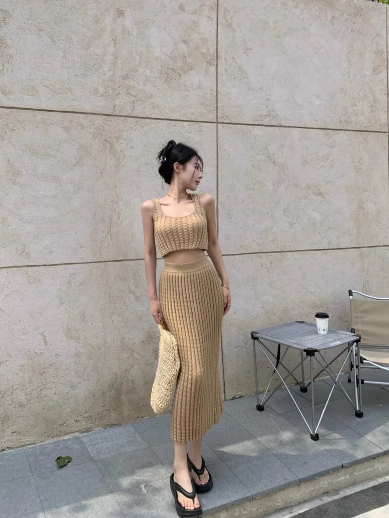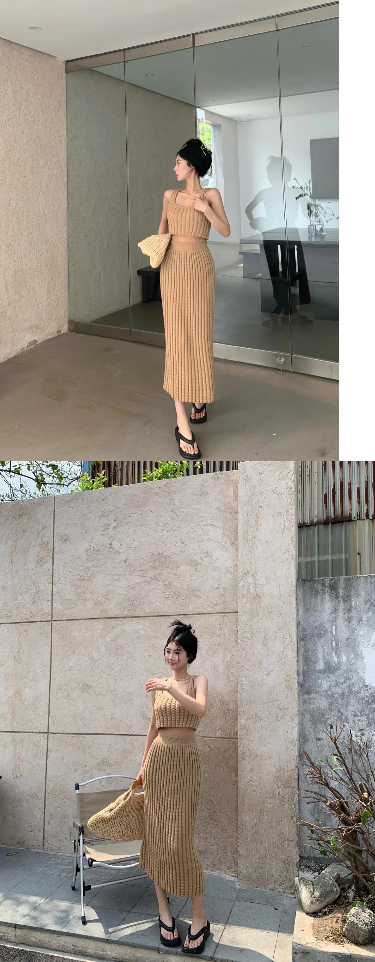 スウィートガールニットスーツピットストライプショートストラップレストップウエストラップヒップロングスカートツーピースセット 大人ガーリー キュート カジュアル