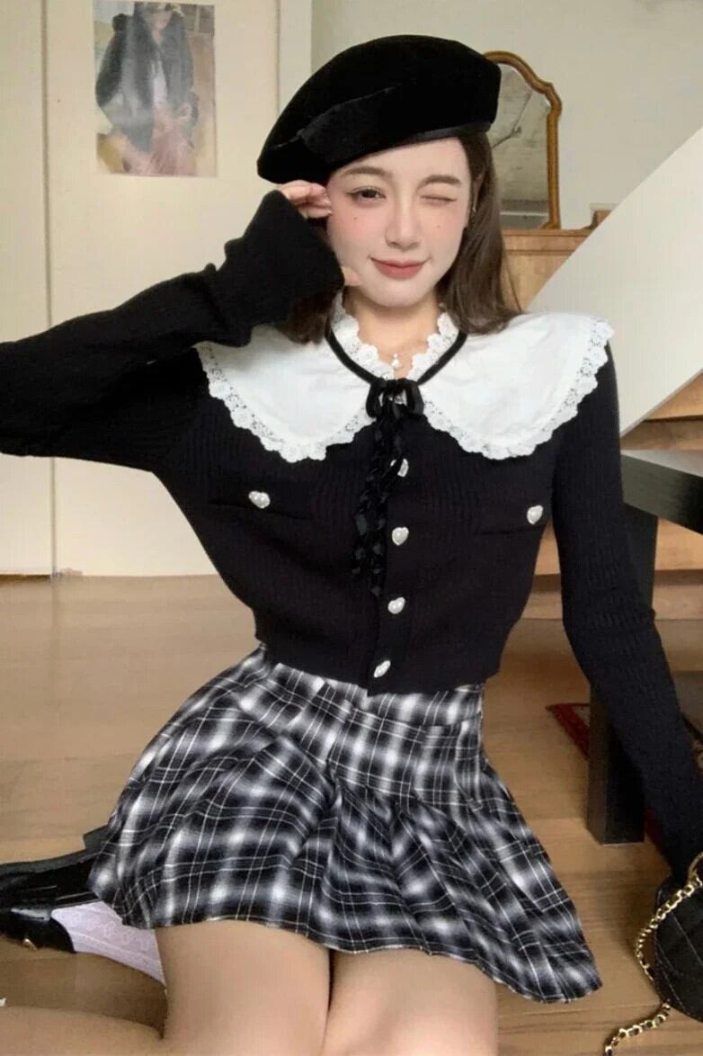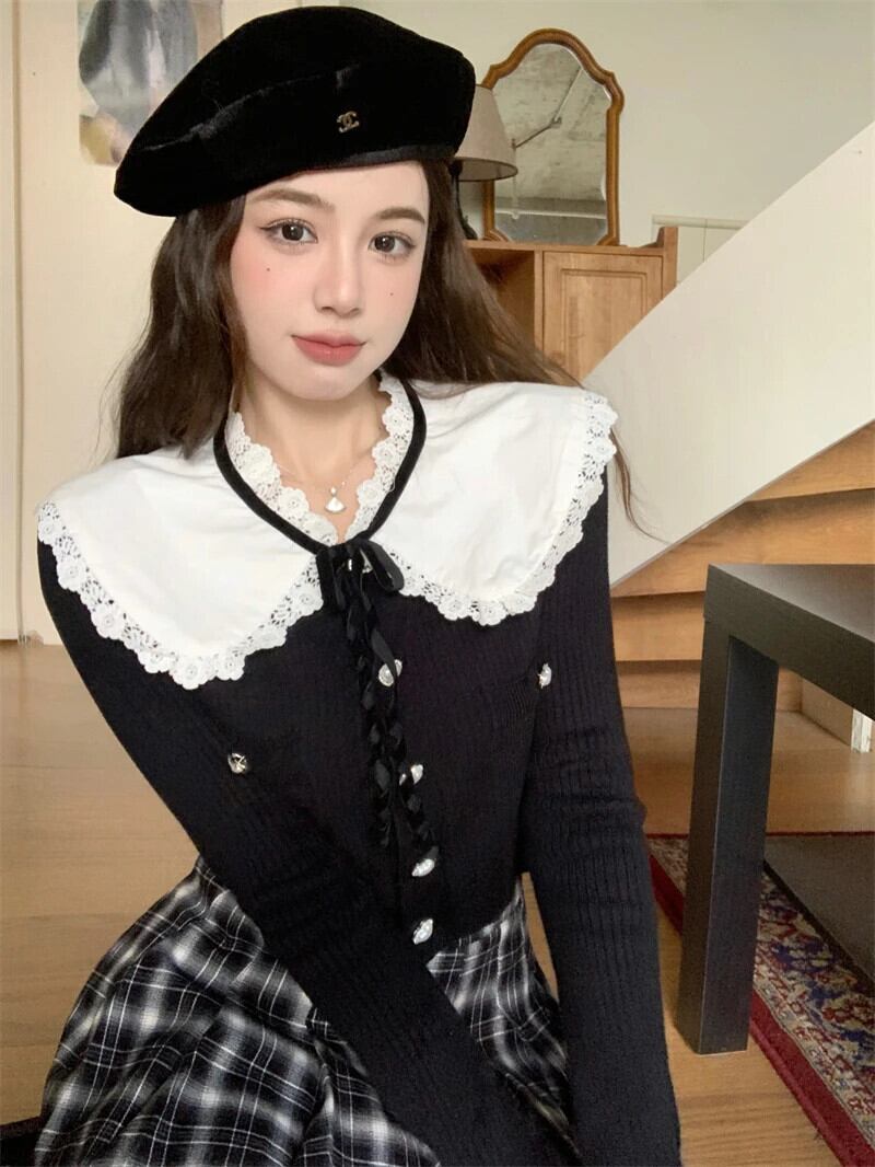 スイートガールスーツ レディース 秋冬 ピーターパンカラー 長袖ニットカーディガン ウエストチェック柄スカート 2点セット ロング 大人ガーリー スウィート キュート カジュアル オータム 秋物 ウィンター 冬物