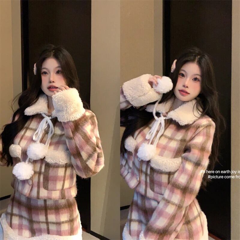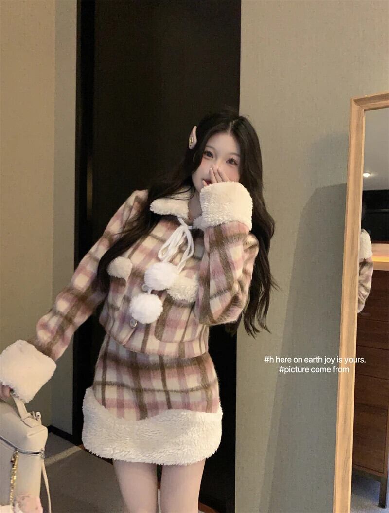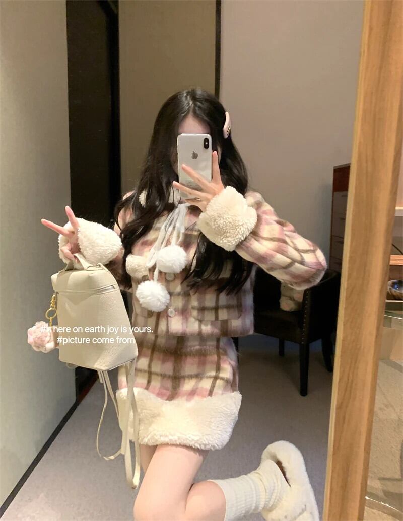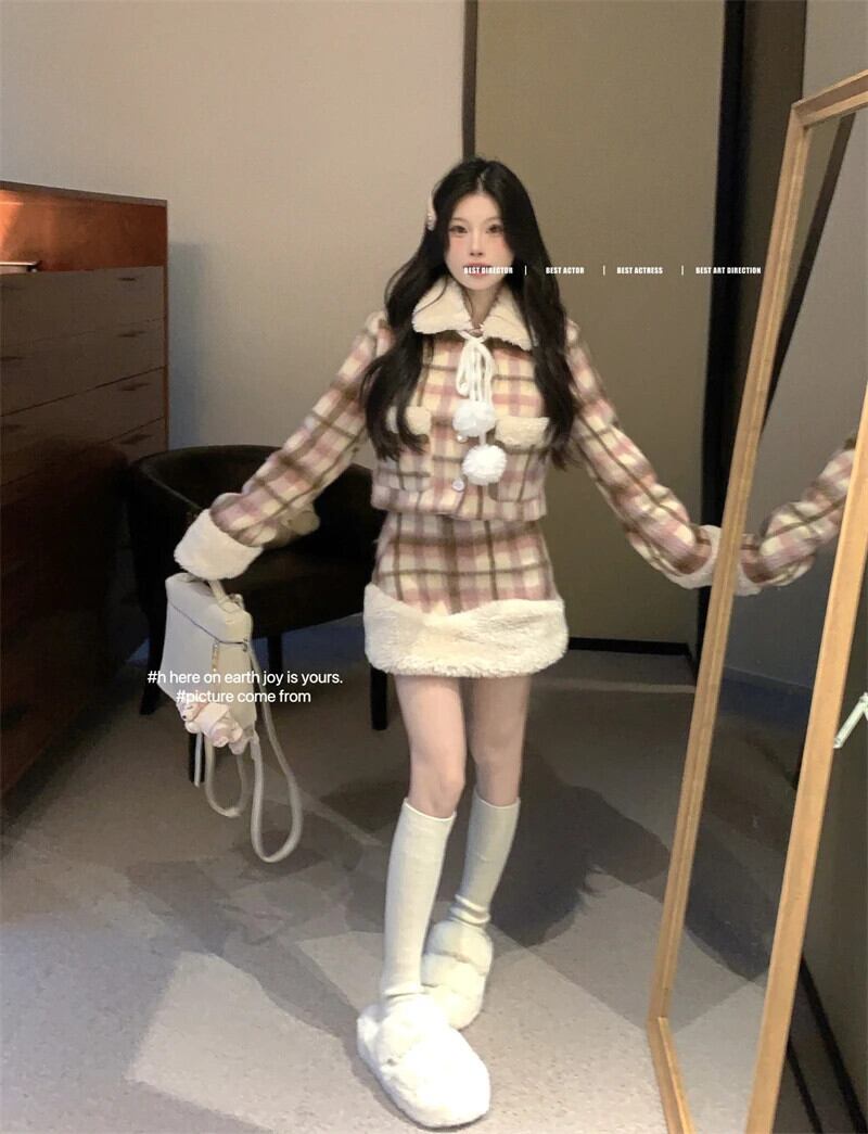 スイートガールスーツ秋/冬ルーズウールチェック柄パネルショートコートミニスカートツーピースセット 大人ガーリー スウィート キュート カジュアル オータム 秋物 ウィンター 冬物