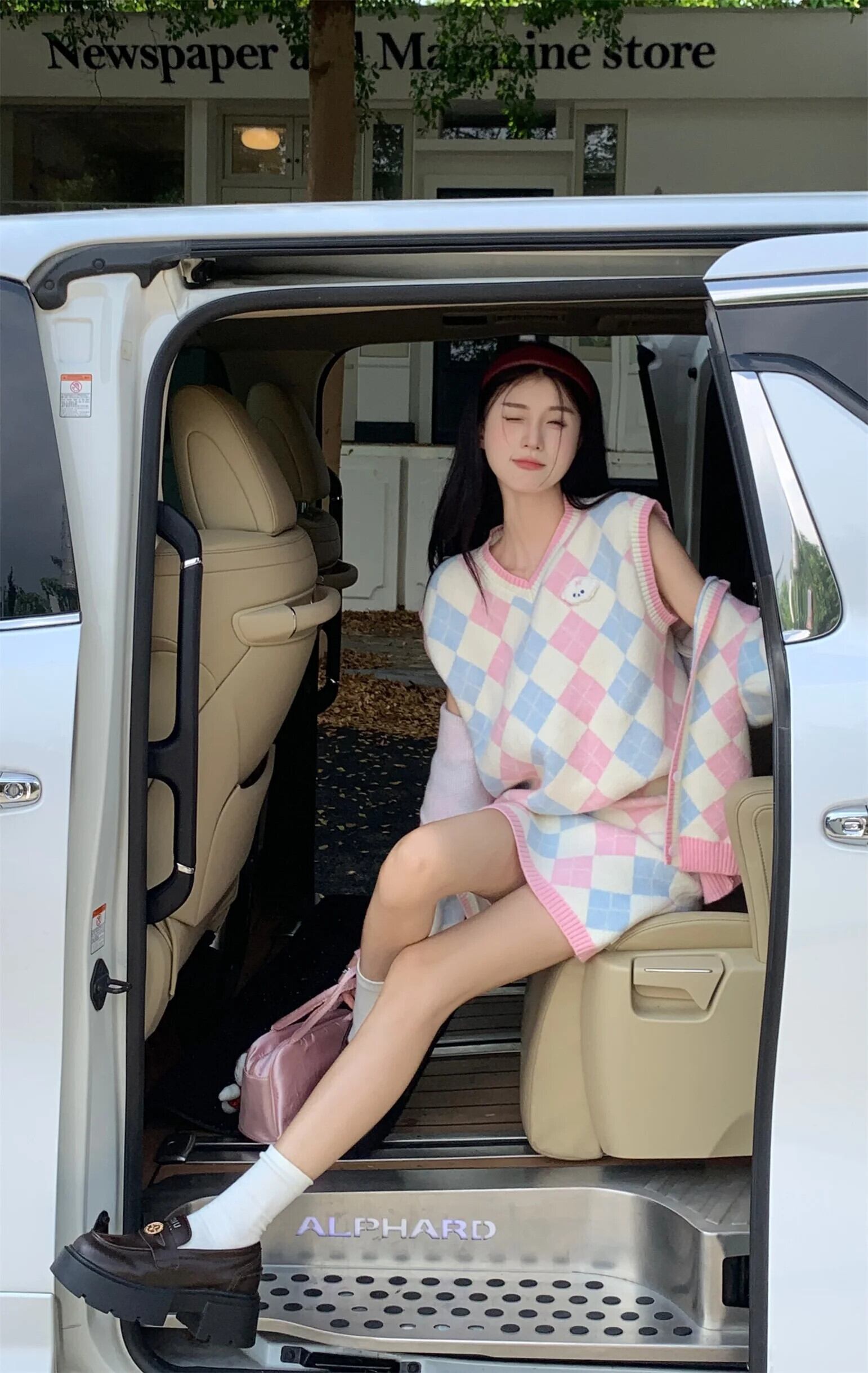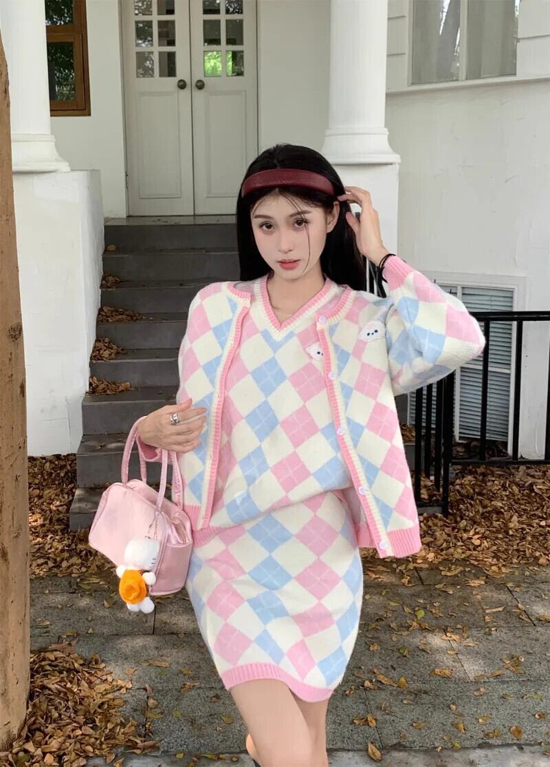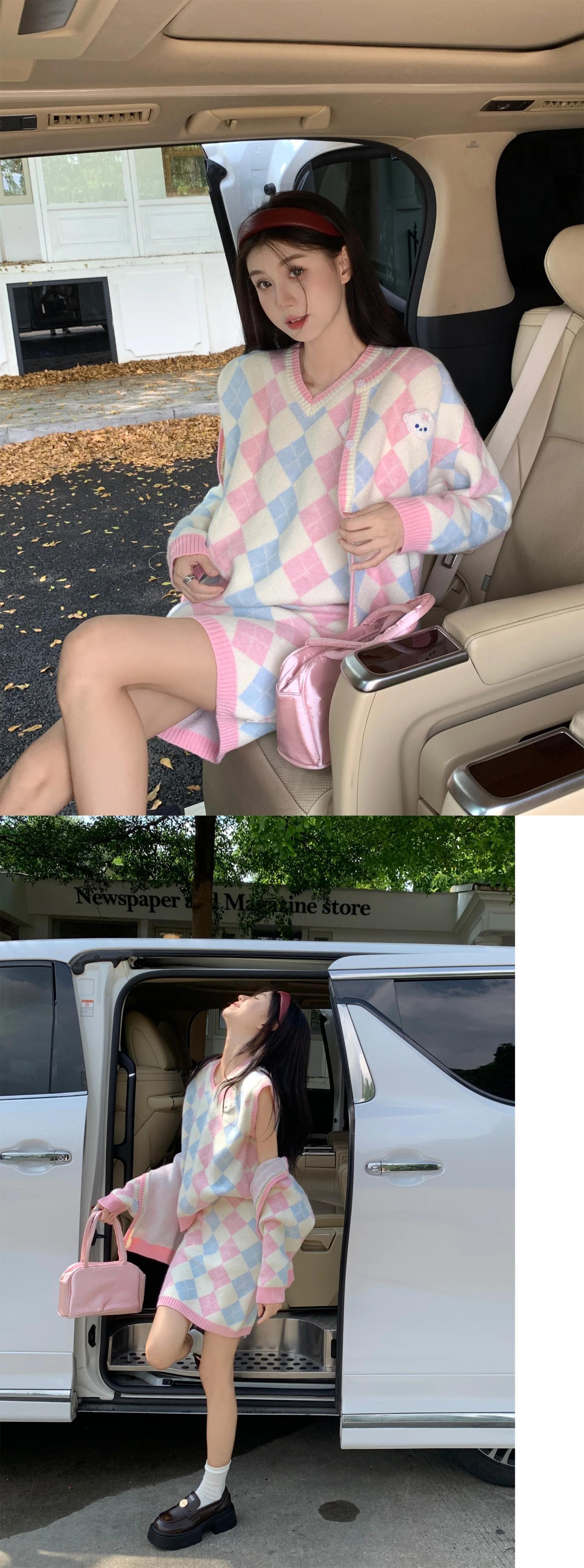 Sweet Girl 菱形格子ニットスーツ秋カーディガンジャケットベストミニスカート 3 点セット 大人ガーリー スウィート キュート カジュアル オータム 秋物