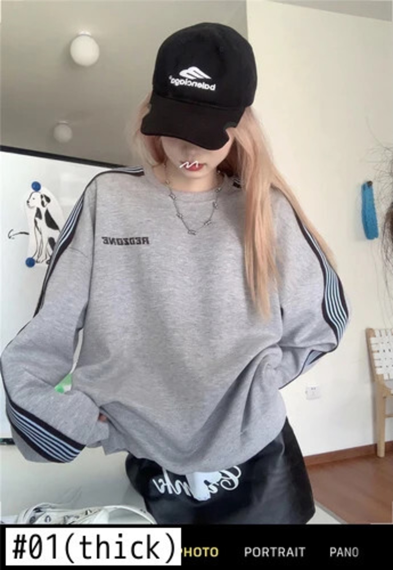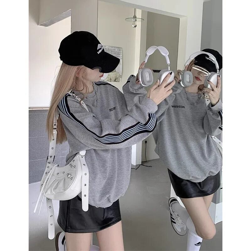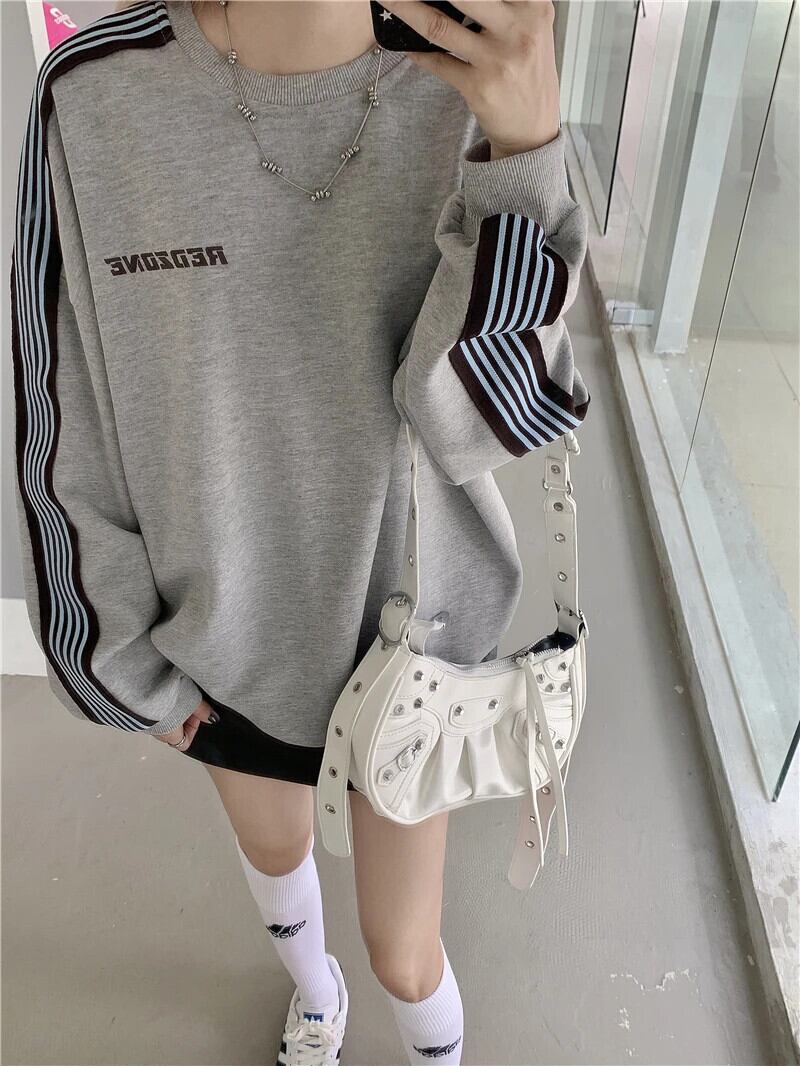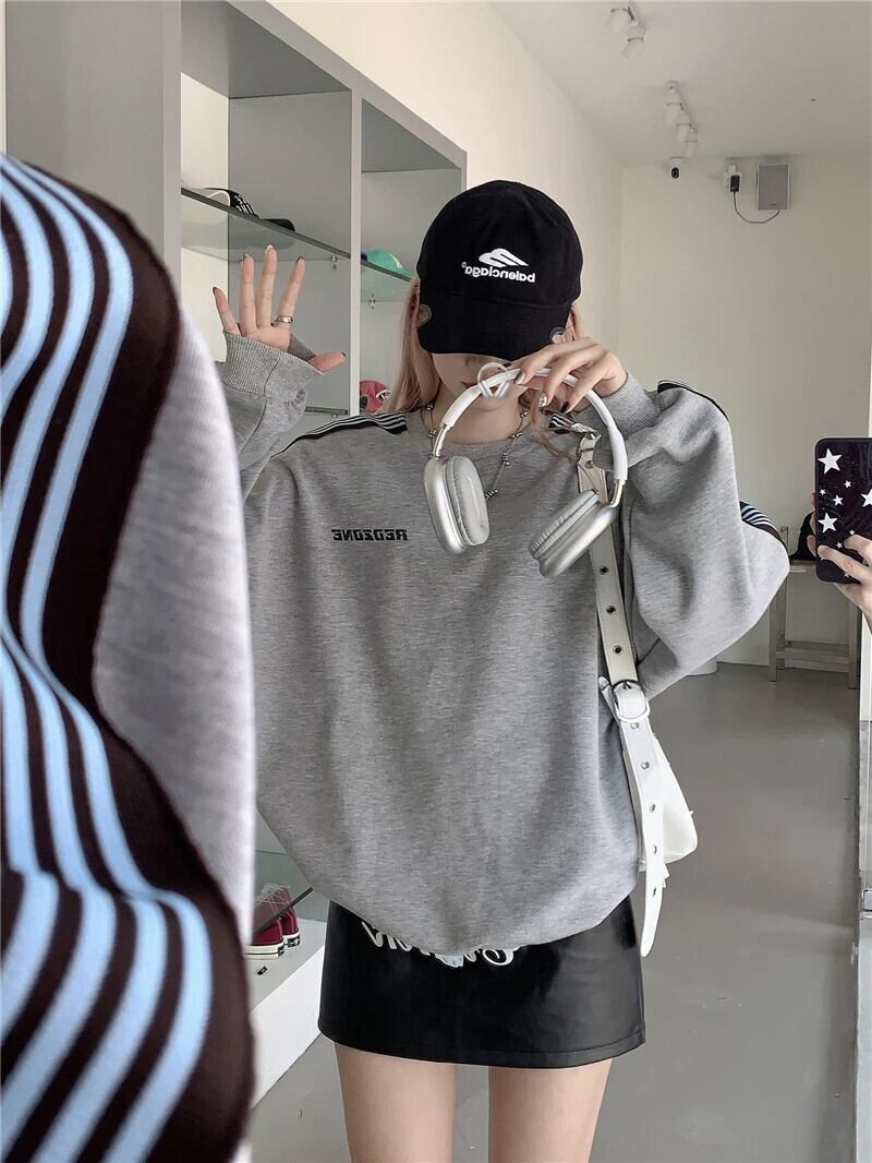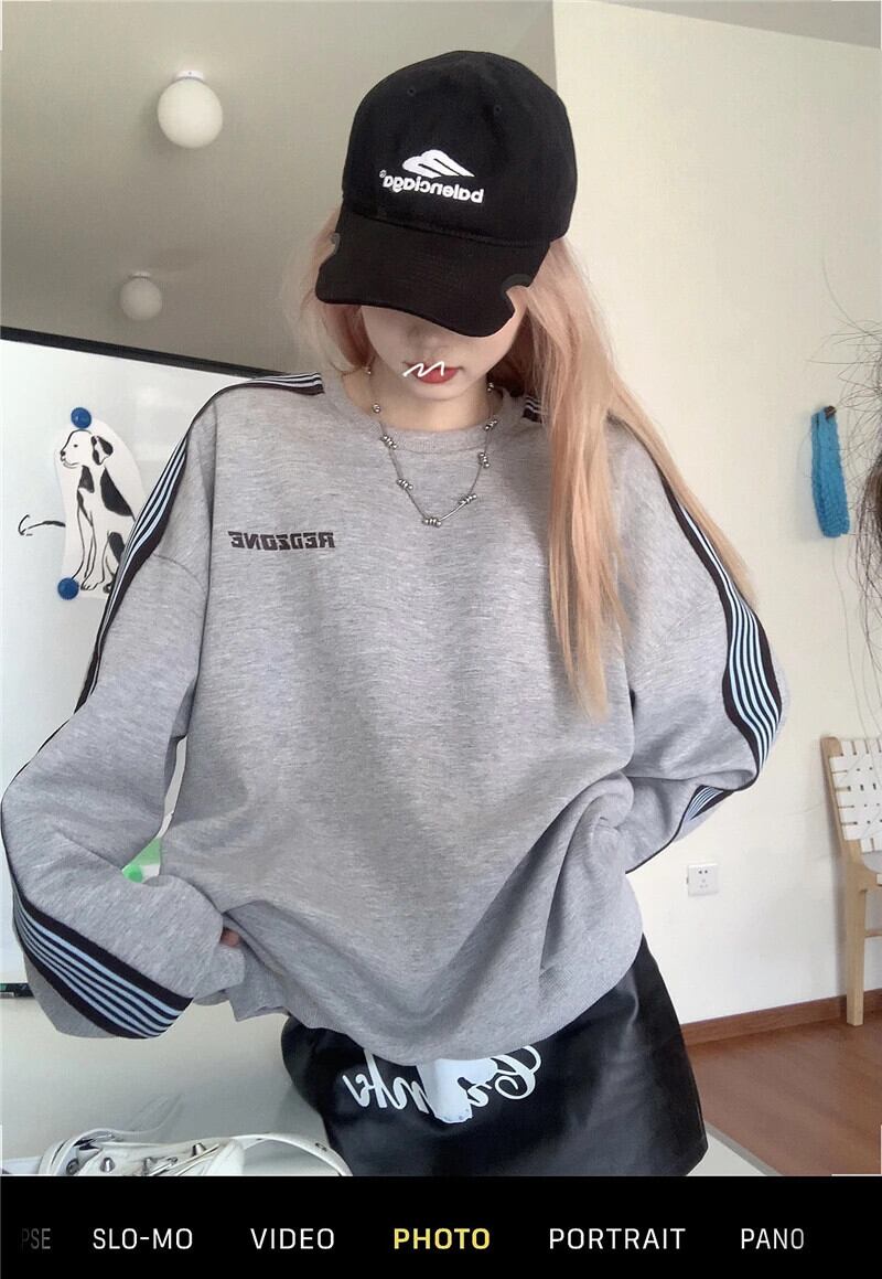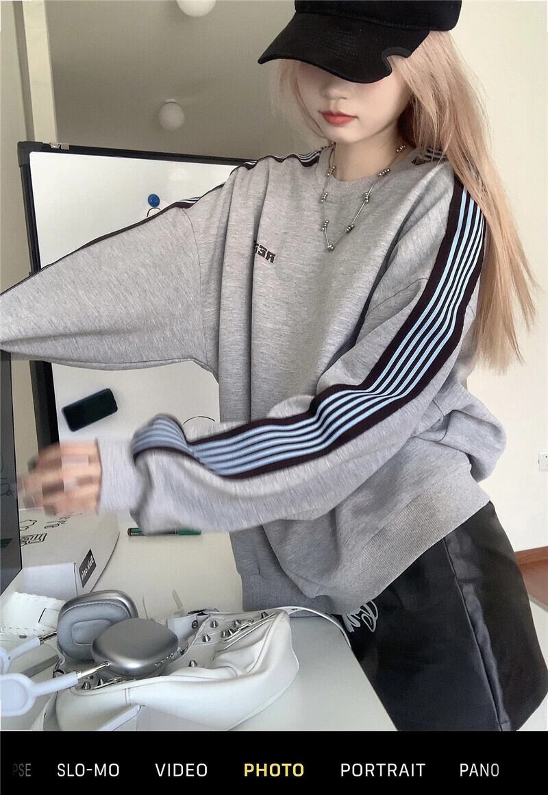 ホットガール O ネックコントラストカラー長袖ルーズスウェットシャツ初秋レタープリントストライププルオーバー ロング オータム 秋物 Oネック