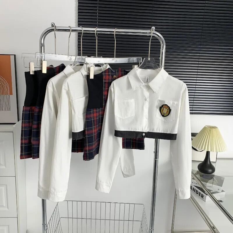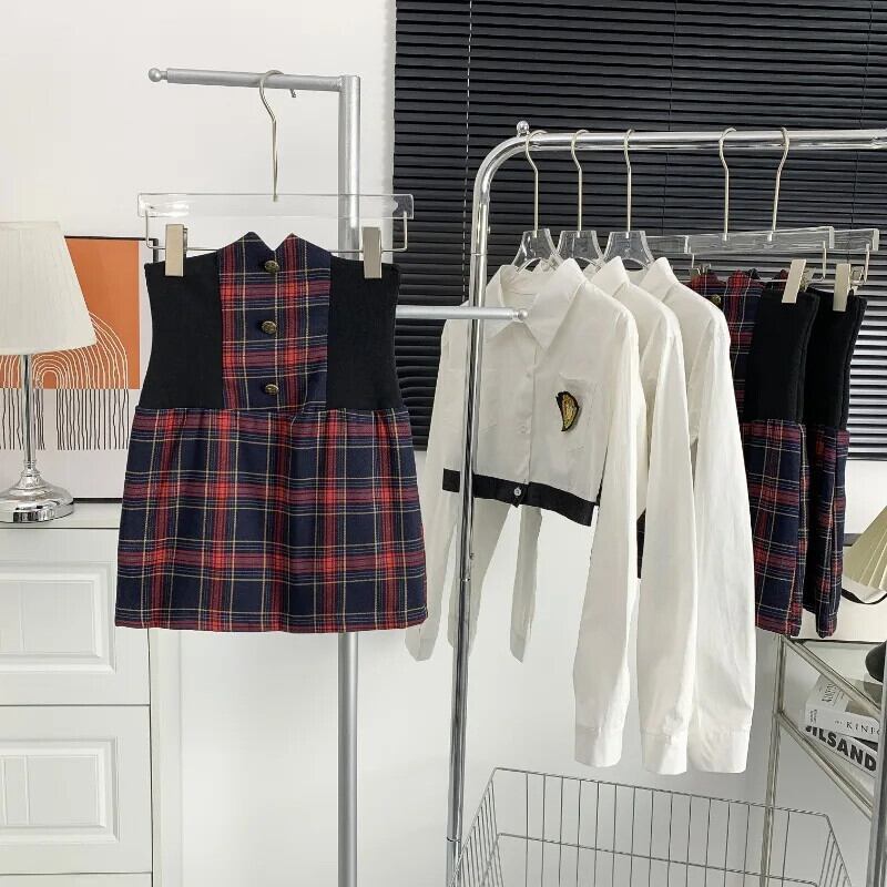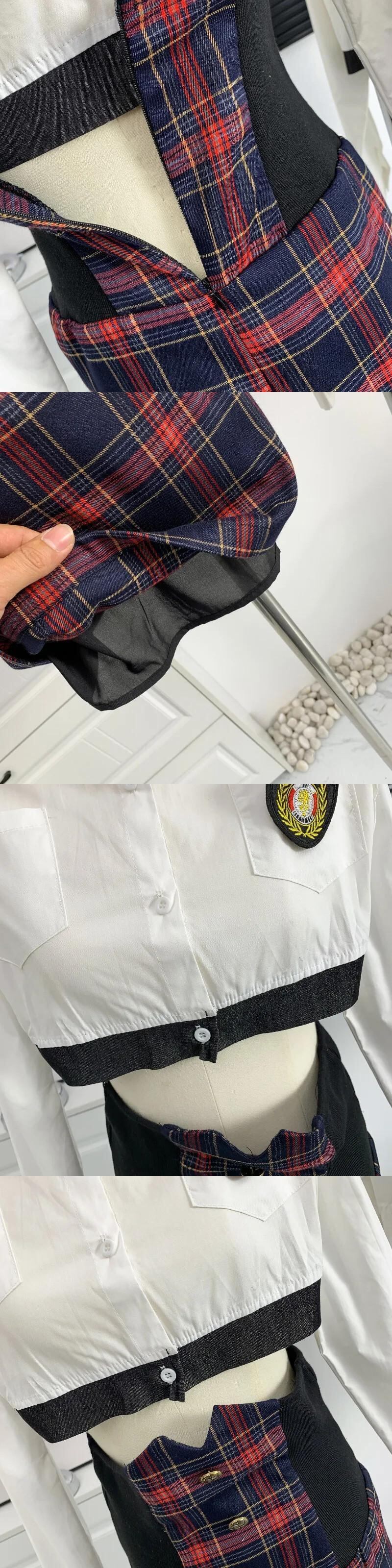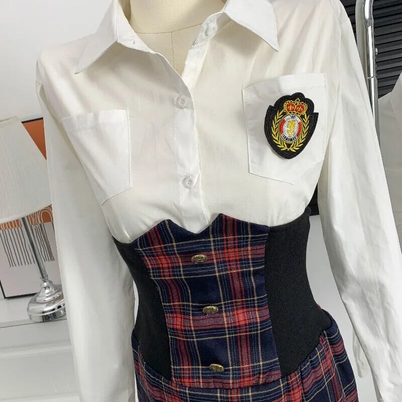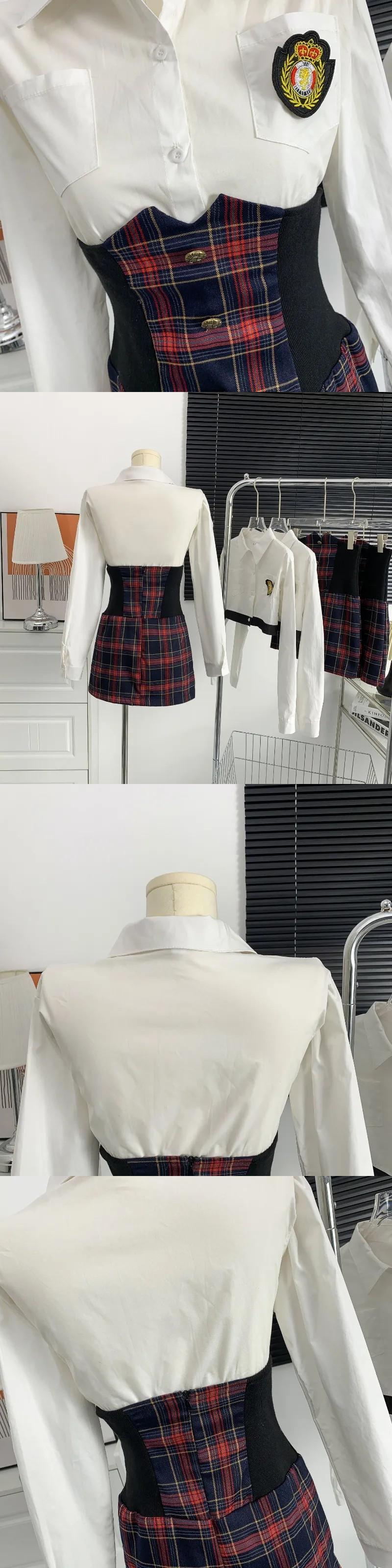スイートガールスタイルスーツ夏白シャツウエストパネルチェック柄ミニスカートツーピースセット ホワイト 大人ガーリー スウィート キュート カジュアル サマー 夏物