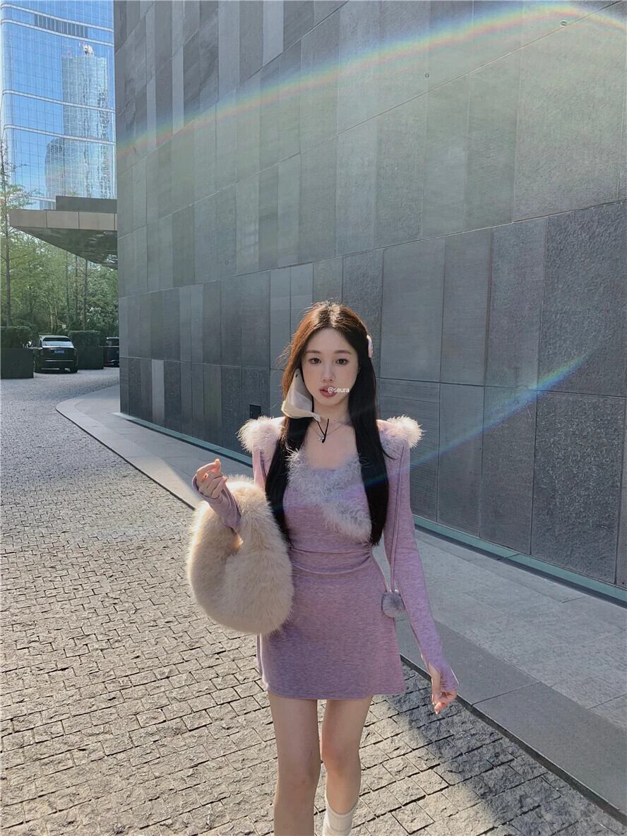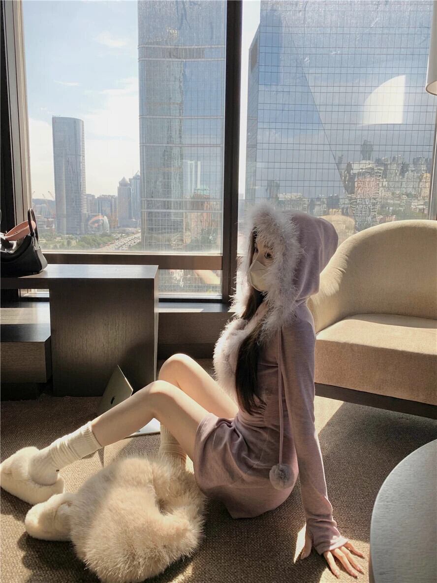 甘い女子純粋セクシースプライシングファーニットドレス秋と冬スリムフィット長袖フード付き A ラインショートドレス ロング 大人ガーリー スウィート キュート カジュアル オータム 秋物 ウィンター 冬物 Aライン ピュア