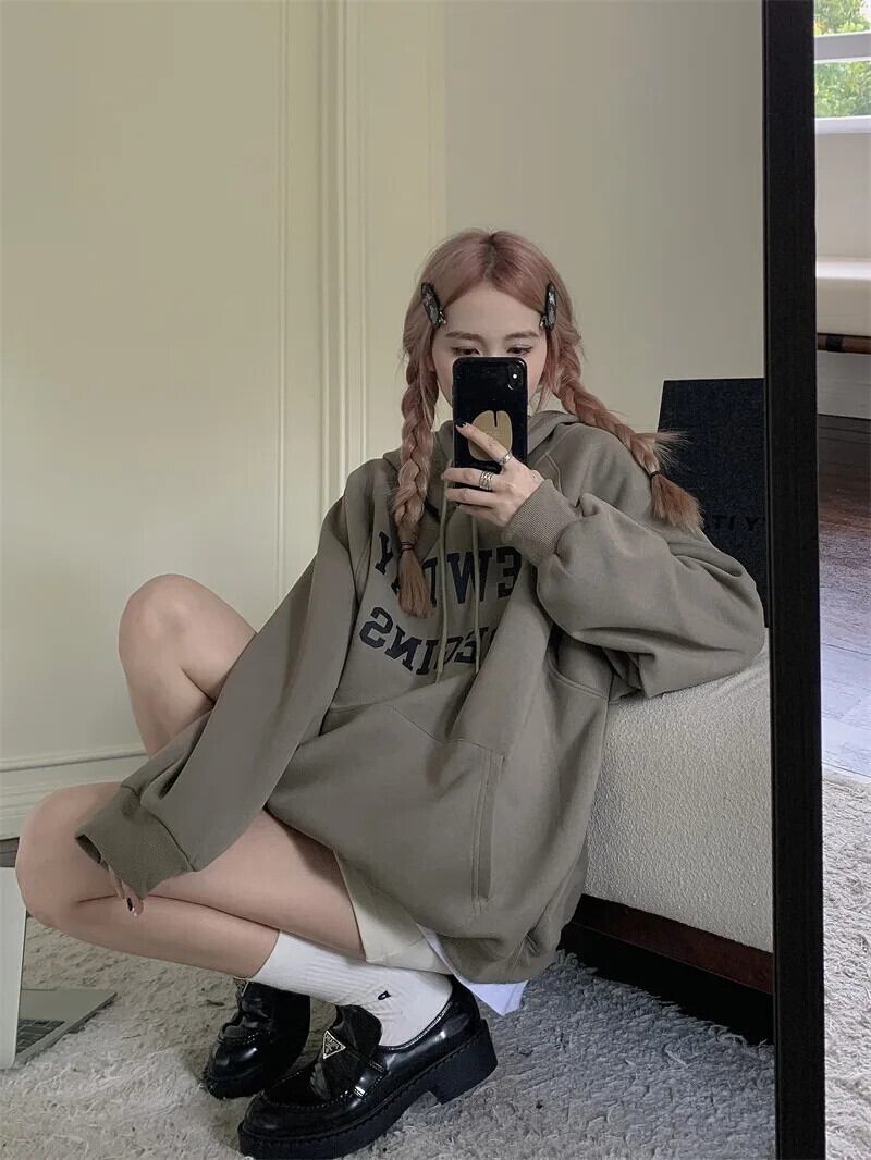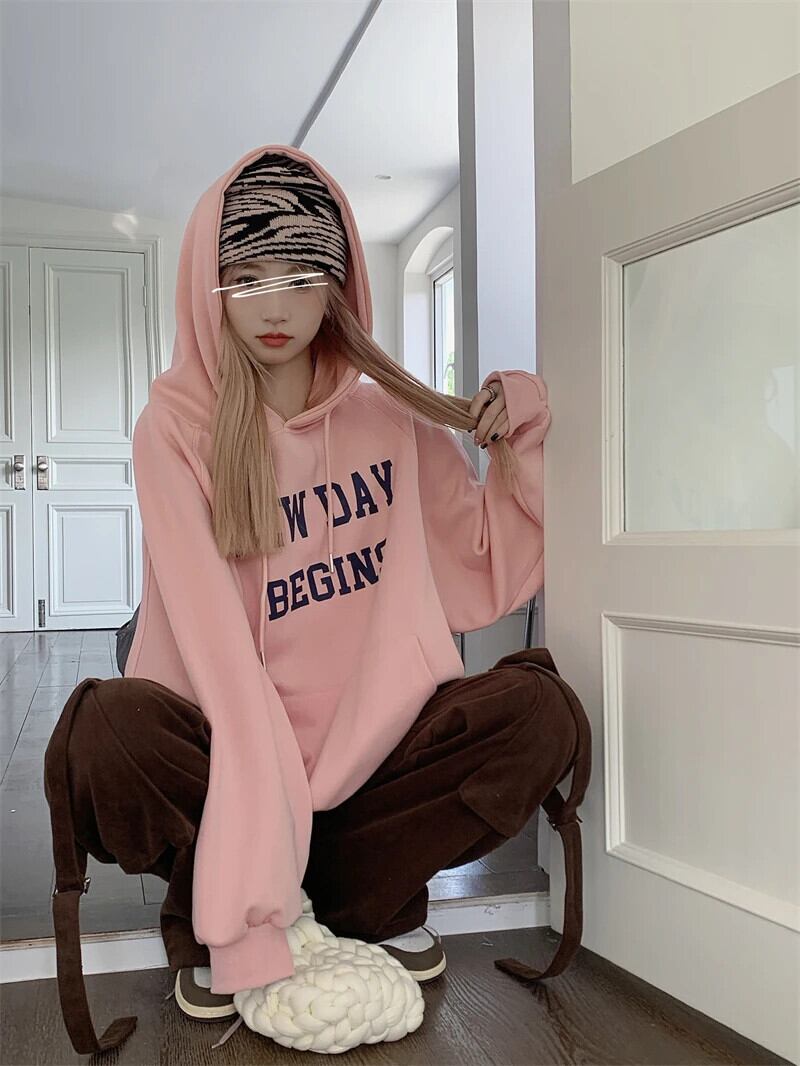 スタイルルーズフィットフード付き長袖トレーナー秋手紙プルオーバートップ ロング オータム 秋物