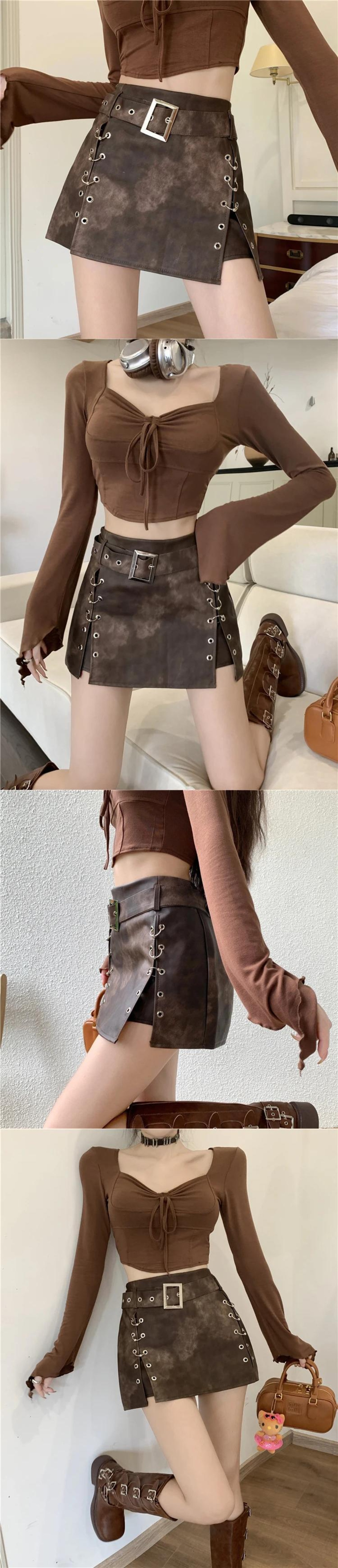 アメリカンレトロホットガールスカート秋ラップヒップレザースカートインク塗装ベルト A ラインミニスカート オータム 秋物 ハーネス Aライン
