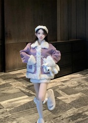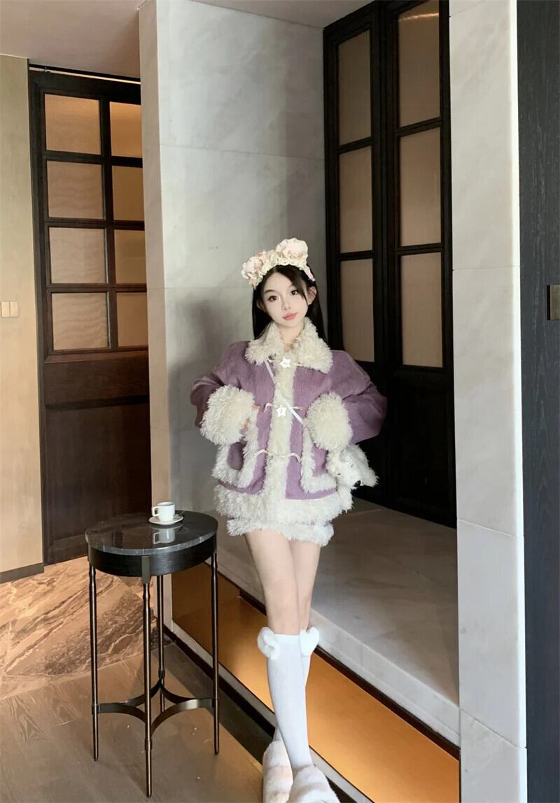 スイートホットガールパープルスーツターンダウン襟スプライスファーコート A ラインショートスカート 2 点セット 大人ガーリー スウィート キュート カジュアル Aライン