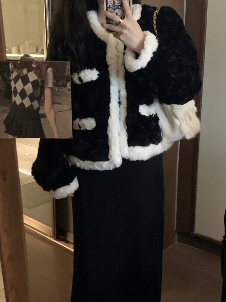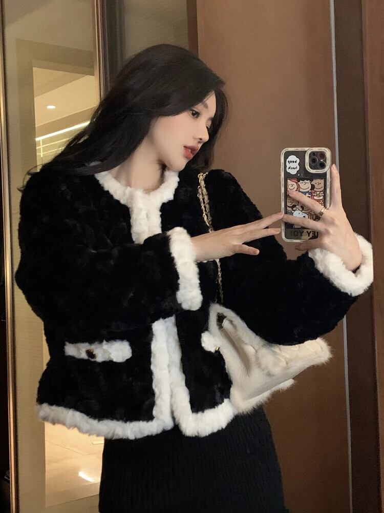 Sweet Girl レトロコントラストフリースショートコート秋/冬厚い O ネック長袖ルーズジャケット ロング 大人ガーリー スウィート キュート カジュアル オータム 秋物 ウィンター 冬物 Oネック