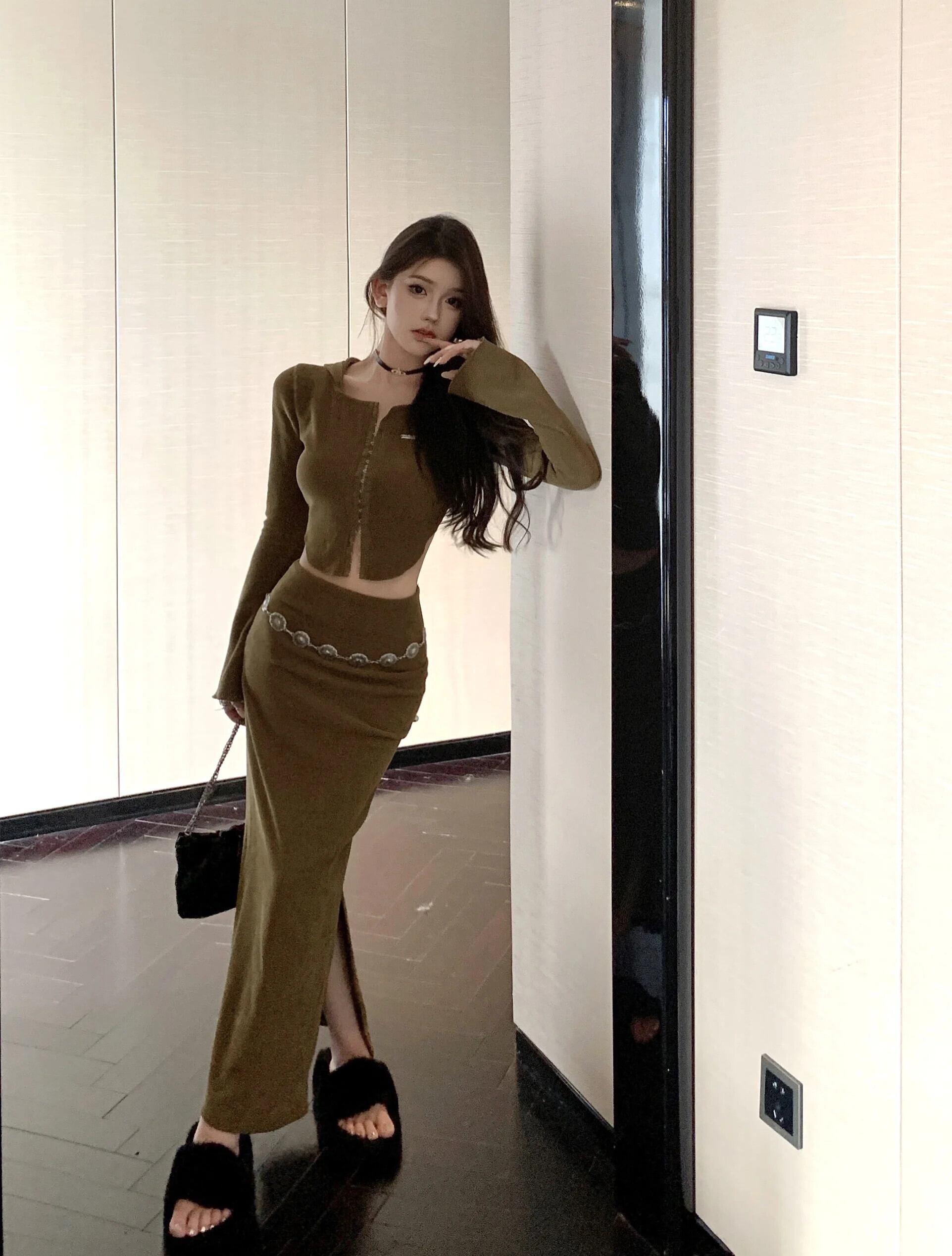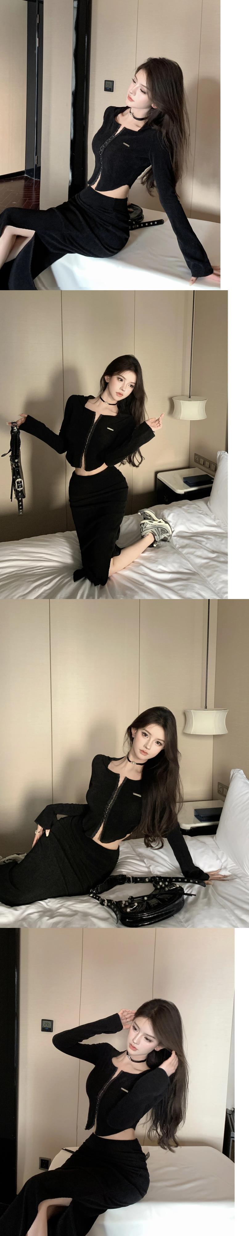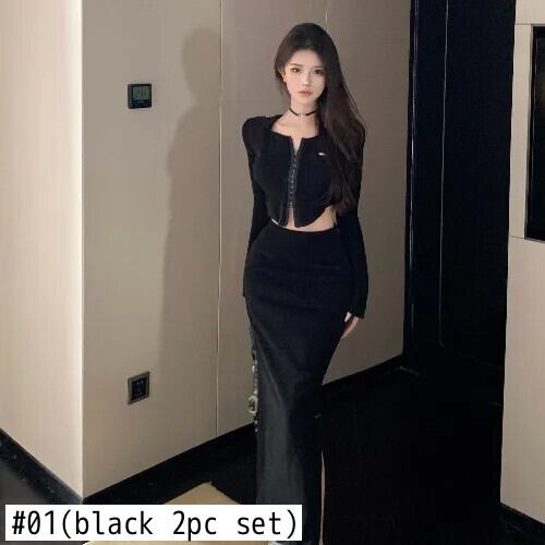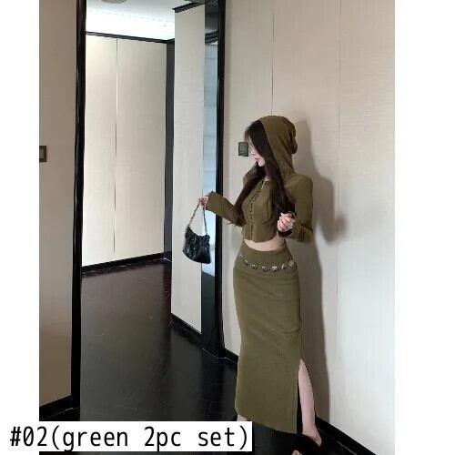 ホットガールレトロスタイルスーツ秋長袖フード付きショートトップウエストロングスカート 2 点セット オータム 秋物