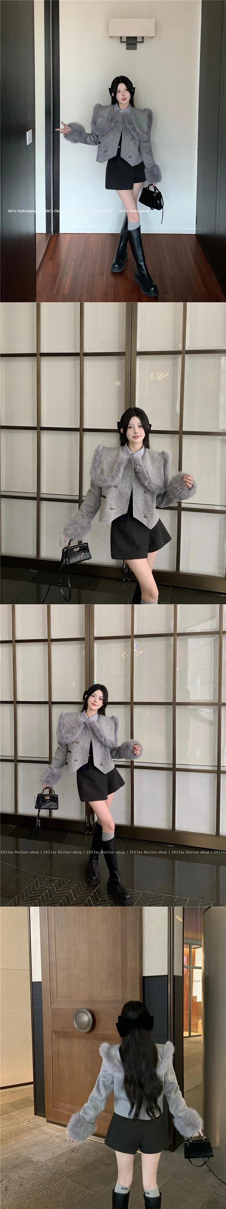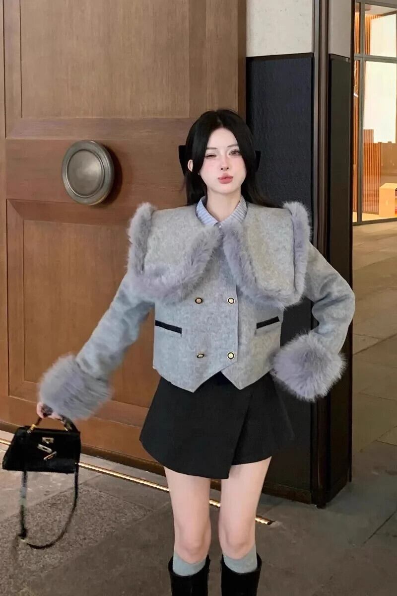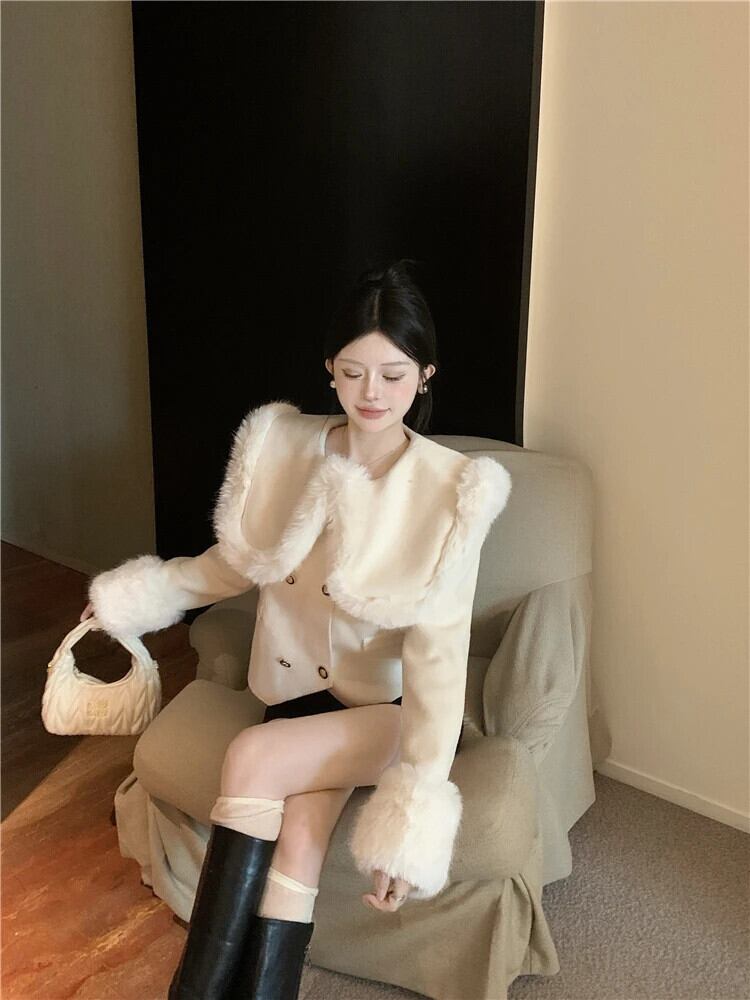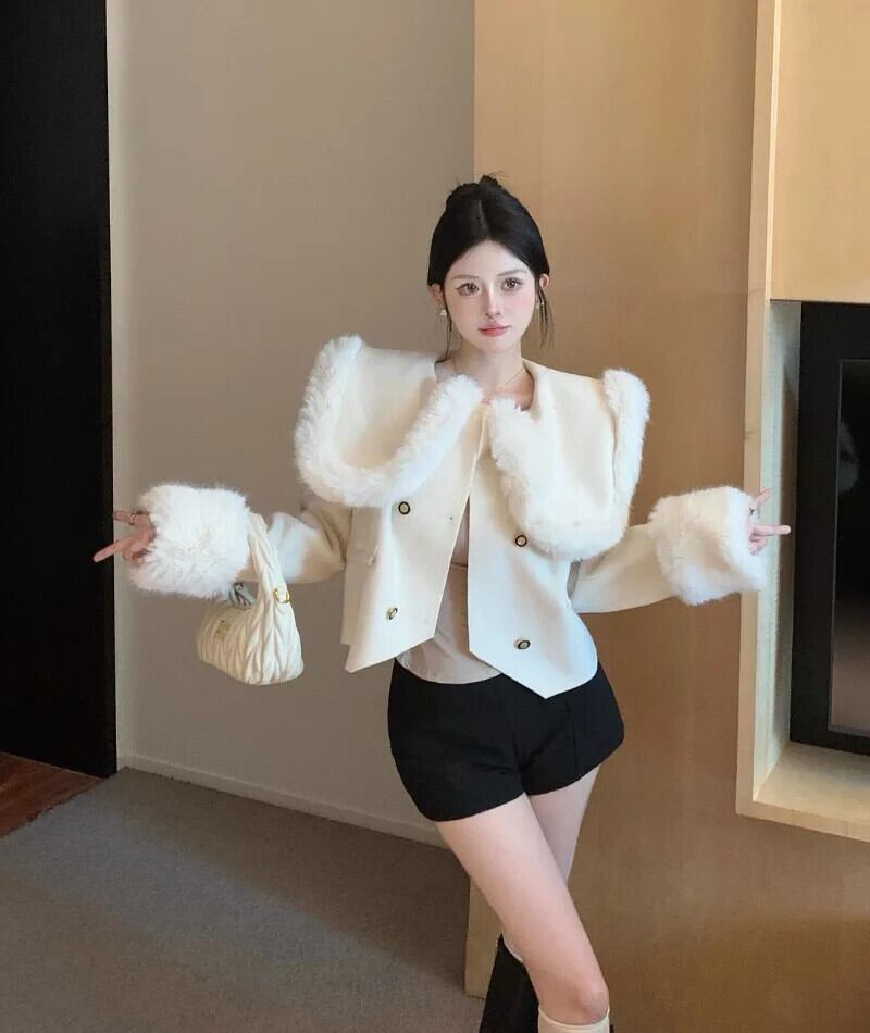 フレンチスタイル甘いホットガールフェイクファーコート冬ターンダウン襟ルーズショートスプライシングフリーストップ 大人ガーリー スウィート キュート カジュアル ウィンター 冬物