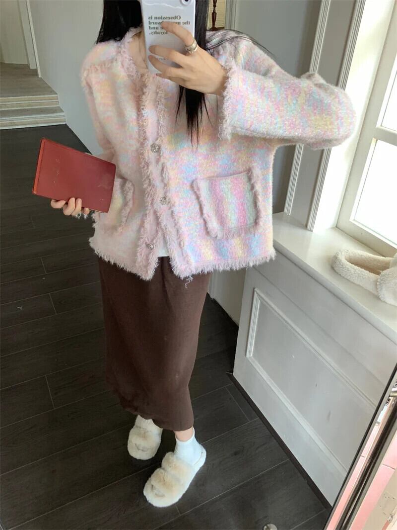 甘いホットガールカラフルテルニットカーディガン秋 O ネック長袖ルーズセータージャケット ロング 大人ガーリー スウィート キュート カジュアル オータム 秋物 Oネック