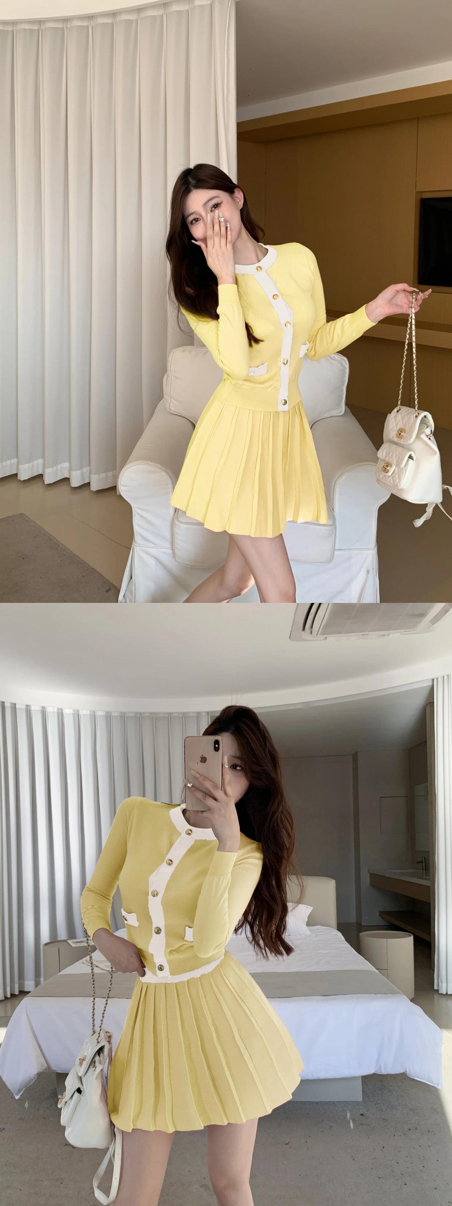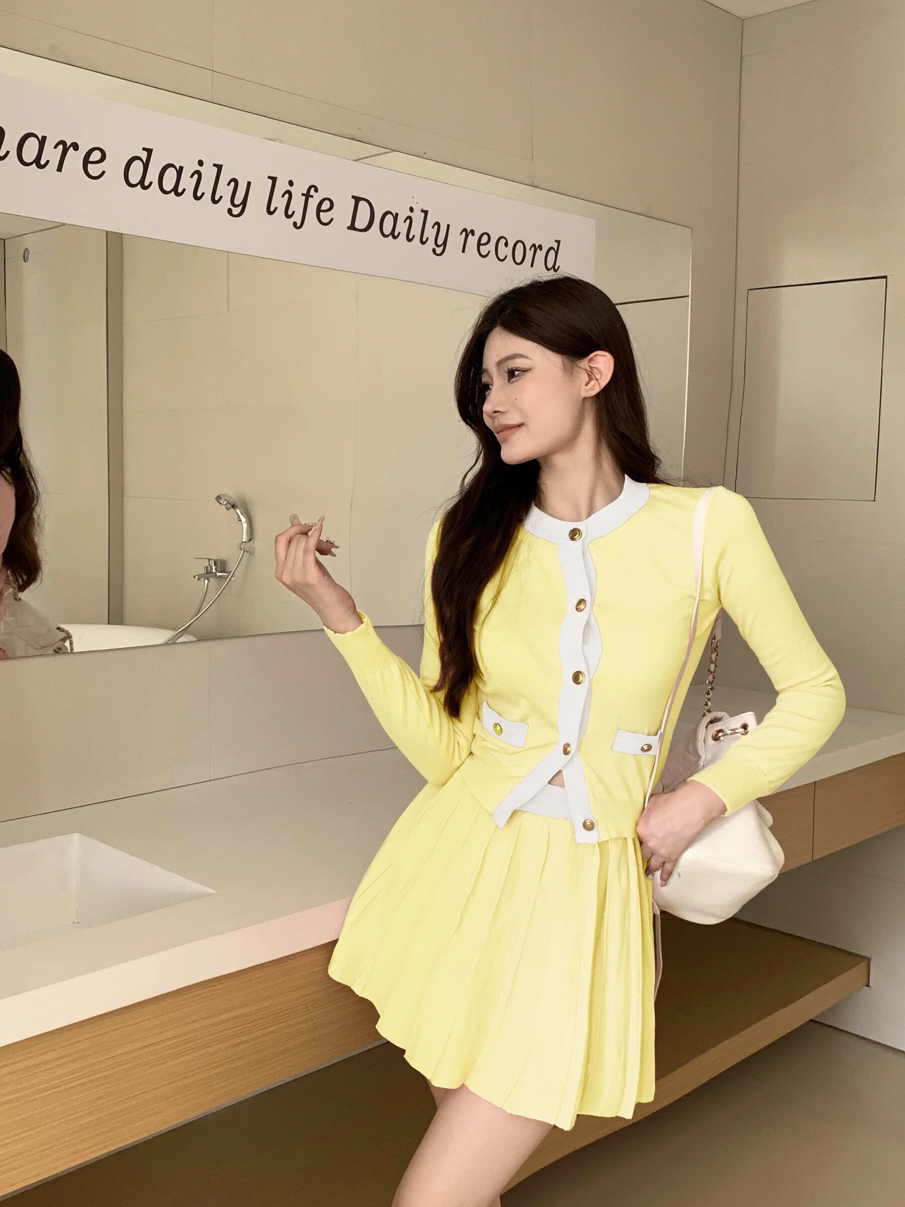 Sweet Girl ニットスーツ レディース 秋 半袖 ルーズ カーディガン ウエスト プリーツ ミニスカート 2点セット 大人ガーリー スウィート キュート カジュアル オータム 秋物