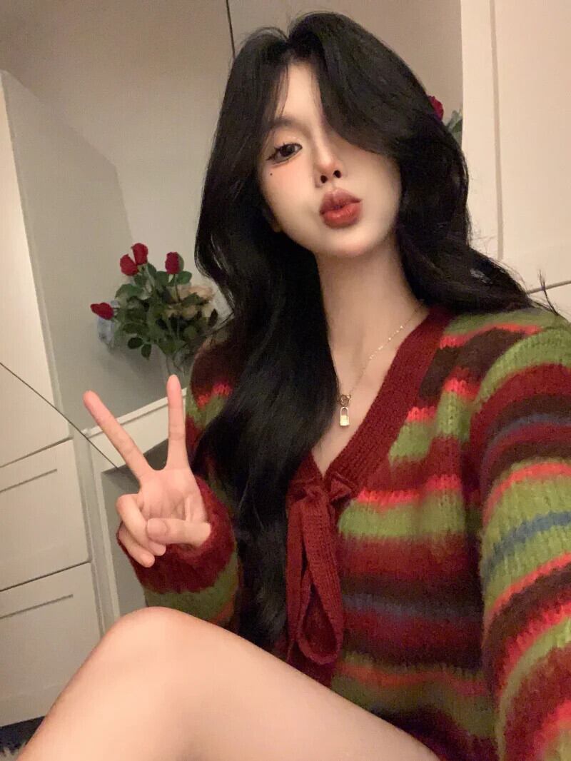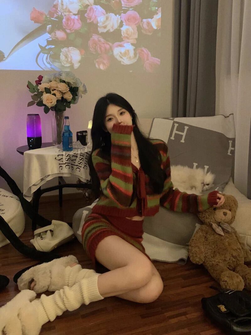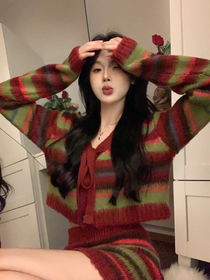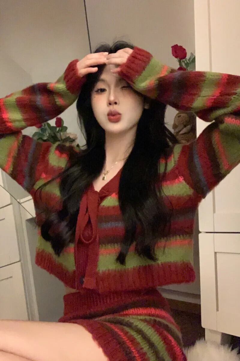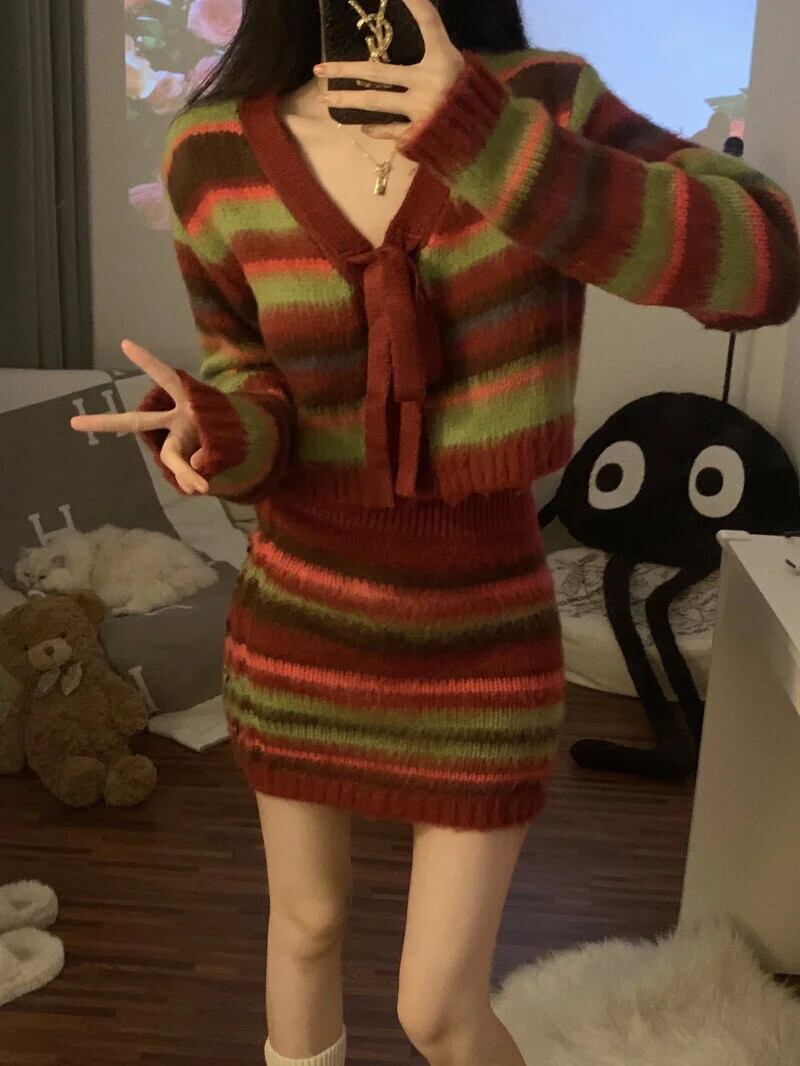 Sweet Girl 香港スーツ レディース 秋ストライプ レースアップ ニット カーディガン ウエストラップ ヒップ スカート 2点セット 大人ガーリー スウィート キュート カジュアル オータム 秋物