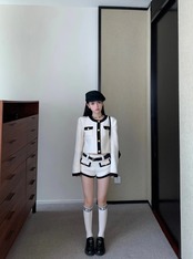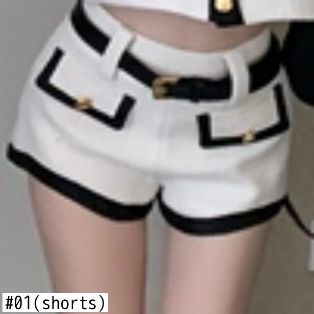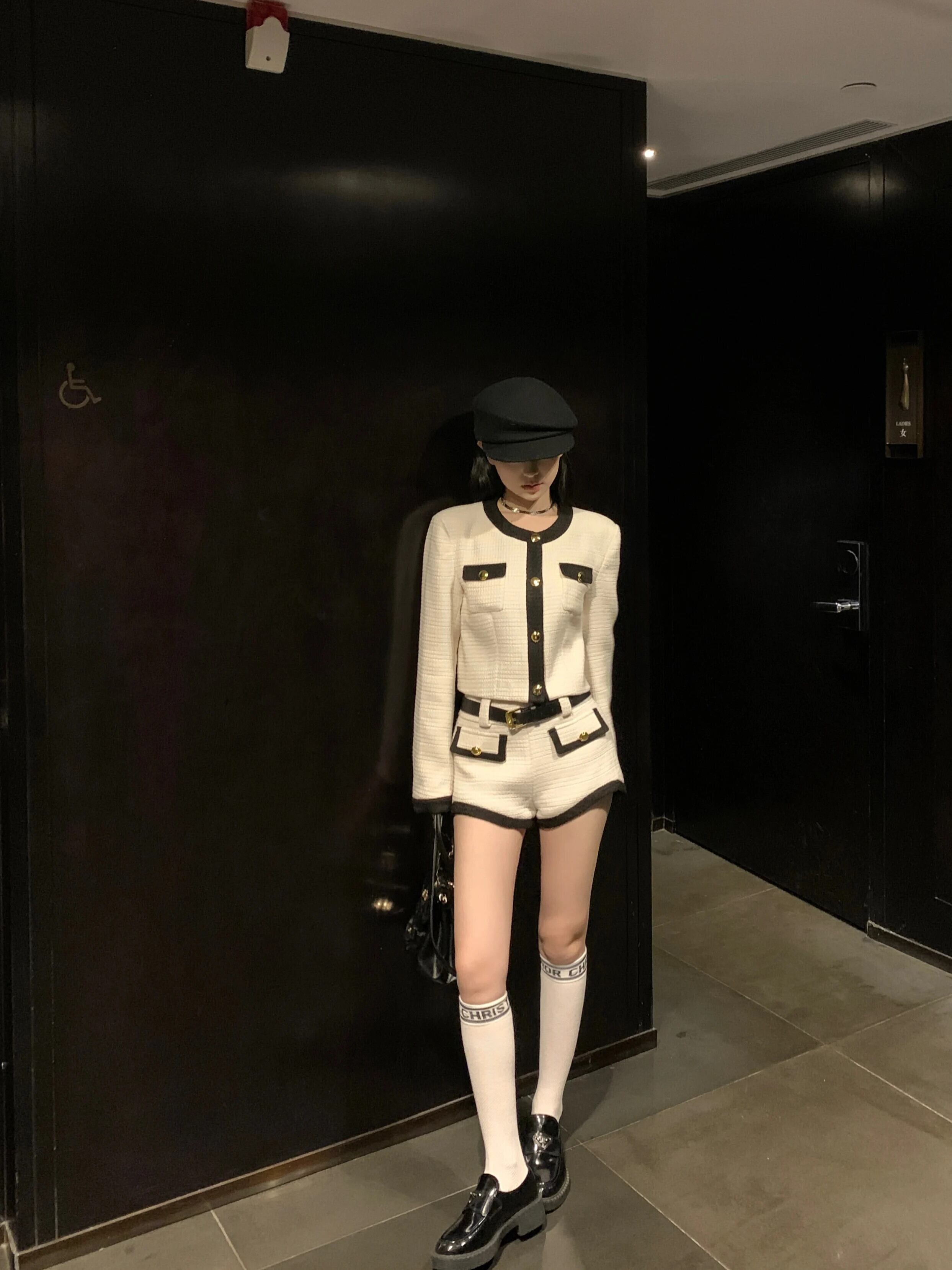 甘いホットガールスーツ秋ツイード O ネック長袖ジャケットウエストルーズショーツ 2 点セット ロング 大人ガーリー スウィート キュート カジュアル オータム 秋物 ブルマー Oネック