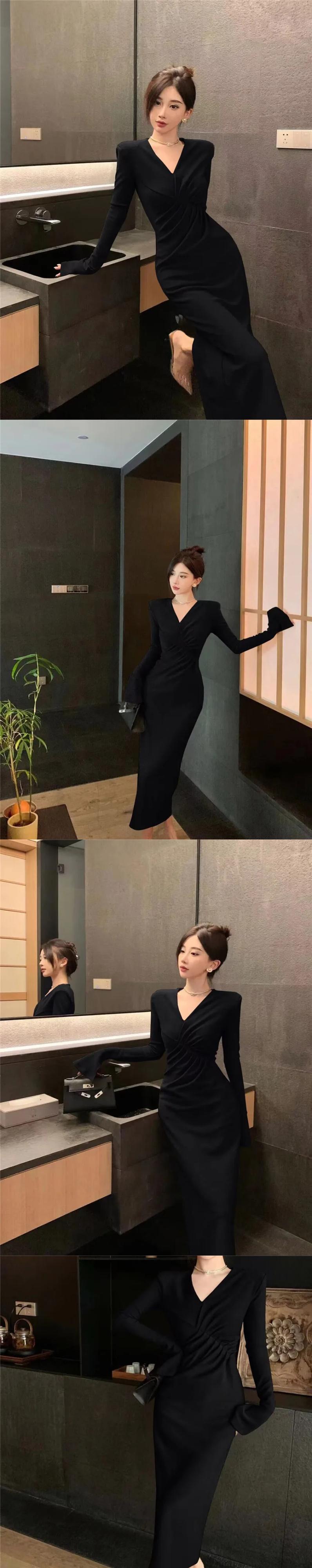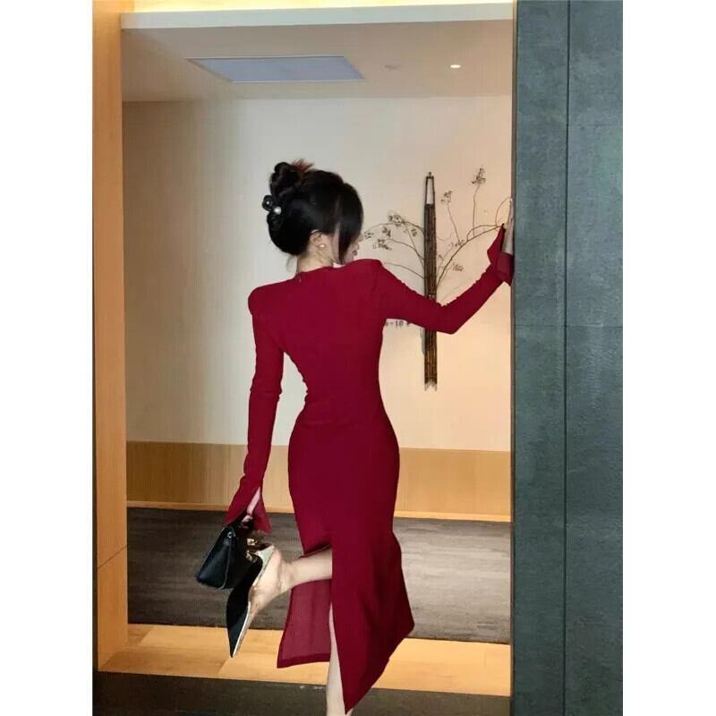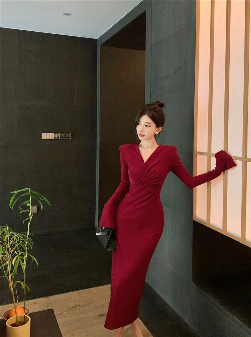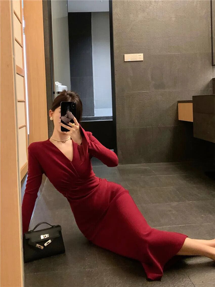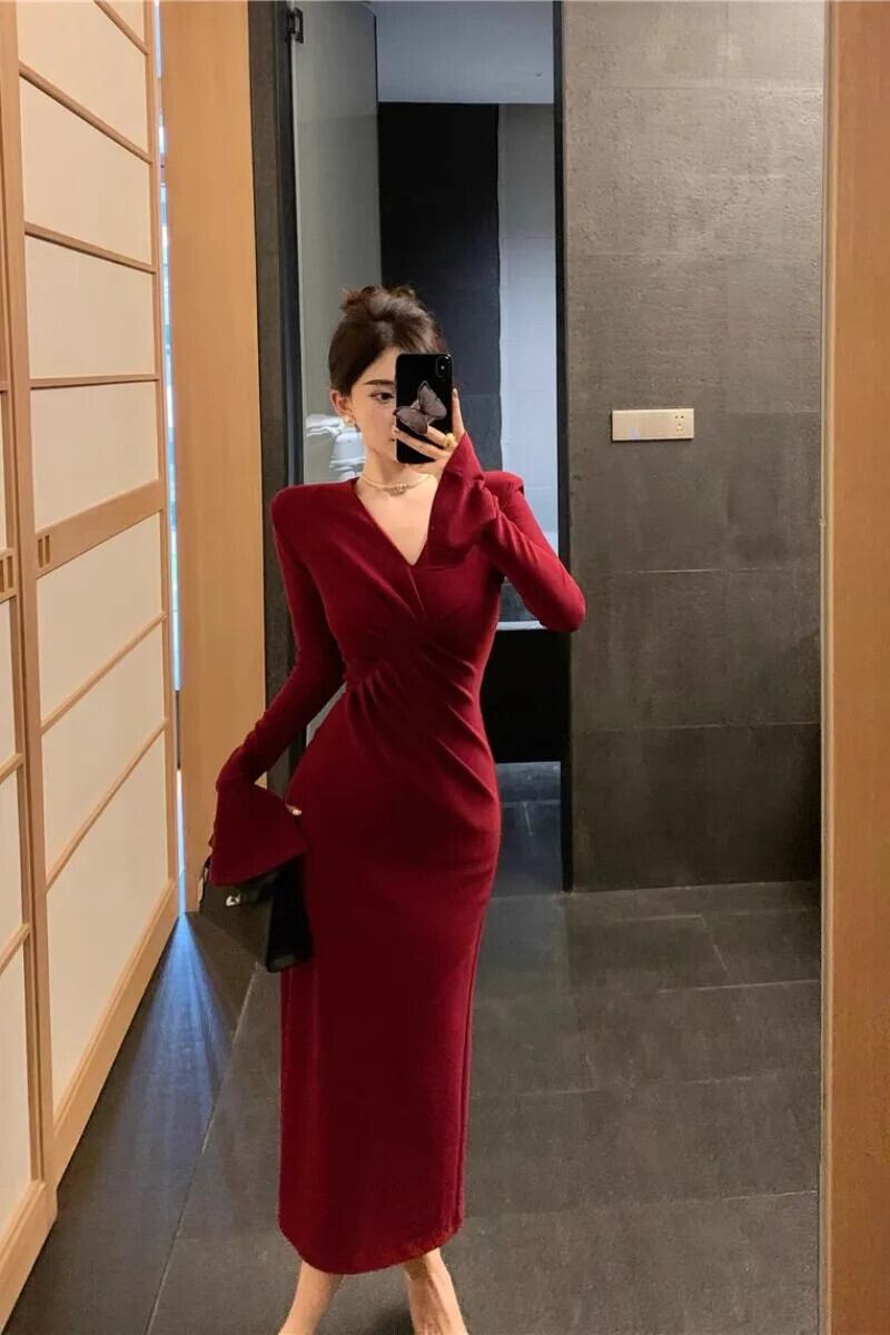 甘いホットガール V ネックフレアスリーブドレス秋スリムフィットスプリットラップヒップロングドレス 大人ガーリー スウィート キュート カジュアル オータム 秋物 Vネック