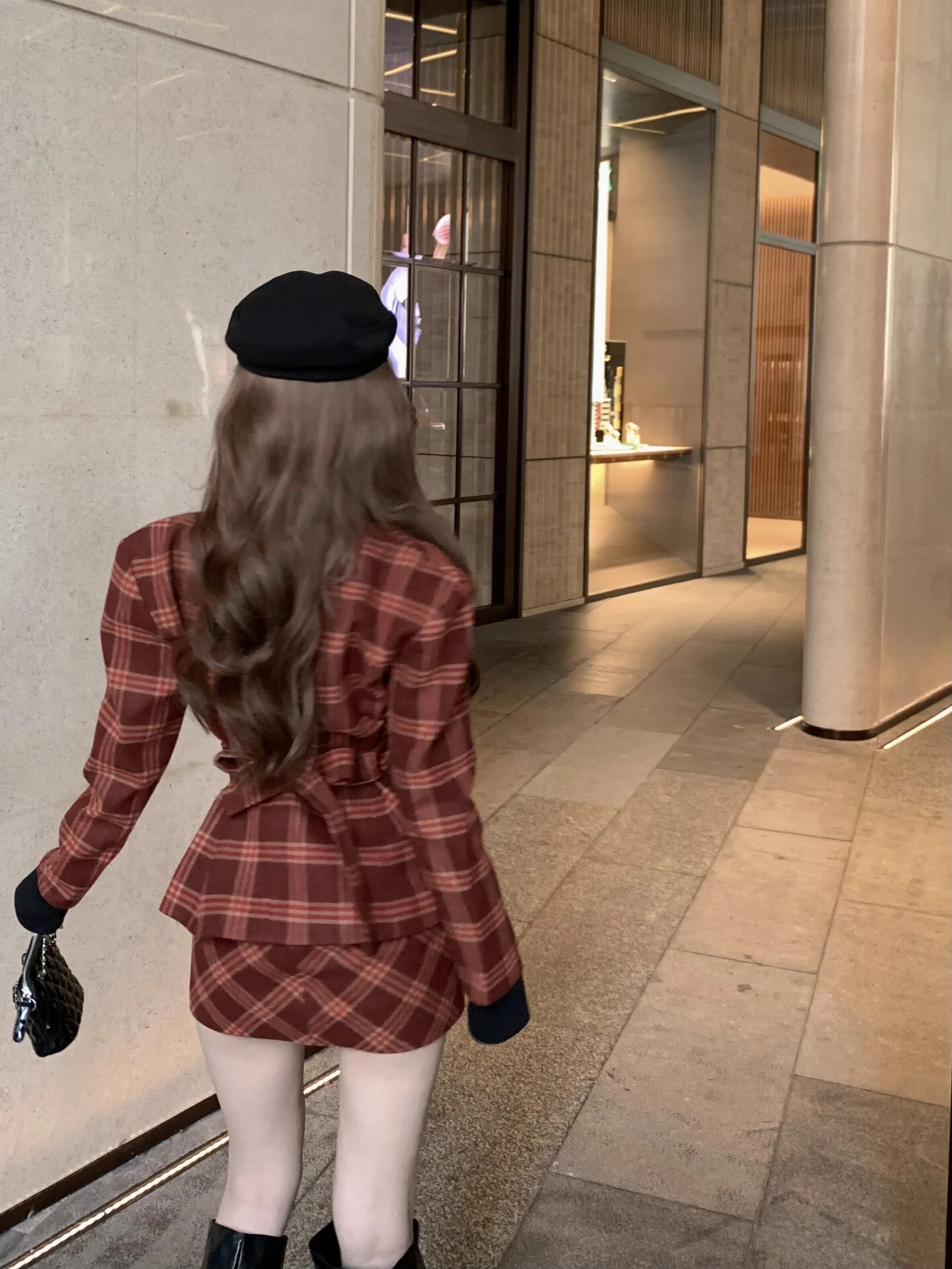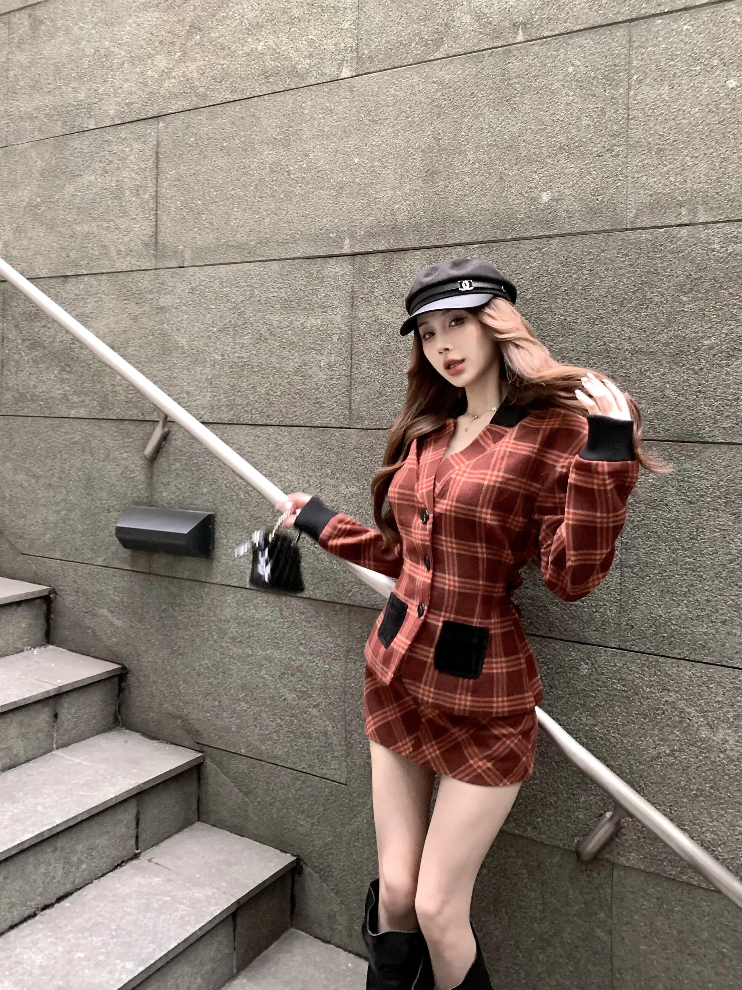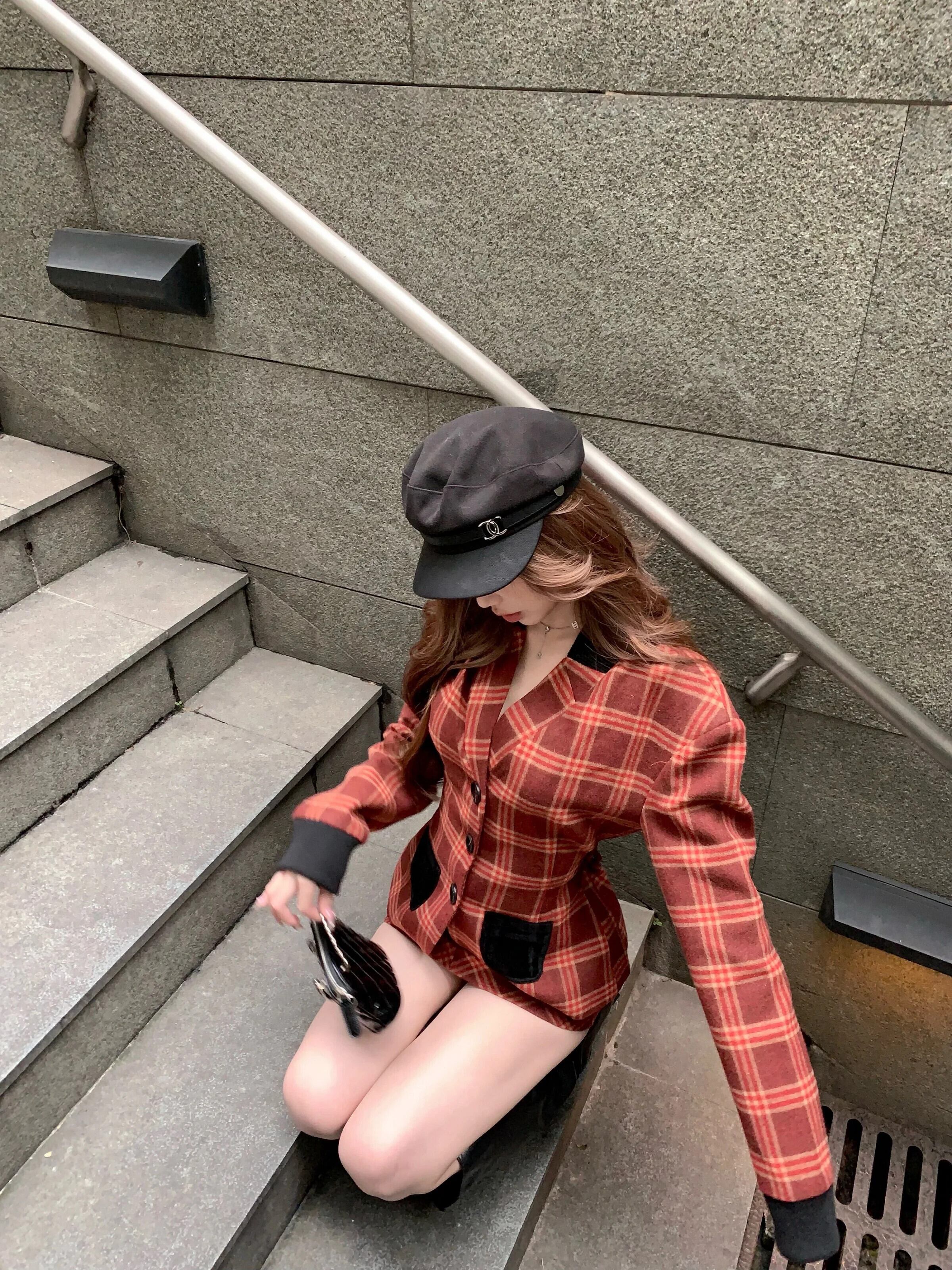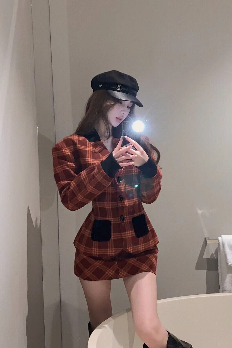 スイートガールスタイルスーツ秋レトロチェック柄長袖ジャケットスリムミニスカートツーピースセット ロング 大人ガーリー スウィート キュート カジュアル オータム 秋物
