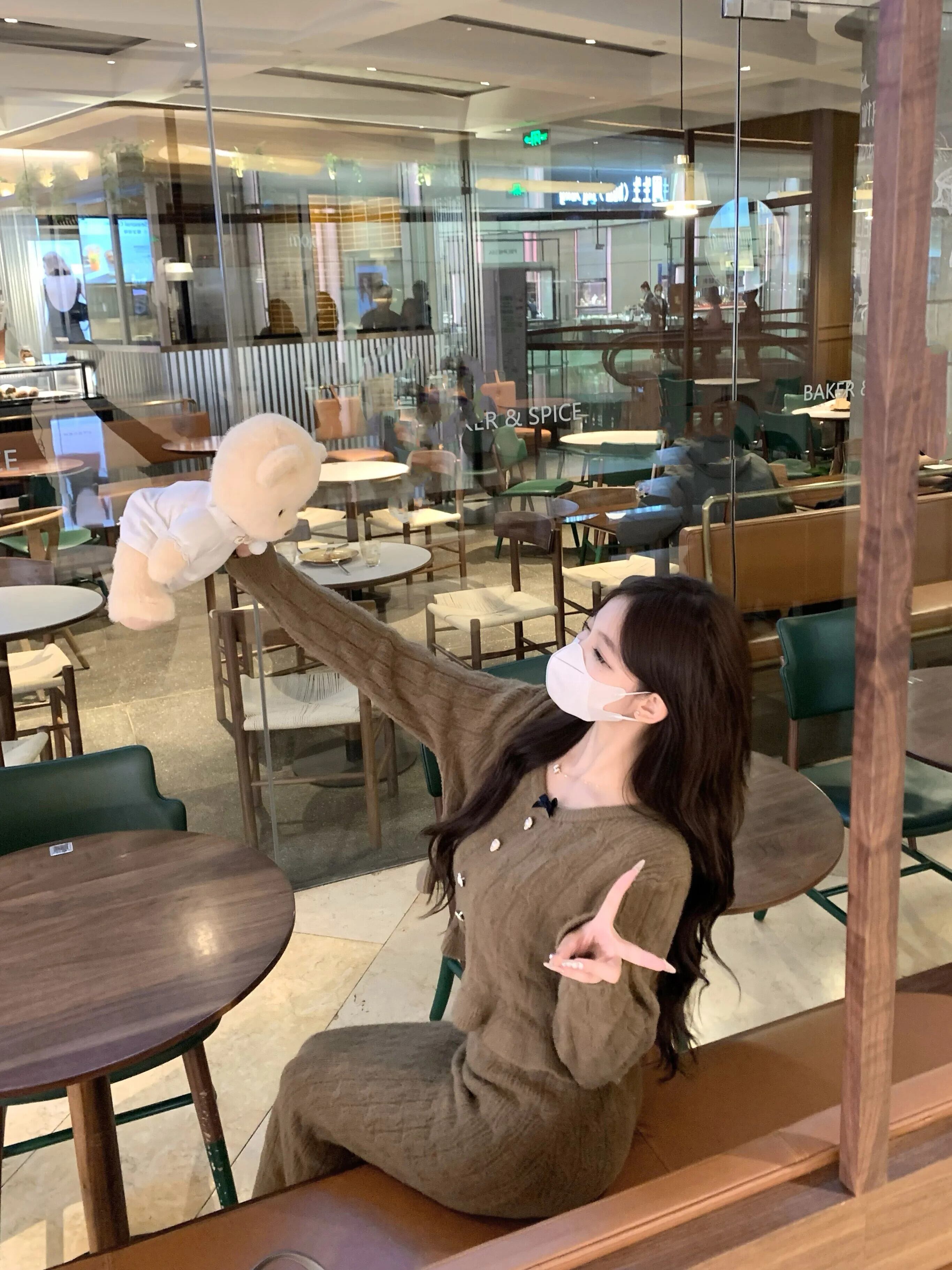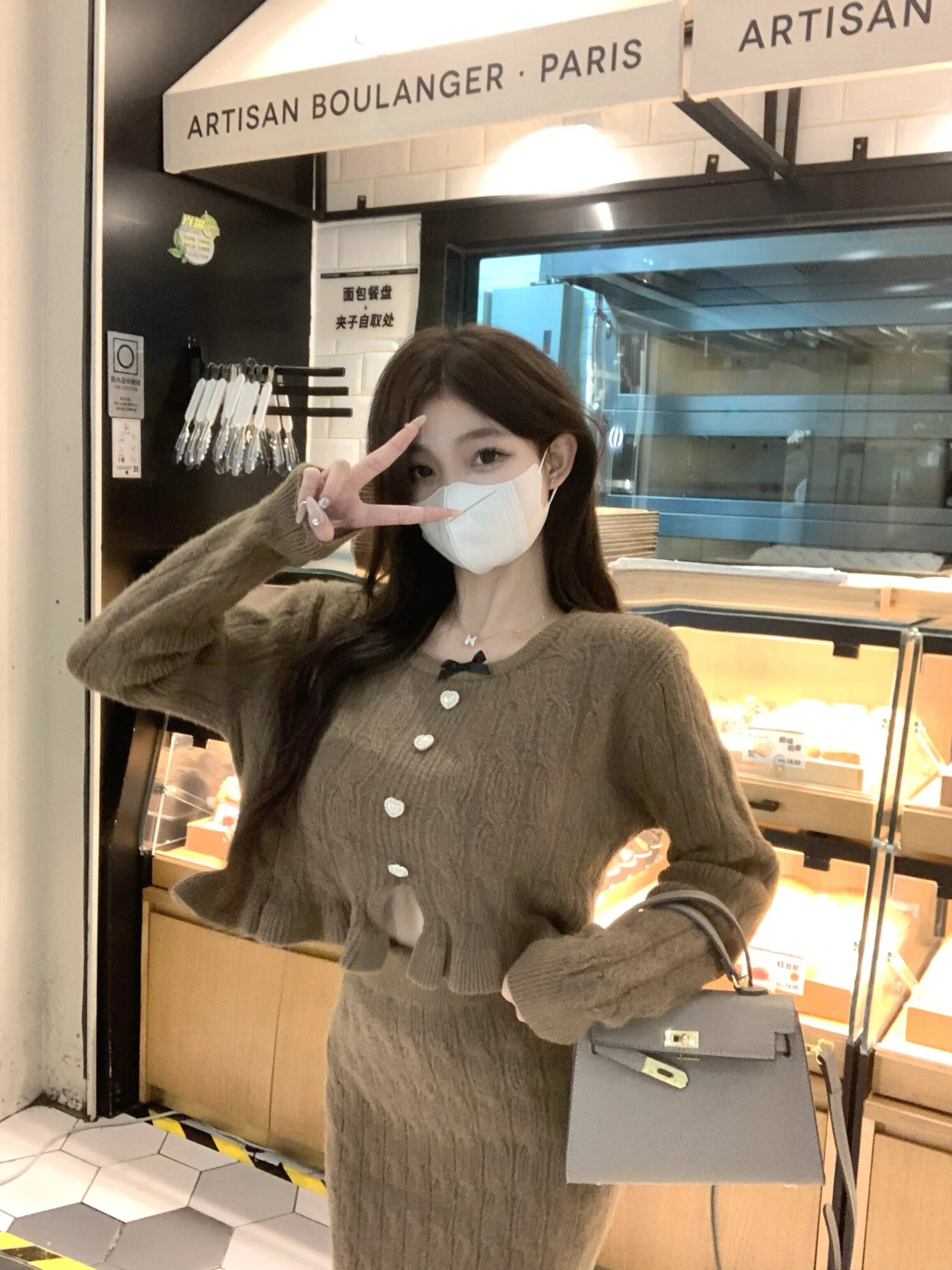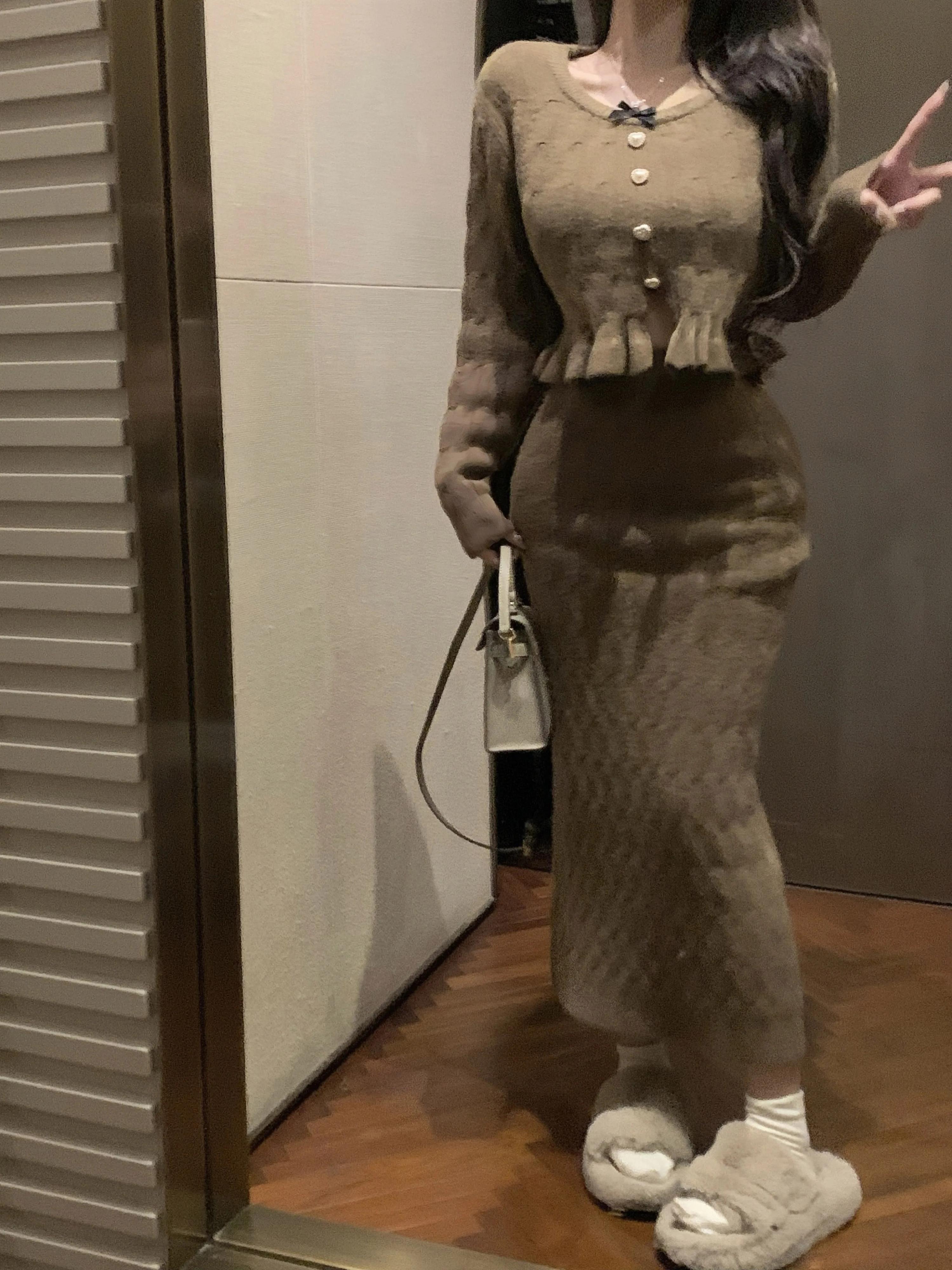 フレンチスイートガールメイラードスタイルニットスーツ秋Oネックカーディガンスプリットスカートツーピースセット 大人ガーリー スウィート キュート カジュアル オータム 秋物