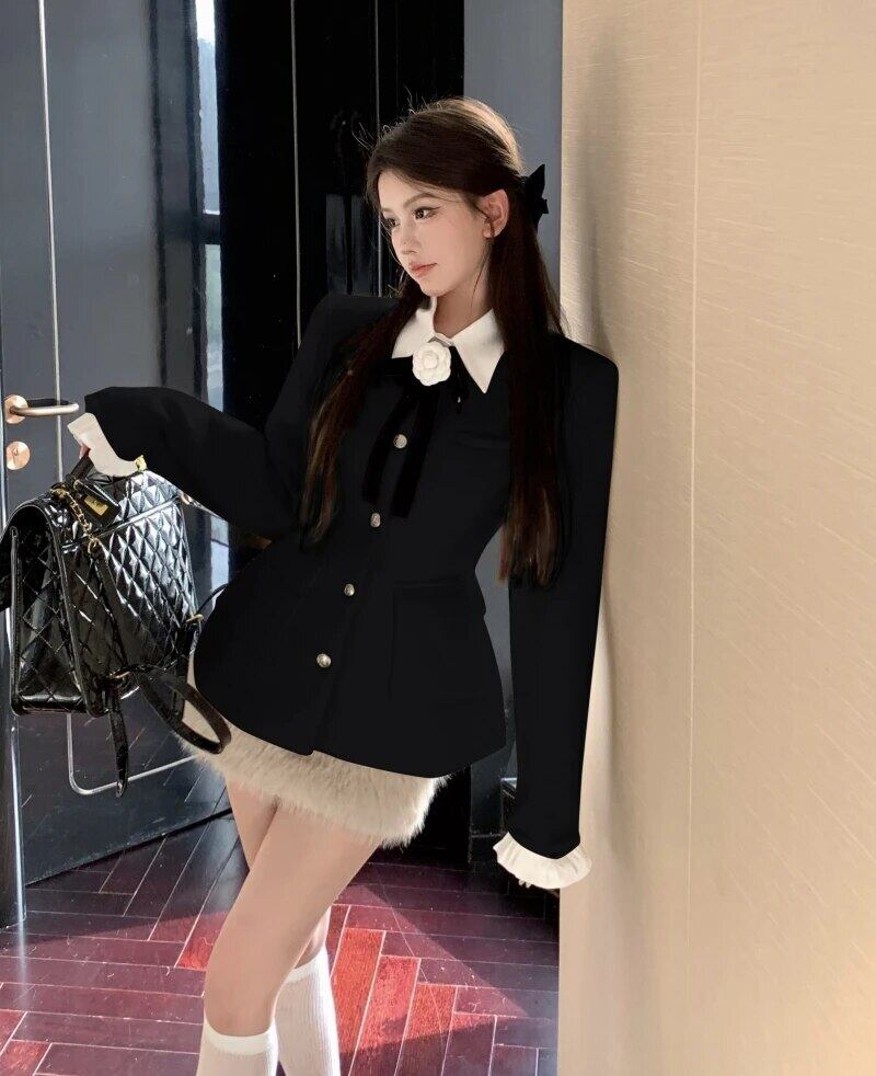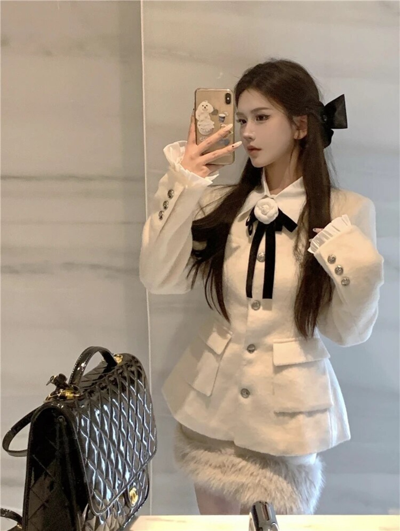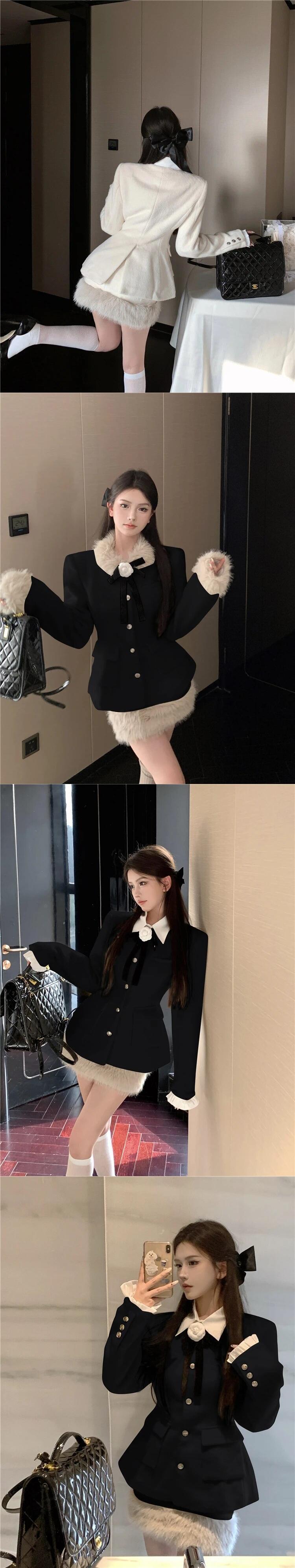 Sweet Girl プレッピースタイルスーツ秋取り外し可能毛皮襟コートウエストミニスカート 2 点セット 大人ガーリー スウィート キュート カジュアル オータム 秋物
