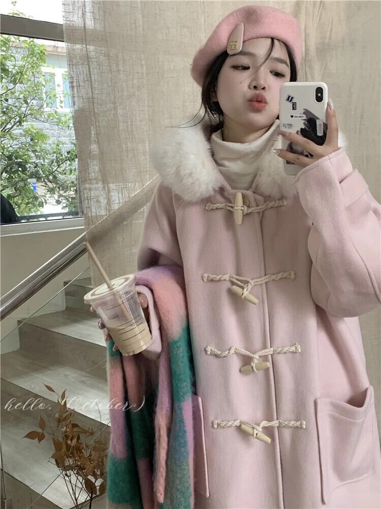 Sweet Girls' ホーンボタンウールコート秋と冬ルーズリラックス膝丈フード付きカーディガン 大人ガーリー スウィート キュート カジュアル オータム 秋物 ウィンター 冬物
