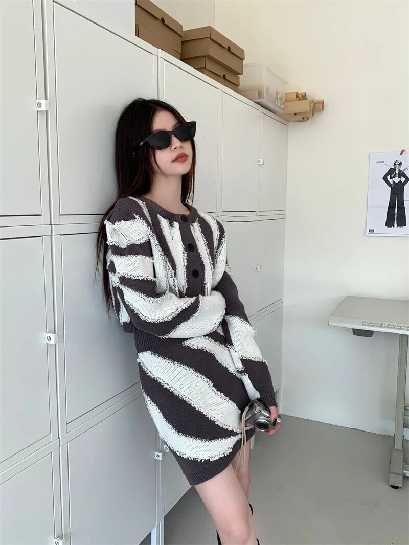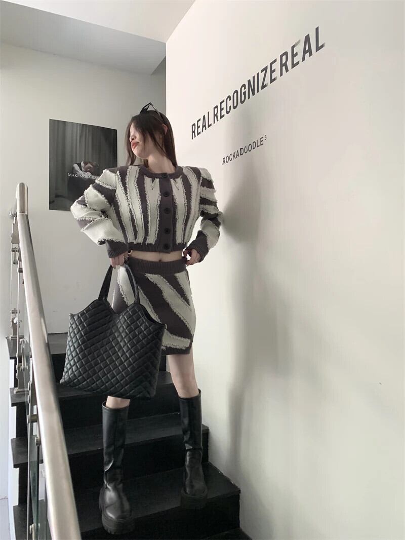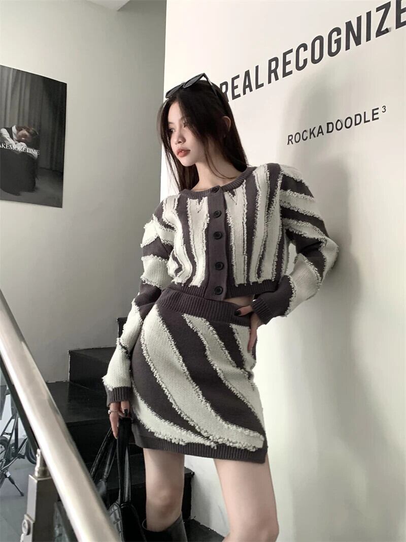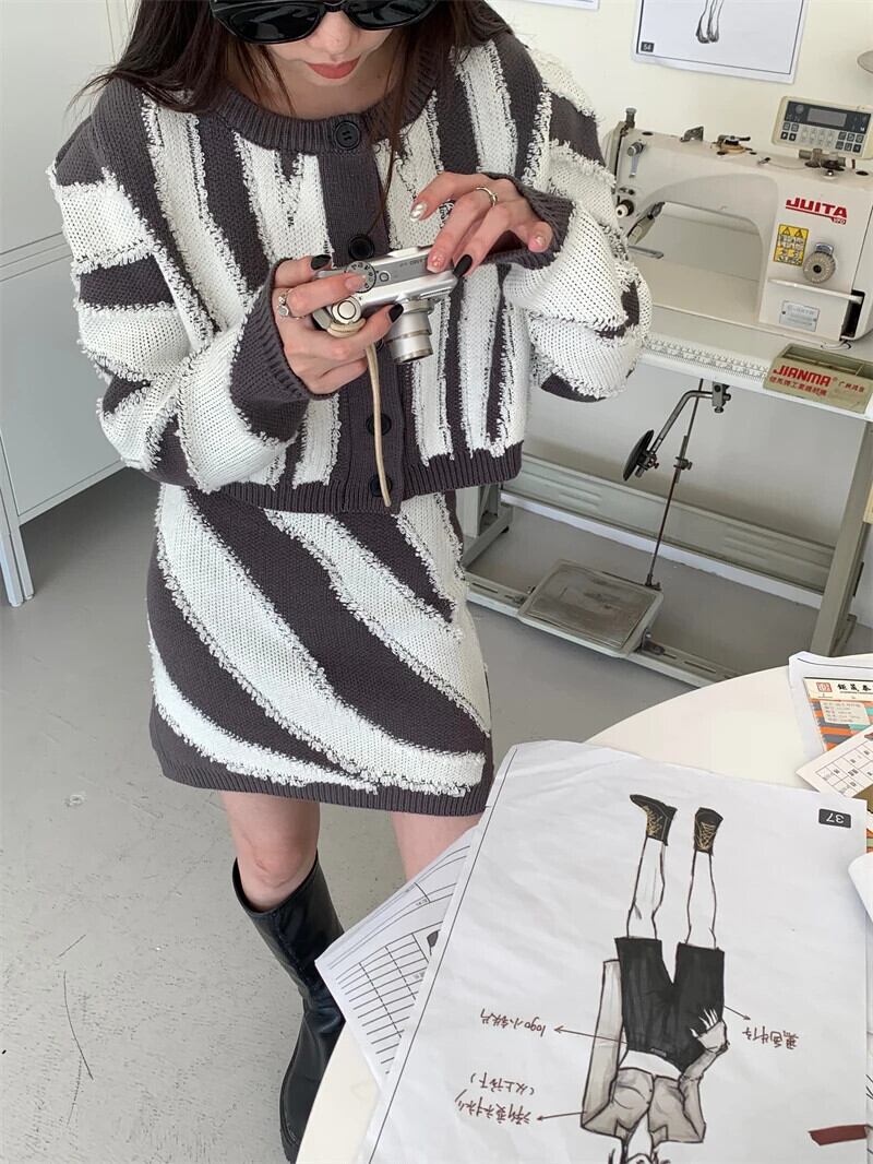 ストライプスーツ秋 O ネック肥厚ニットカーディガンウエストミニスカート 2 点セット オータム 秋物 Oネック