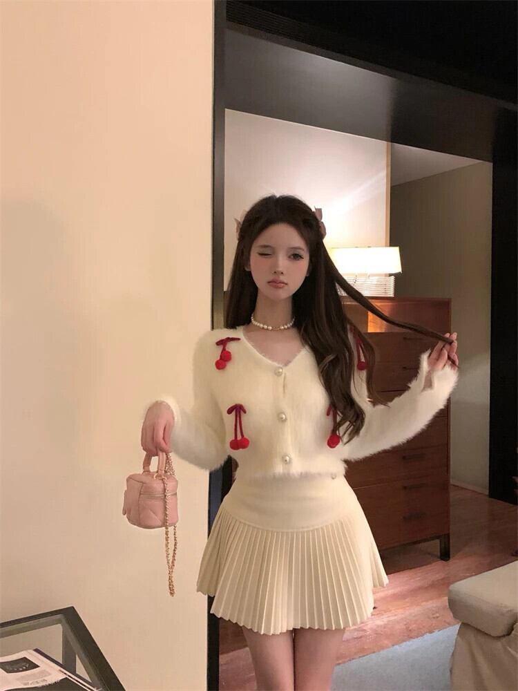 Sweet Girl スーツ レディース 秋冬 チェリーショート ニット カーディガン ウエスト プリーツ スカート 2点セット 大人ガーリー スウィート キュート カジュアル オータム 秋物 ウィンター 冬物