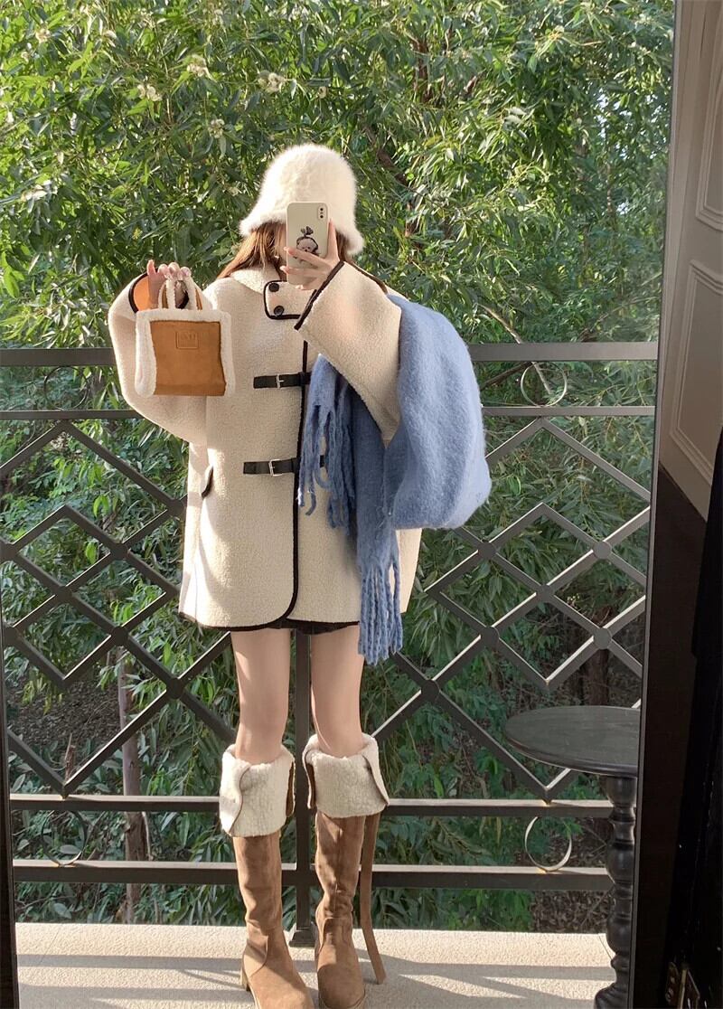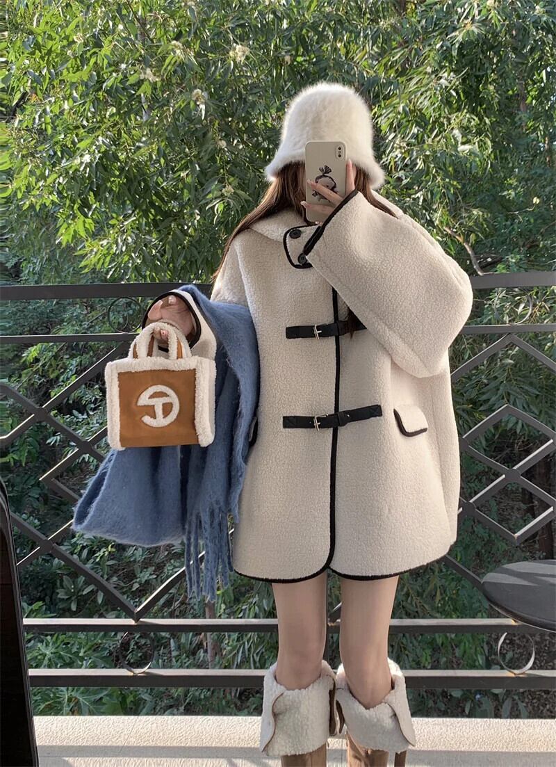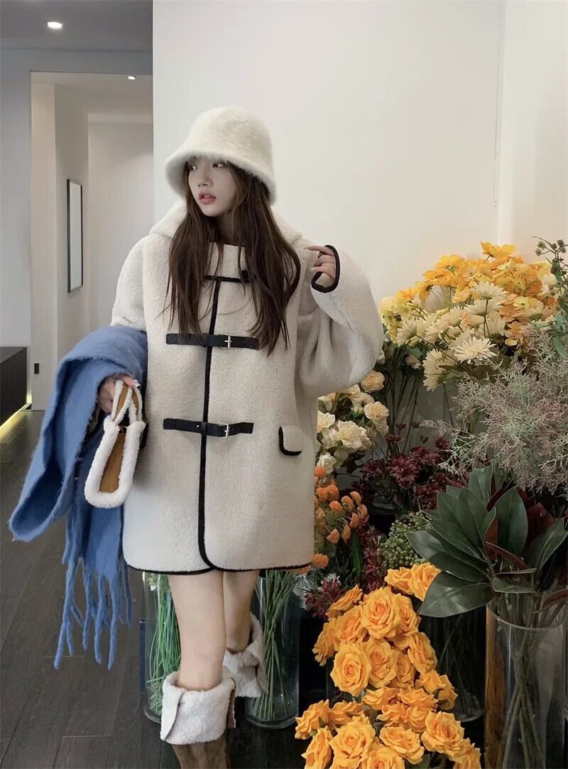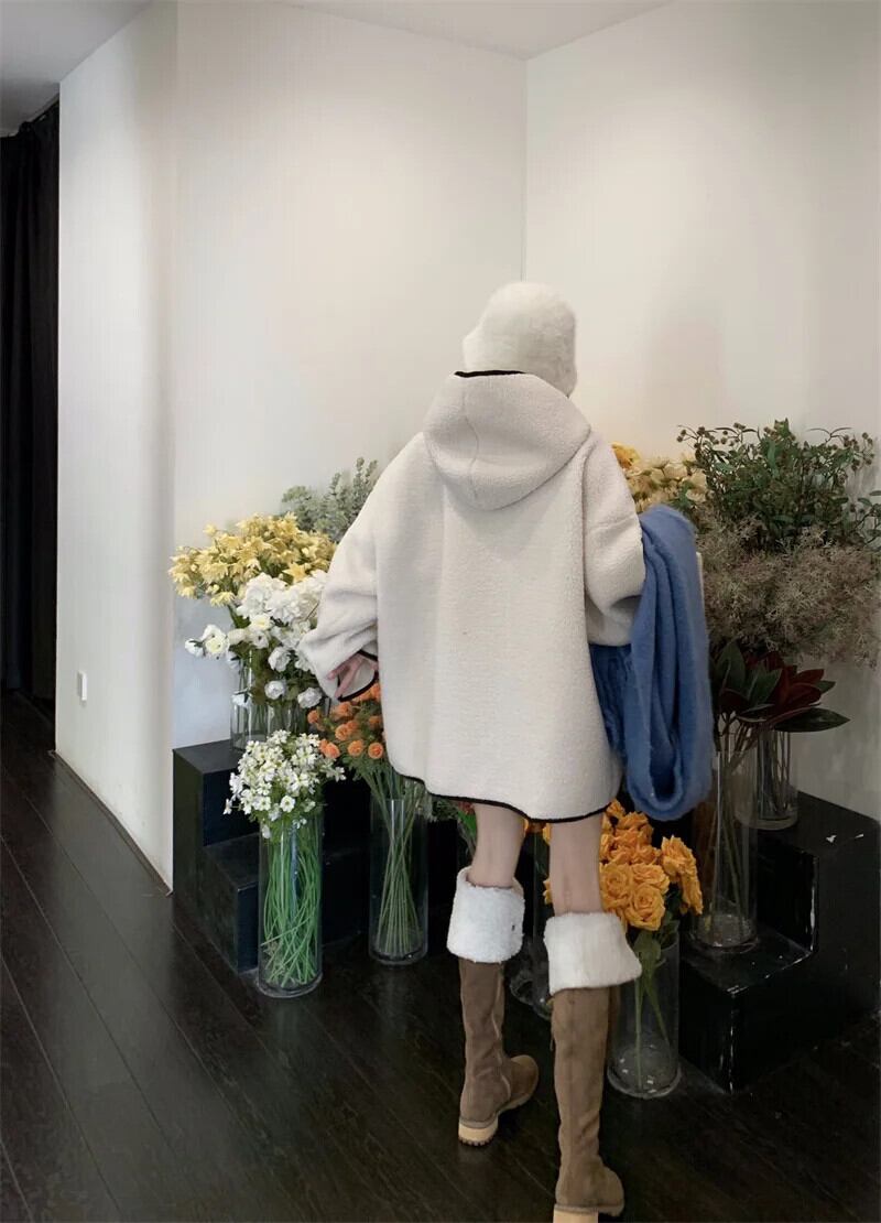 甘いホットガールラムウールコントラストフード付きコート秋/冬ミッドレングスシングルブレストルーズ厚いコート 大人ガーリー スウィート キュート カジュアル オータム 秋物 ウィンター 冬物