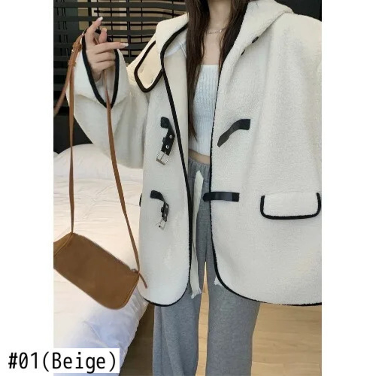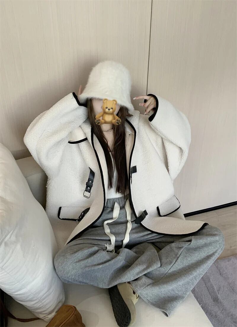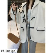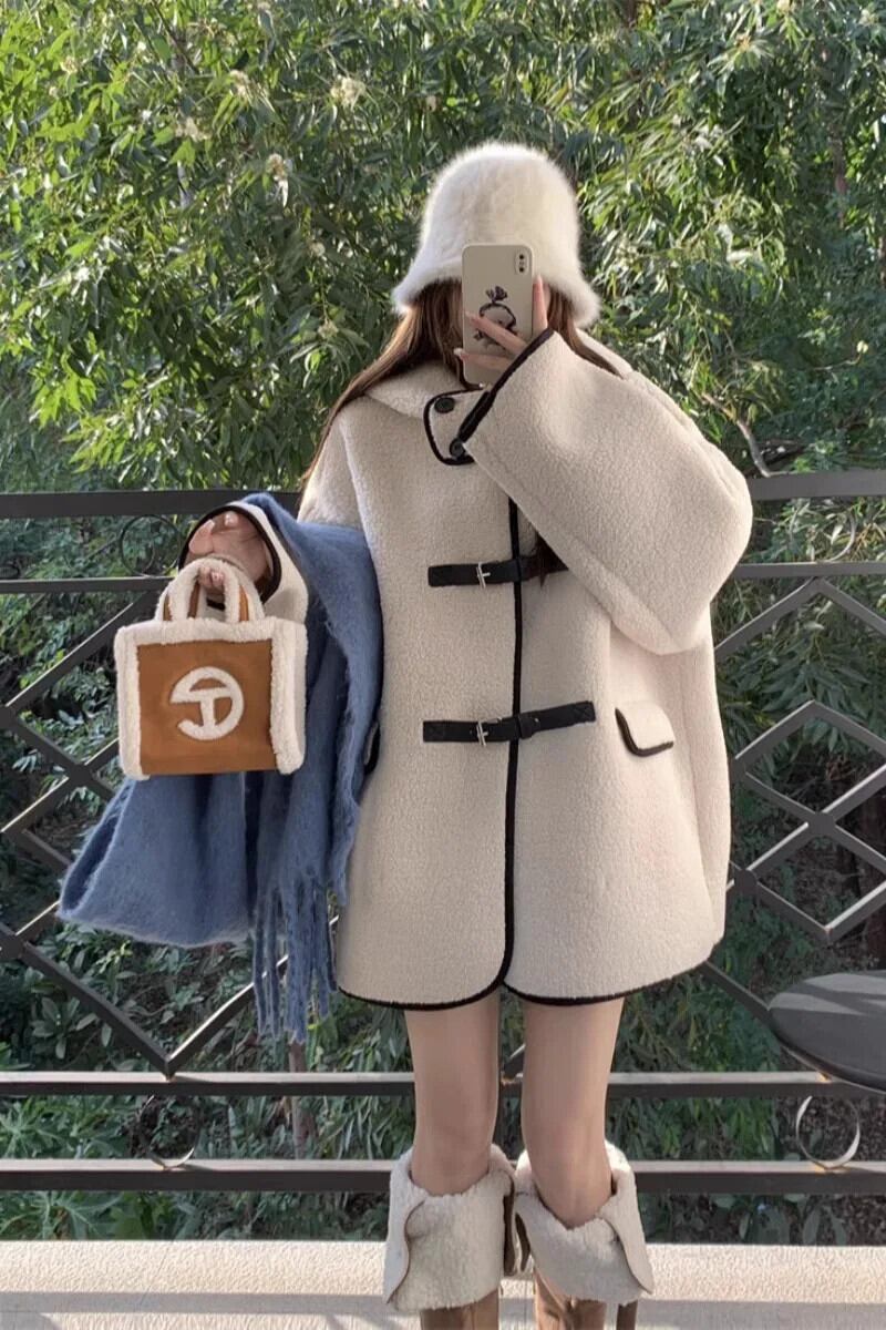 甘いホットガールラムウールコントラストフード付きコート秋/冬ミッドレングスシングルブレストルーズ厚いコート 大人ガーリー スウィート キュート カジュアル オータム 秋物 ウィンター 冬物