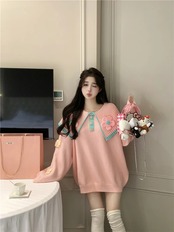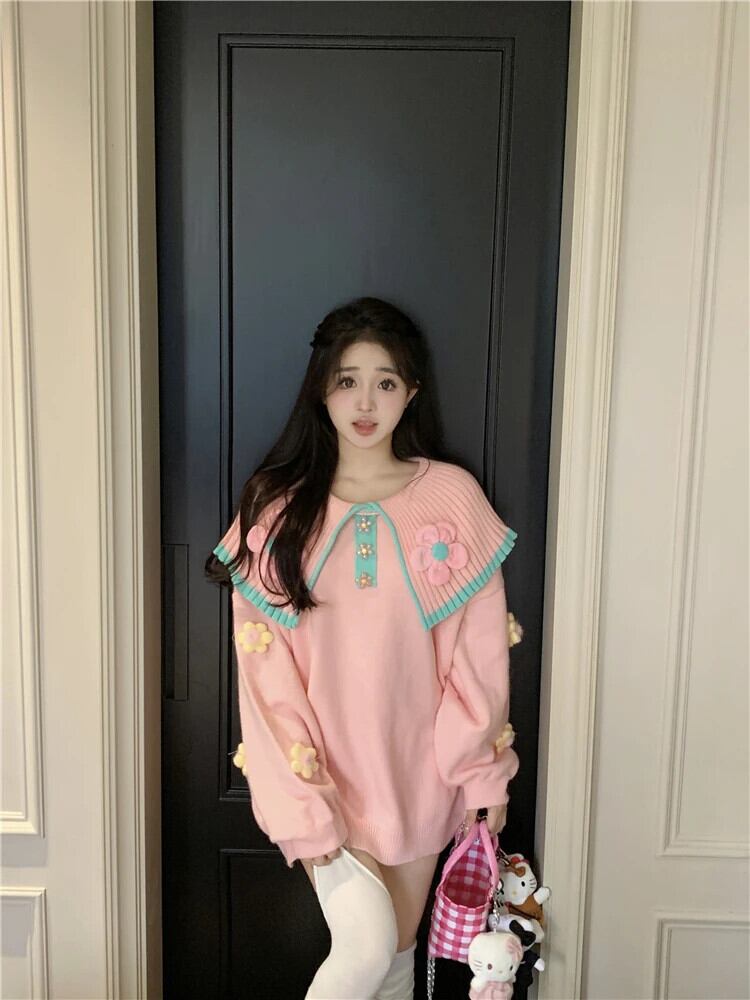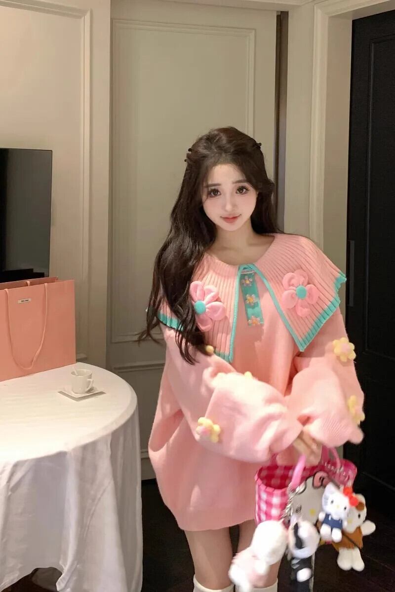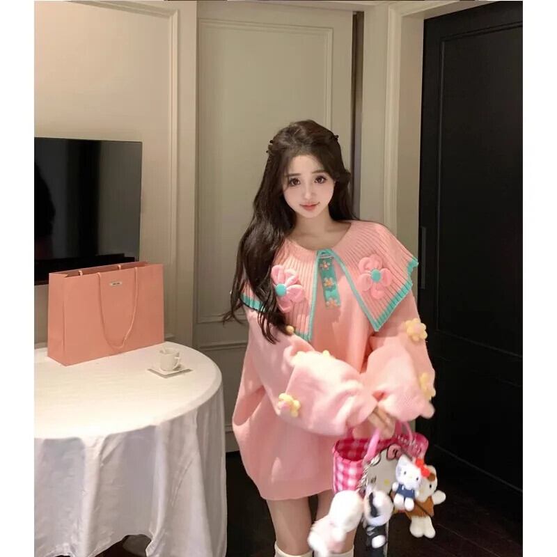 甘いホットガールズニットプルオーバー秋と冬ピーターパンカラー長袖セータートップ ロング 大人ガーリー スウィート キュート カジュアル オータム 秋物 ウィンター 冬物