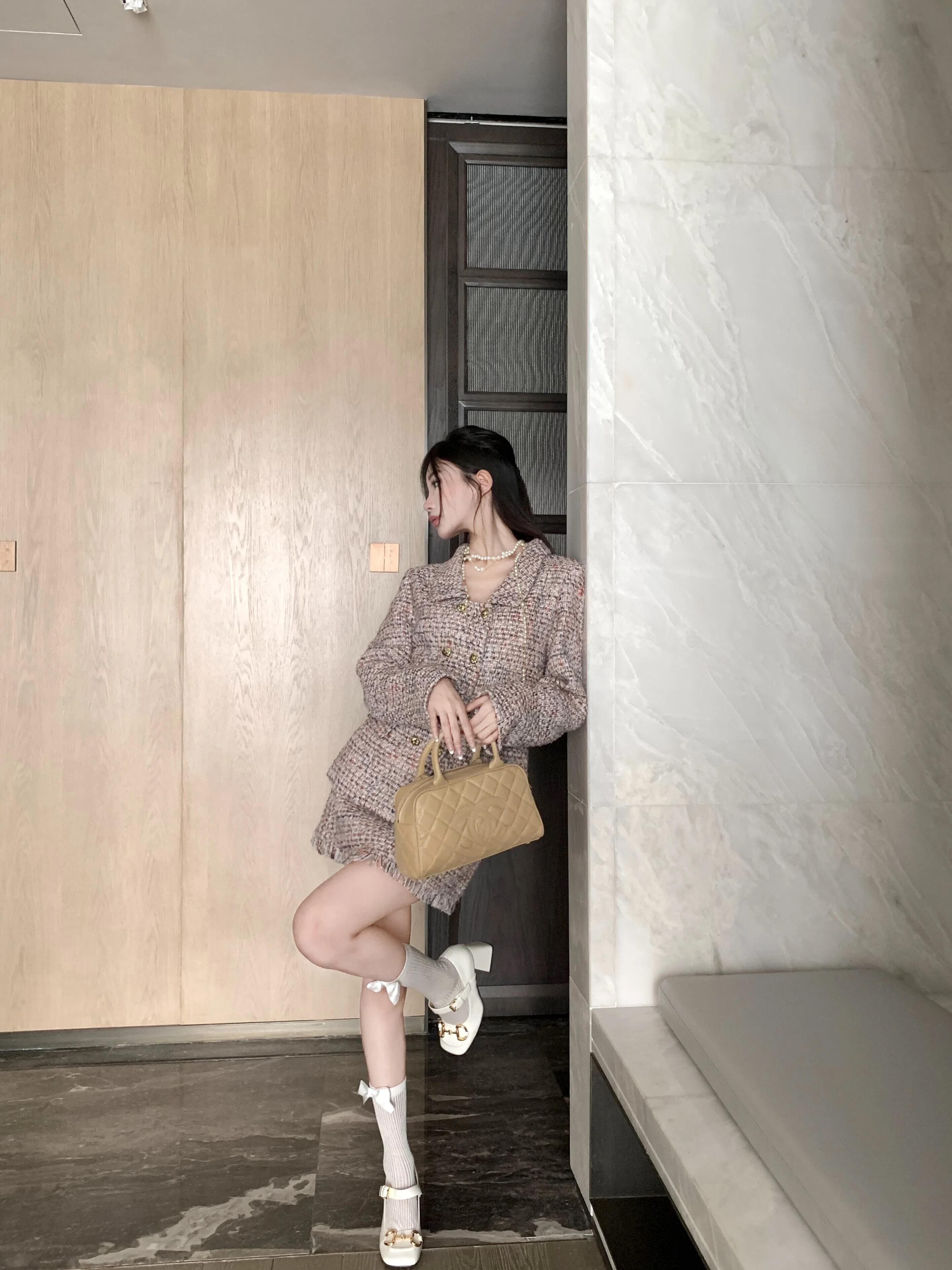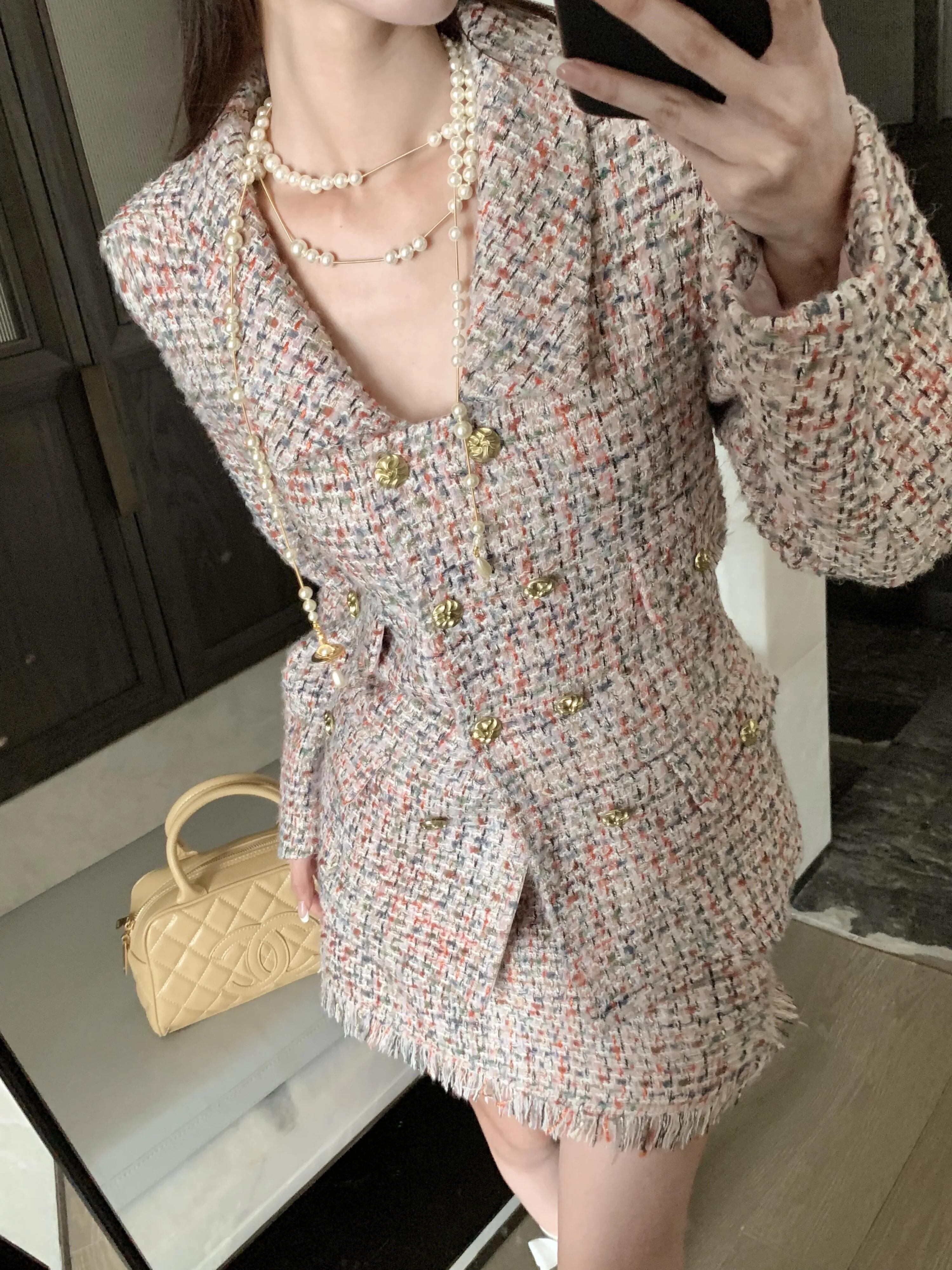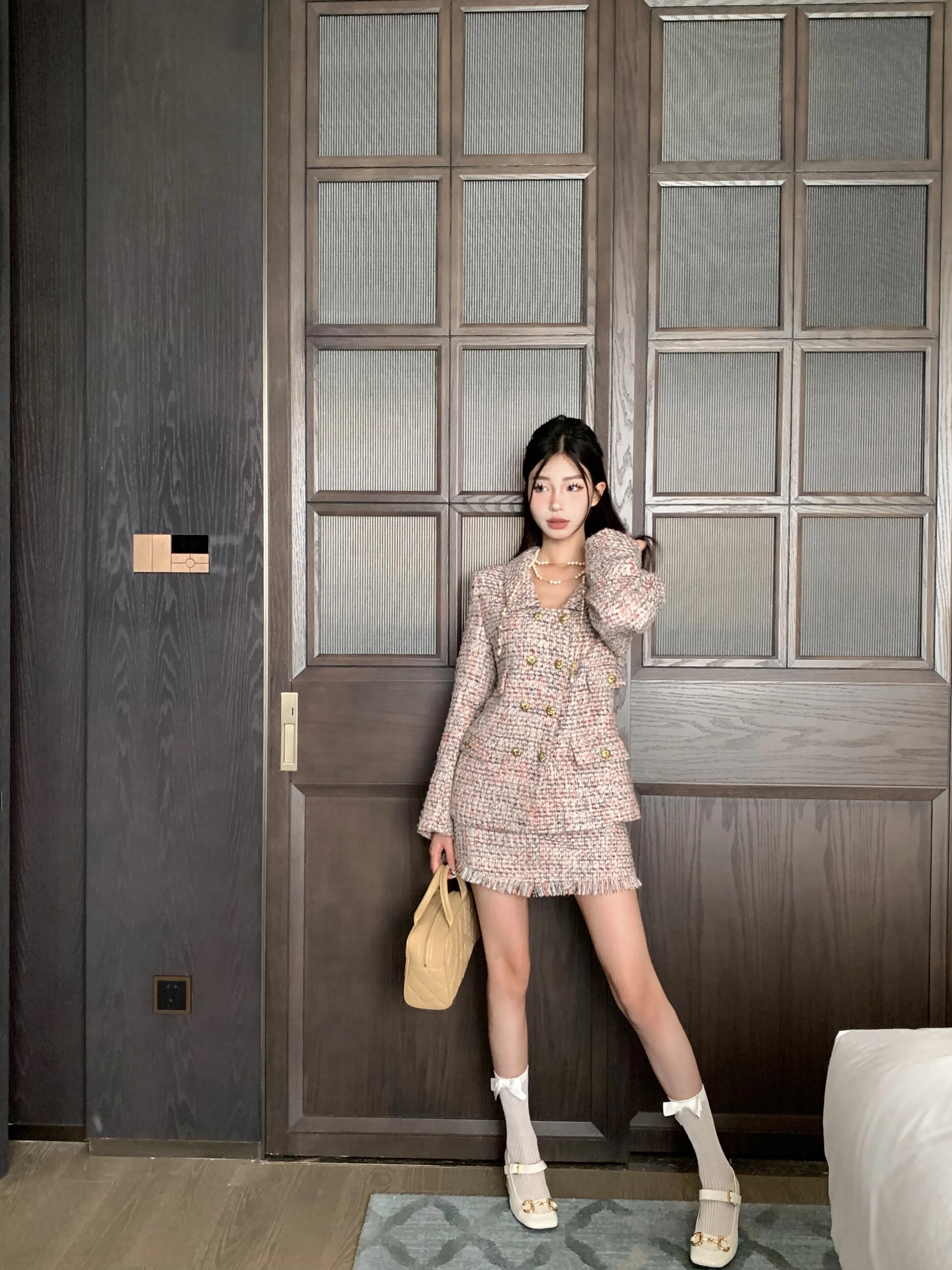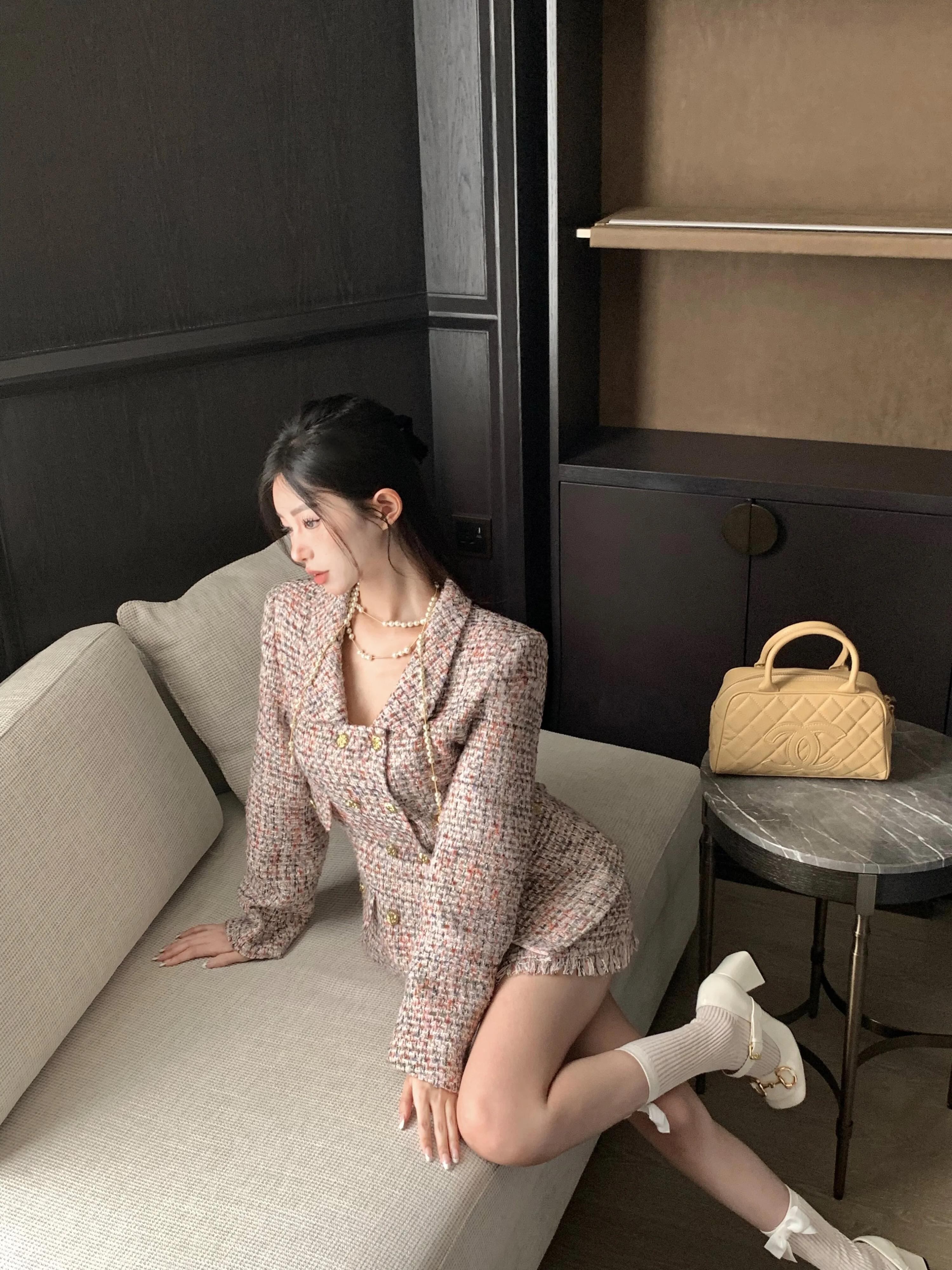 ホットガールメイラードスタイルスーツ秋ターンダウン襟ダブルブレストショートコートミニスカートツーピースセット オータム 秋物