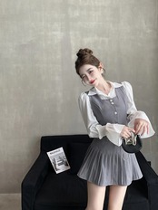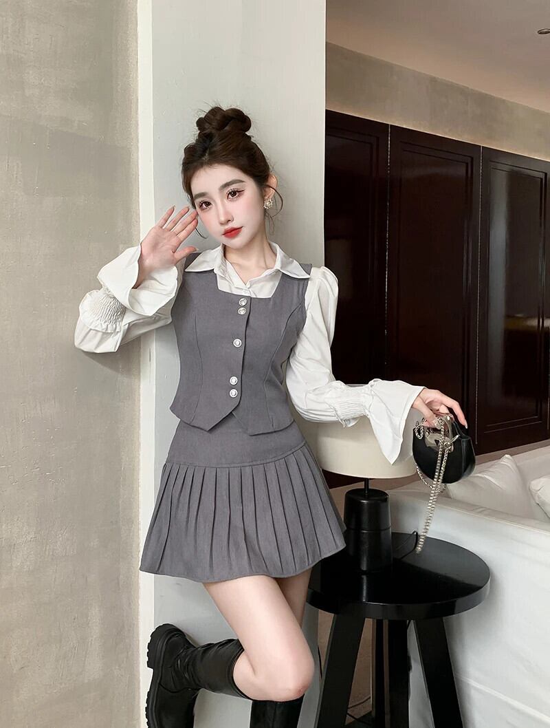 甘いホットガールスーツ秋ショートシャツスクエアカラーベストコートウエストプリーツスカート 3 点セット 大人ガーリー スウィート キュート カジュアル オータム 秋物 スクウェア
