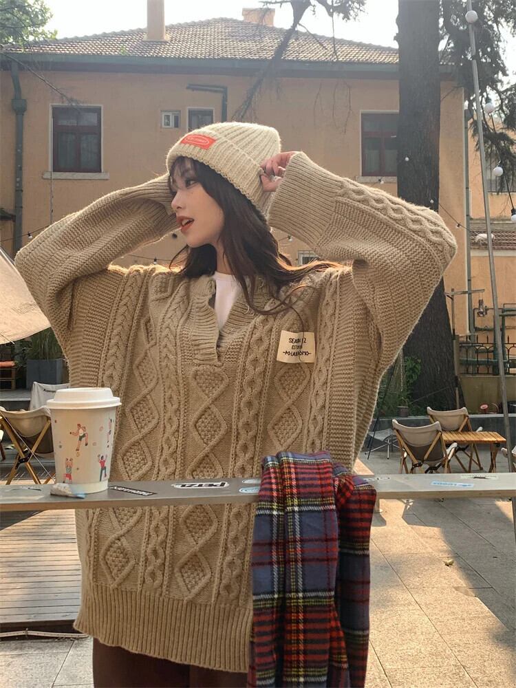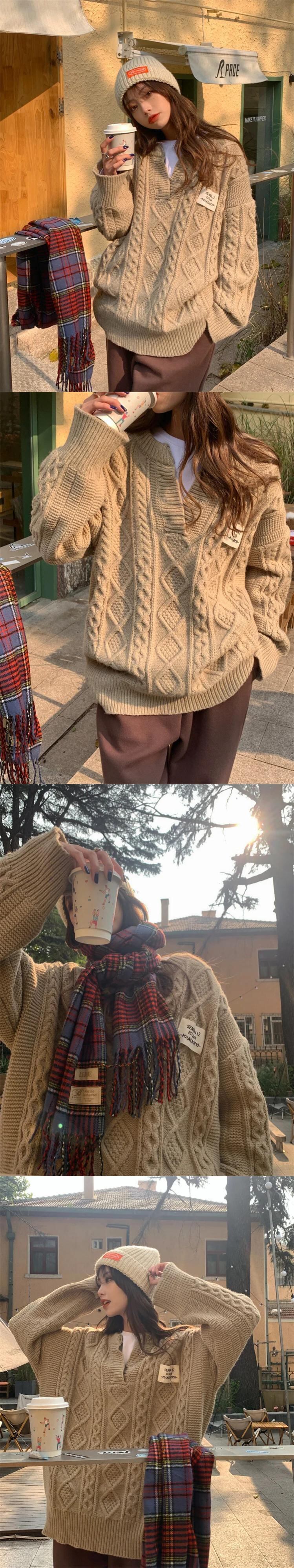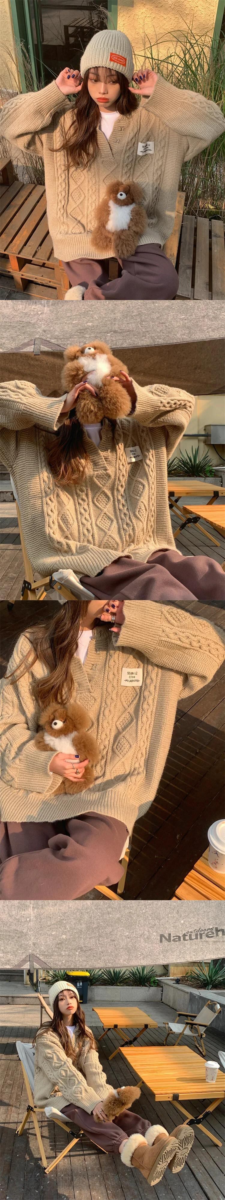 Sweet Girl V ネックツイスト長袖グリーンセーター秋ルーズパッチニットプルオーバー ロング 大人ガーリー スウィート キュート カジュアル オータム 秋物 Vネック