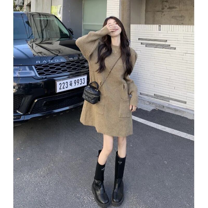 甘いホットガールバブルスリーブニットドレス秋と冬ラウンドネックルーズベルトセーター 大人ガーリー スウィート キュート カジュアル オータム 秋物 ウィンター 冬物 ハーネス Oネック